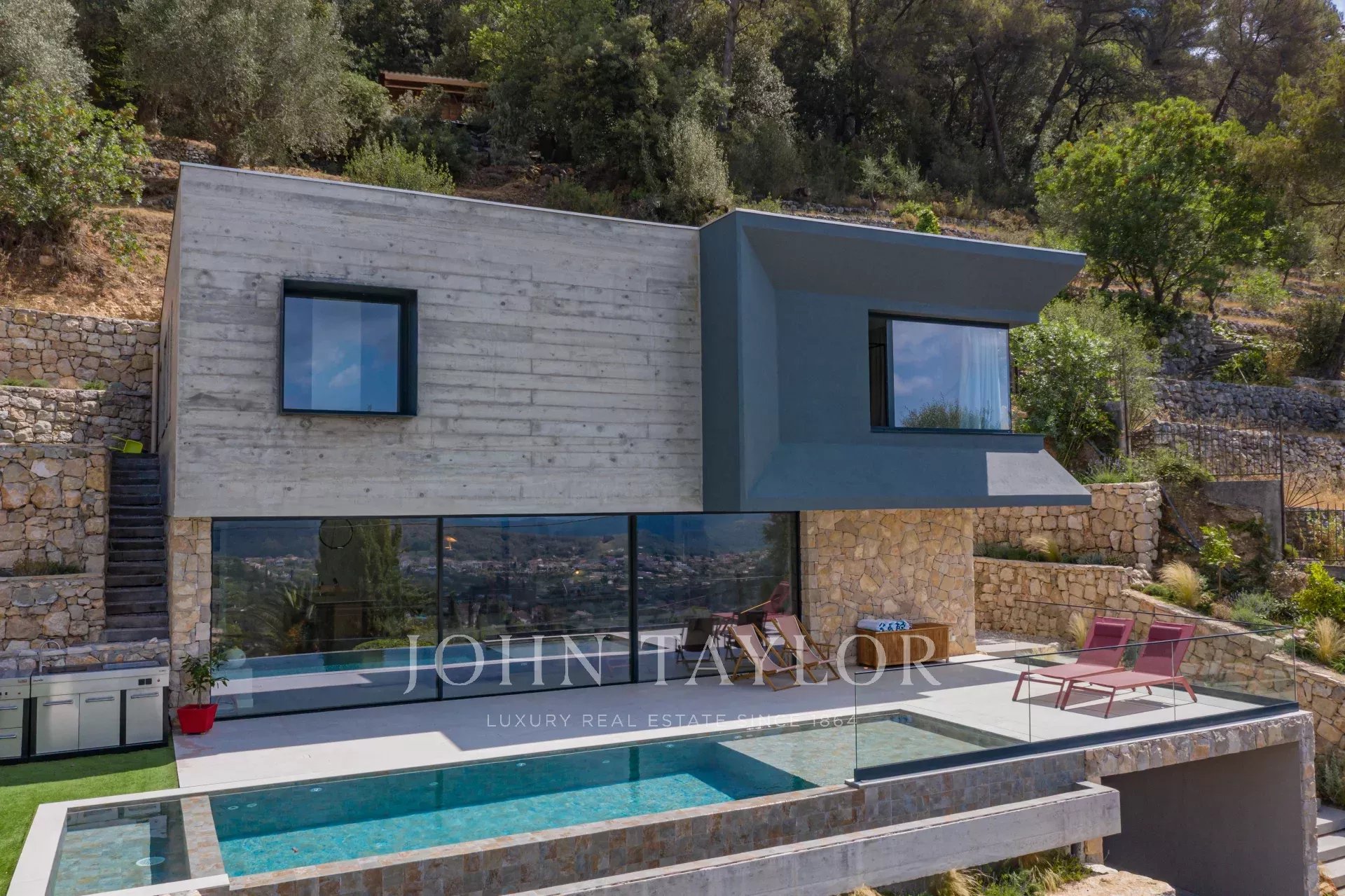 Objevte tento přepychový dům o rozloze 220 m² navržený architektem v kopcích nad Saint-Paul de Vence.