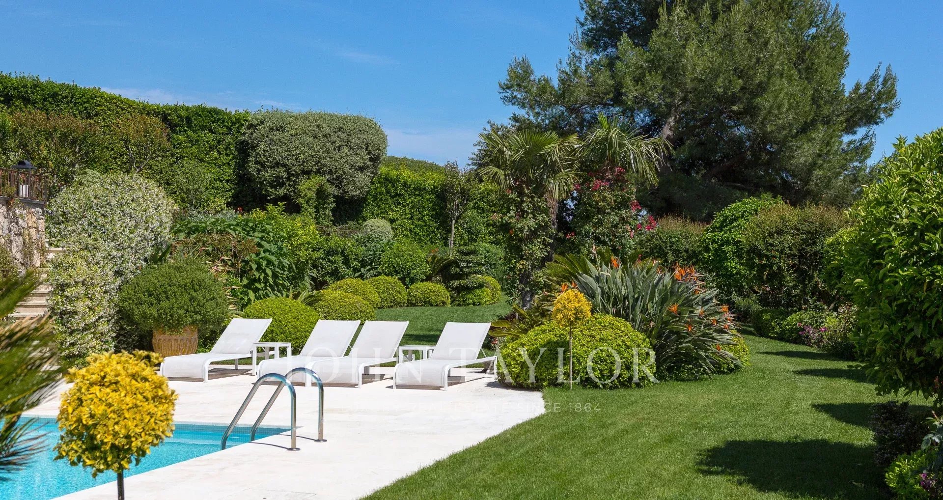 Vila se rozkládá v krásně udržované zahradě a je obklopena středomořskými stromy a svěží zelení.