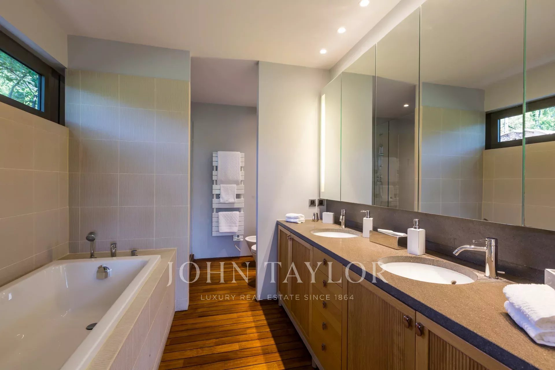 Tato vila je orientována na jih a díky mnoha oknům, která se otevírají ven, si užívá maximum světla. Výhled na stromy a designový prostor bazénu se slanou vodou (který lze vyhřívat) zajišťují klid a pohodu. Hřiště na petanque, trampolína a dětský koutek se jistě postarají o nezapomenutelný pobyt.