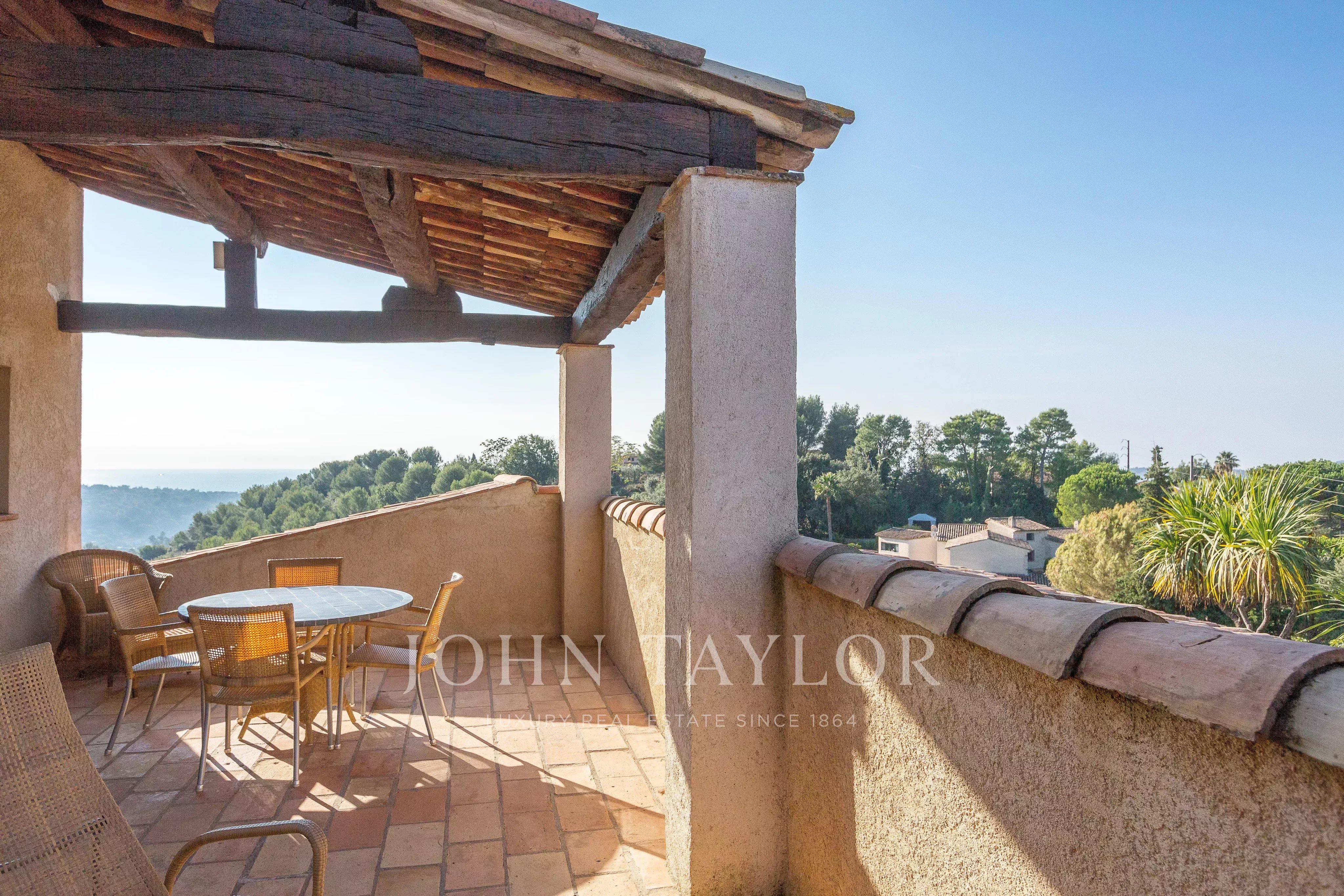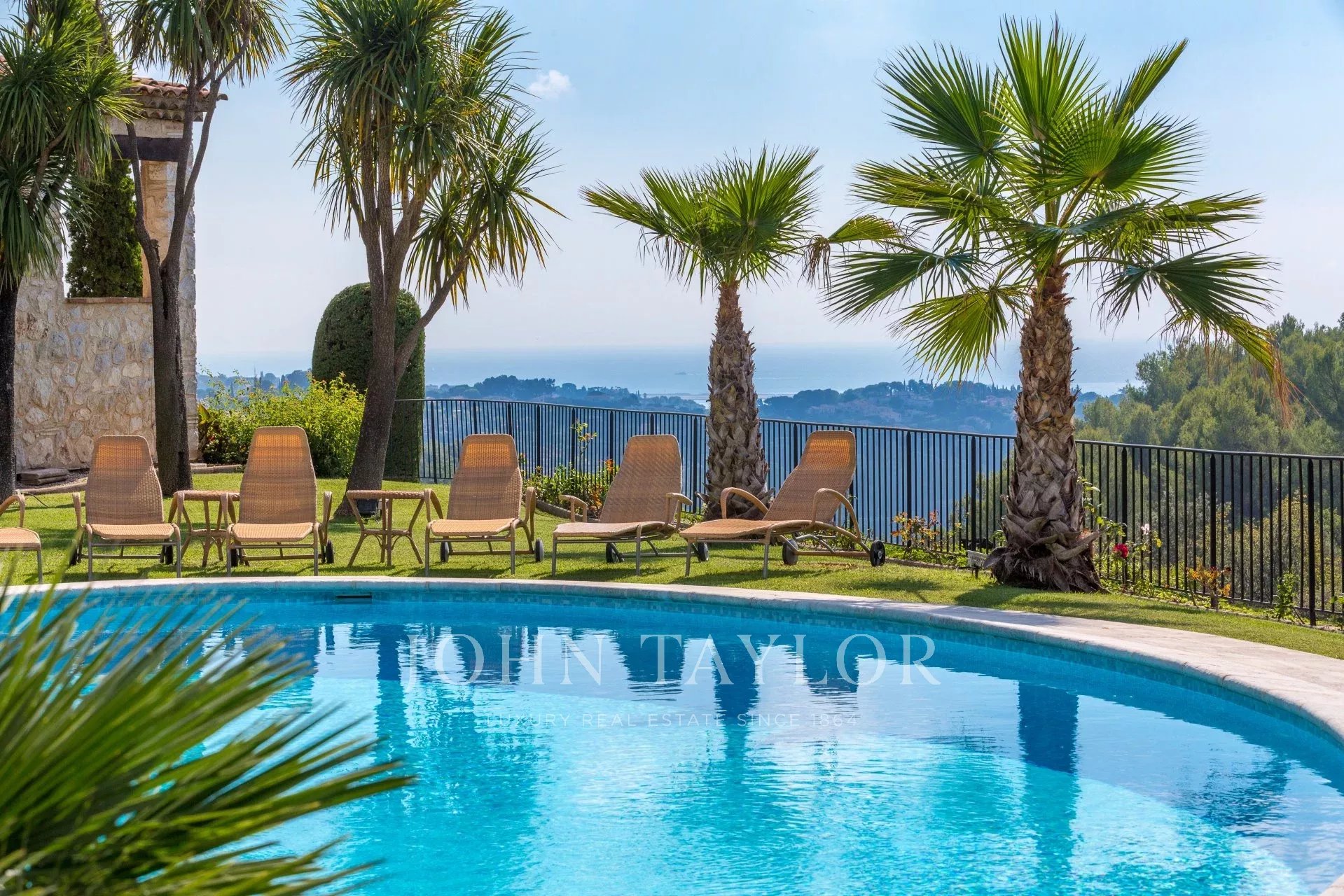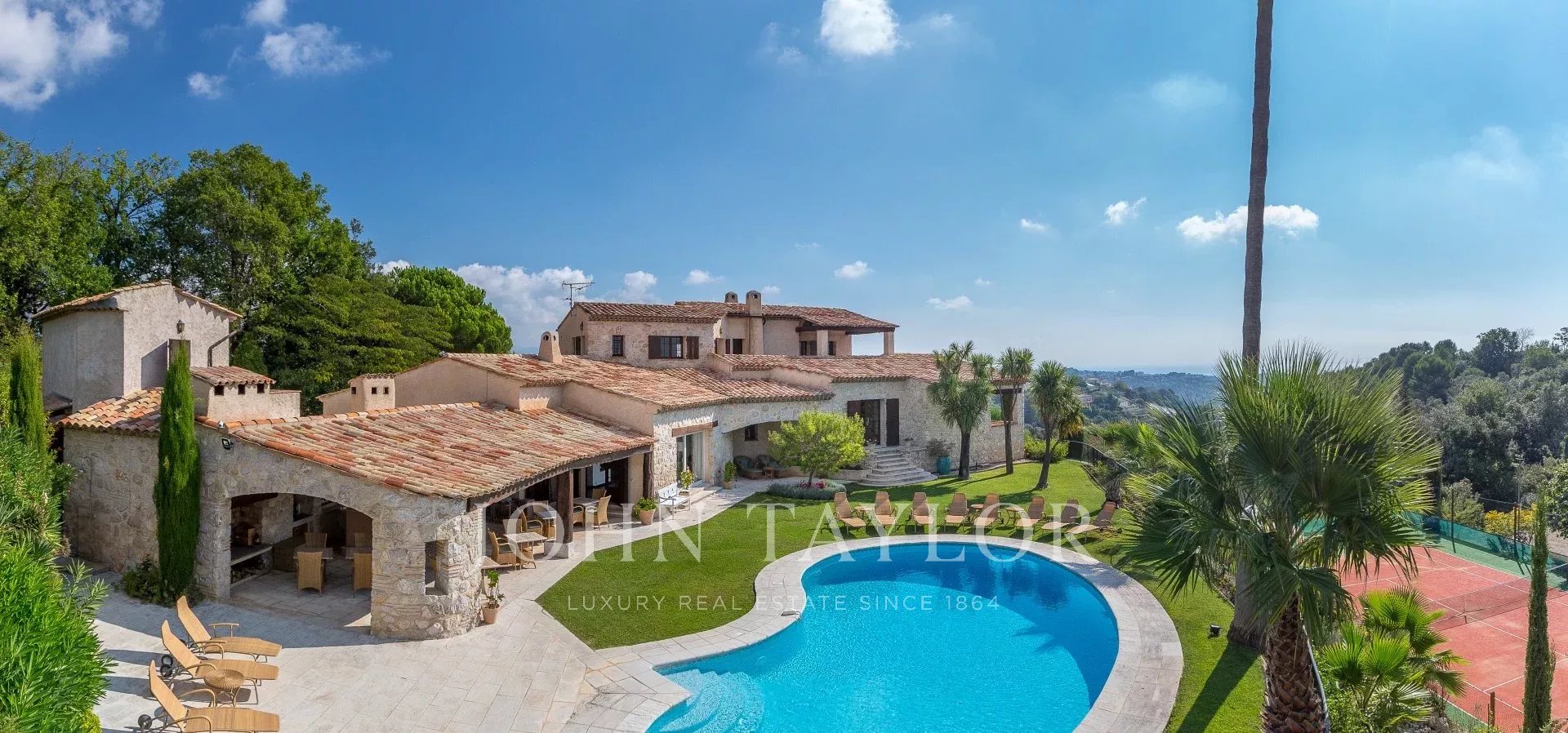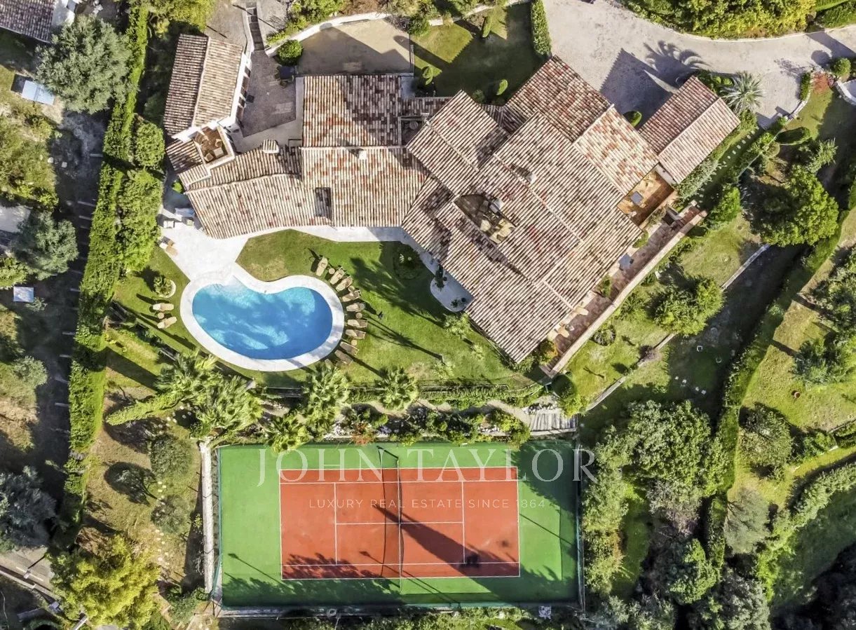 Tato nádherná kamenná nemovitost o rozloze 560 m², která se nachází v jedné z nejvyhledávanějších rezidenčních oblastí Saint-Paul-de-Vence, se rozkládá na pozemku o rozloze 6 400 m² a nabízí nerušený výhled na moře a okolní kopce.