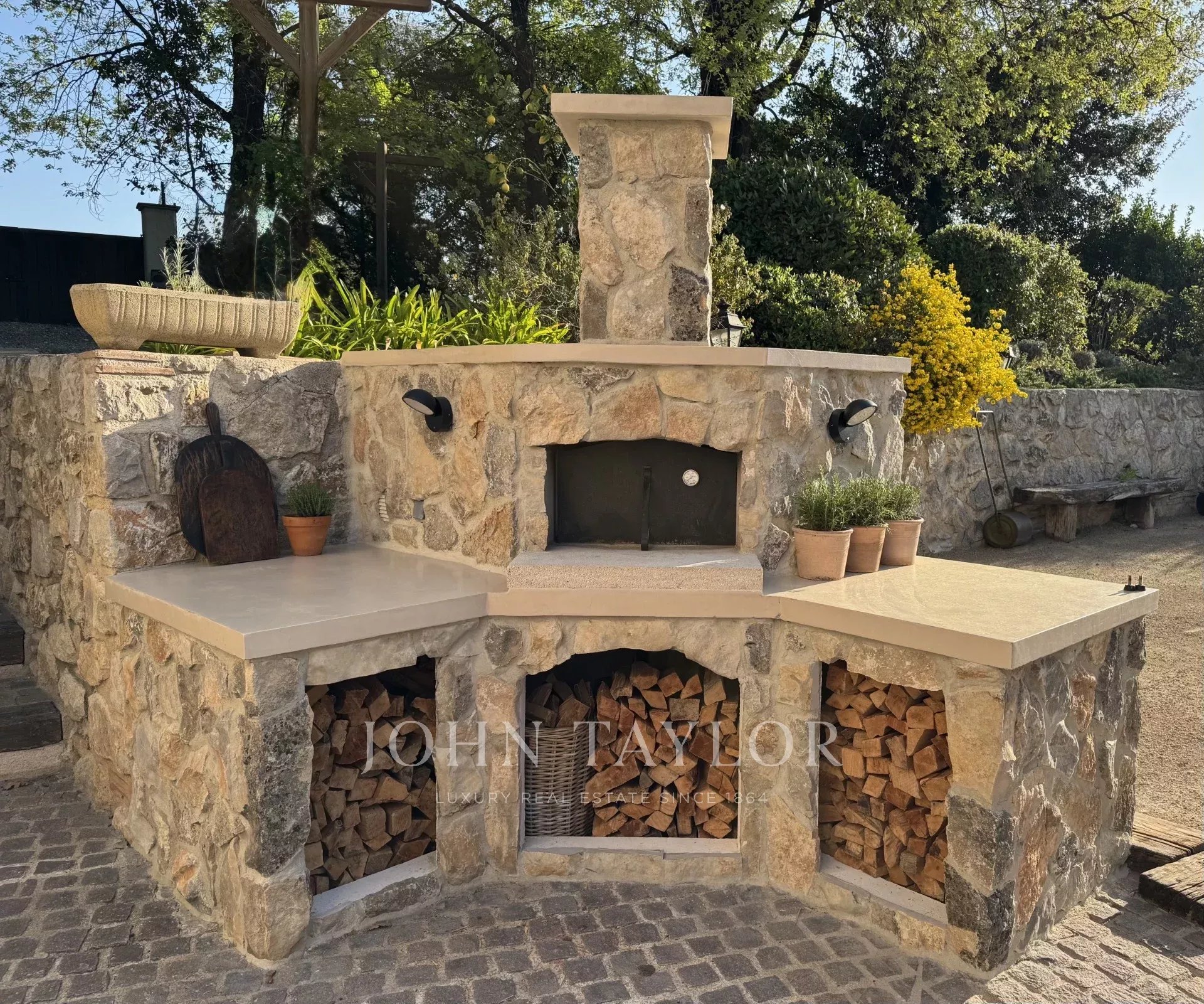 - Velká terasa, ideální pro letní stravování, vybavená venkovním krbem, grilem a pecí na pizzu, ideální pro setkávání s rodinou a přáteli.