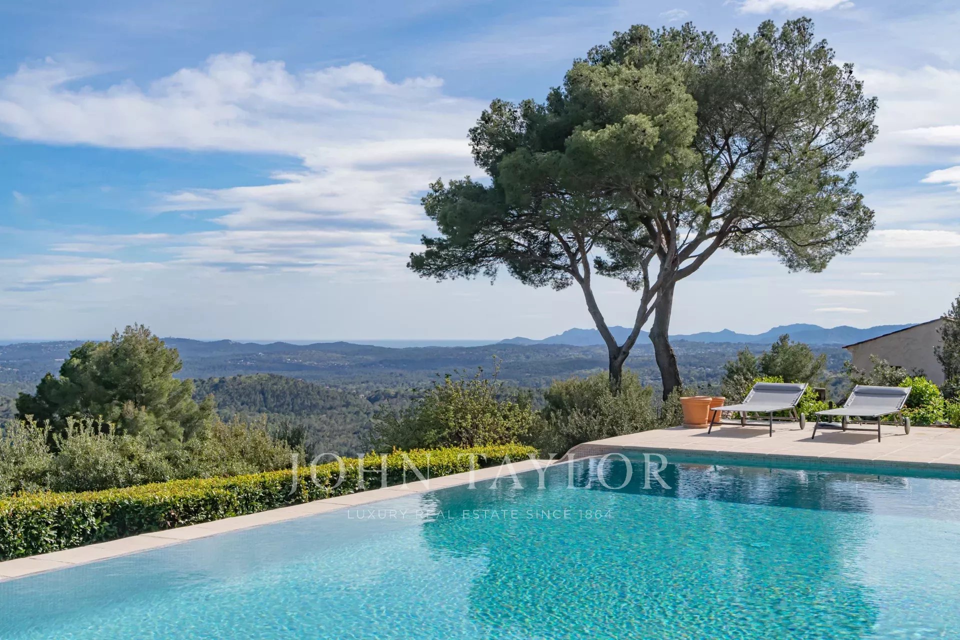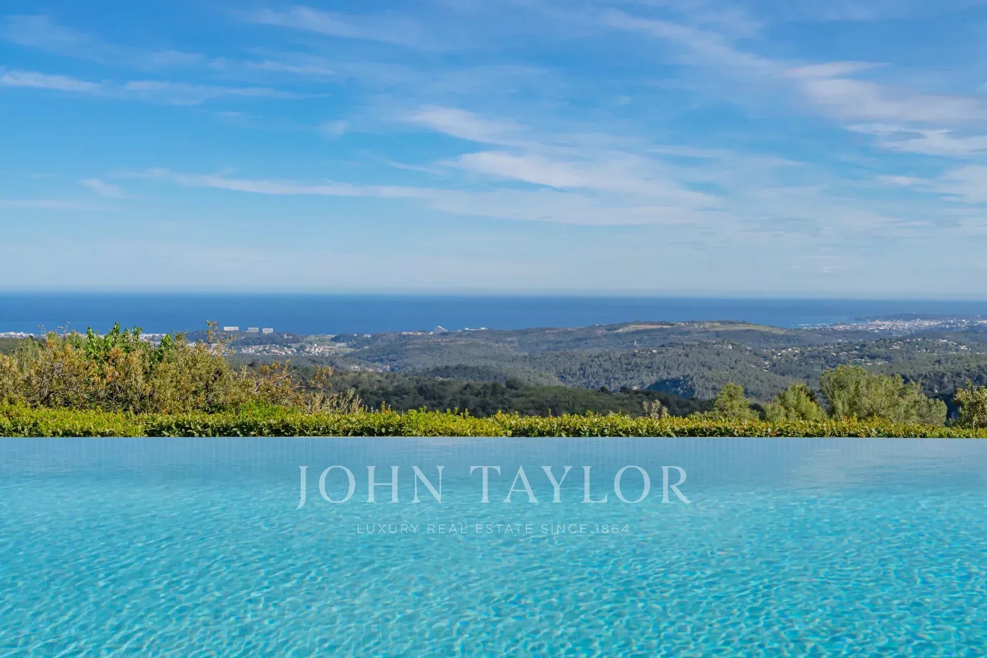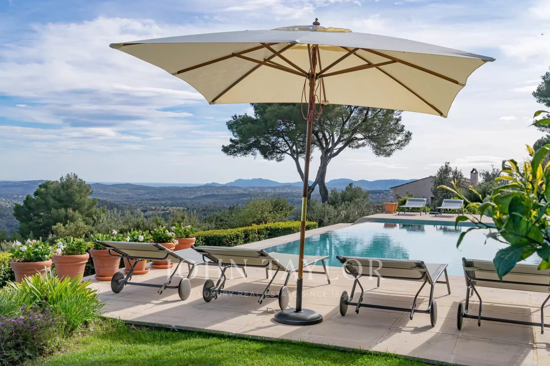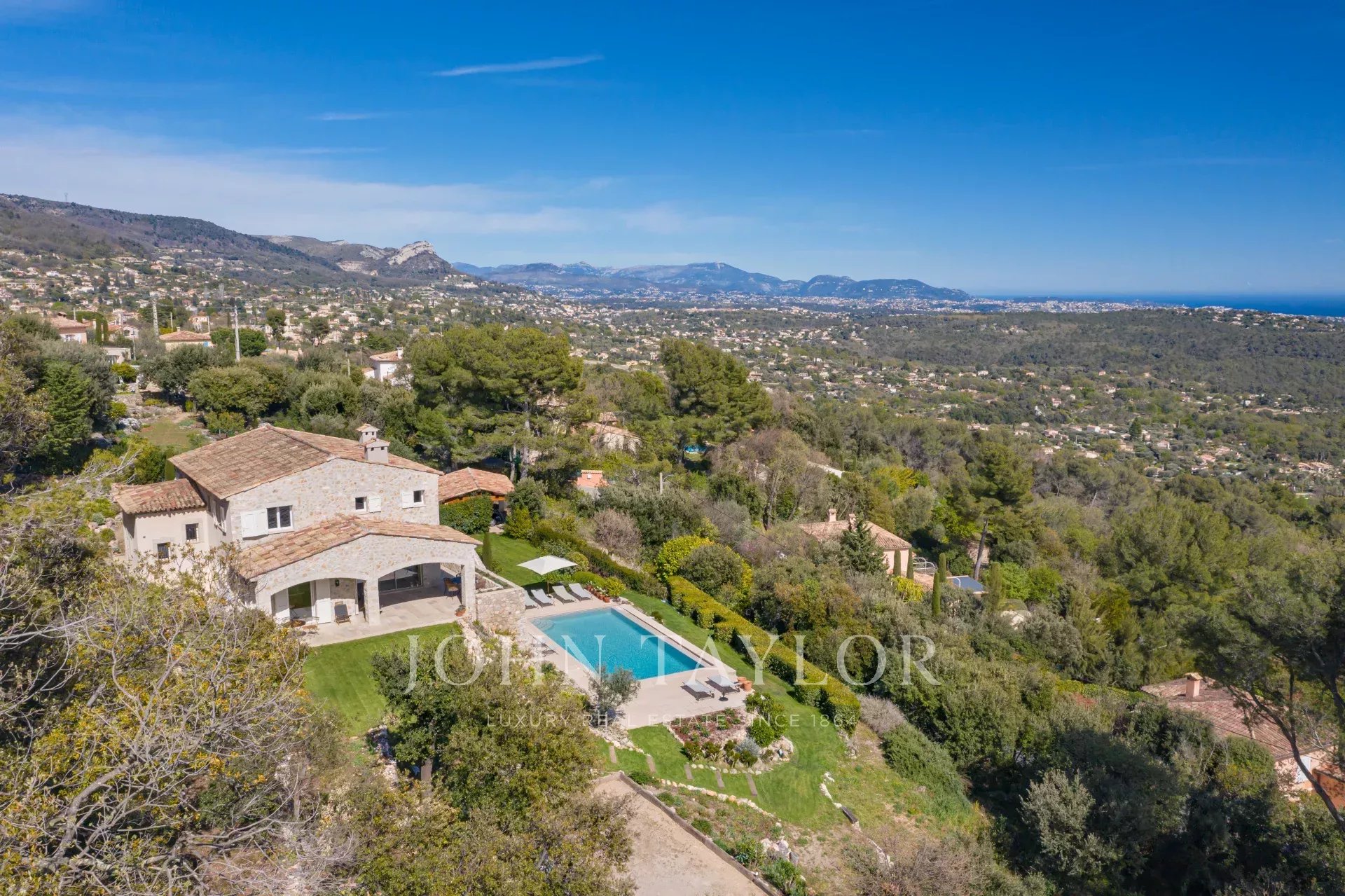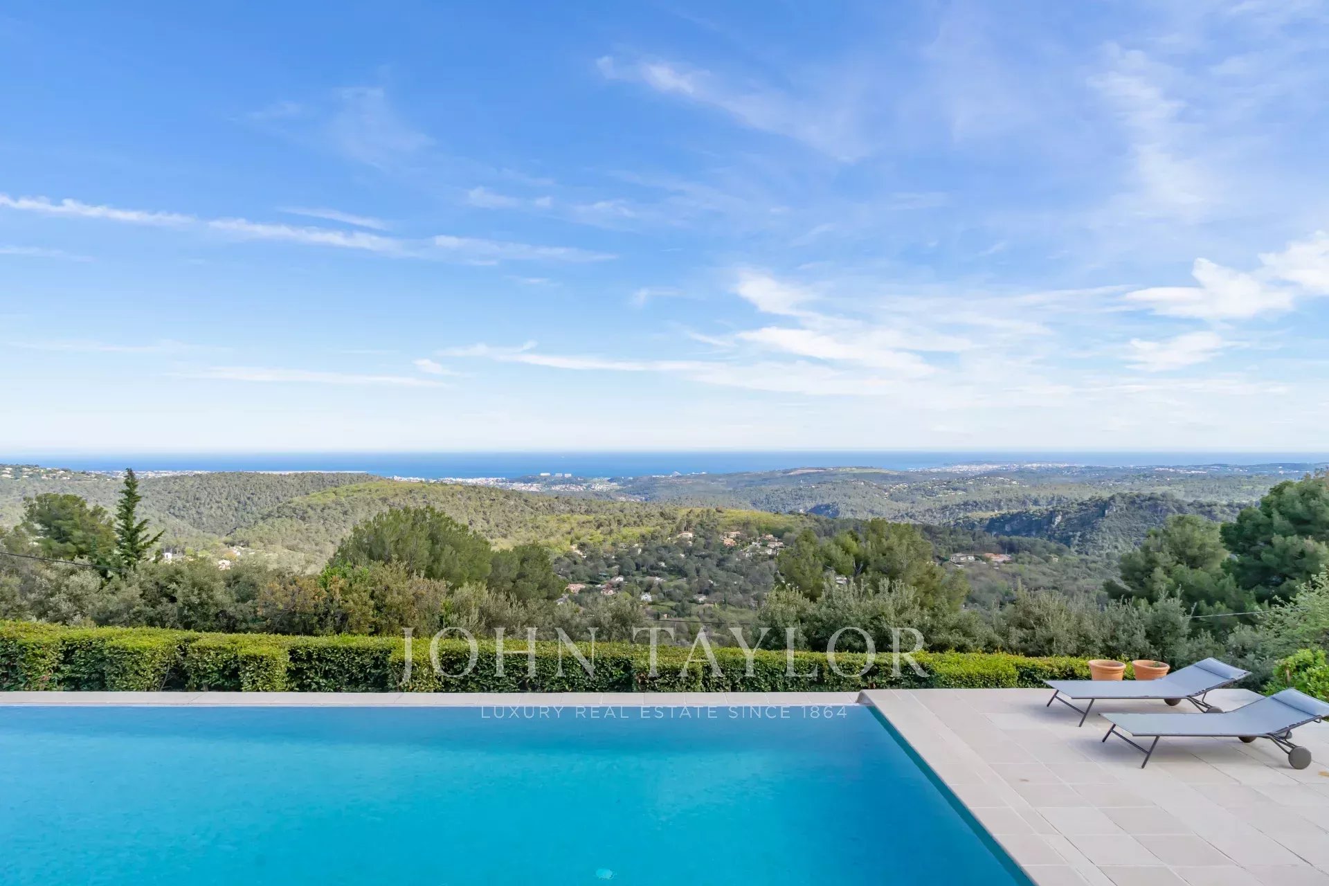 V Tourrettes sur Loup, s nádherným výhledem na moře a okolní krajinu, krásná nově postavená nemovitost o obytné ploše 320 m² na pozemku o rozloze 4 000 m² s nekonečným bazénem.