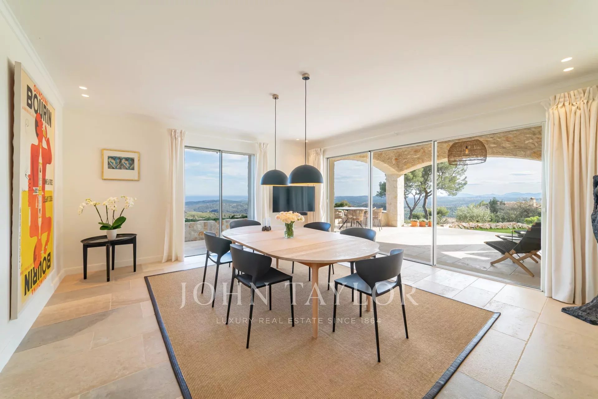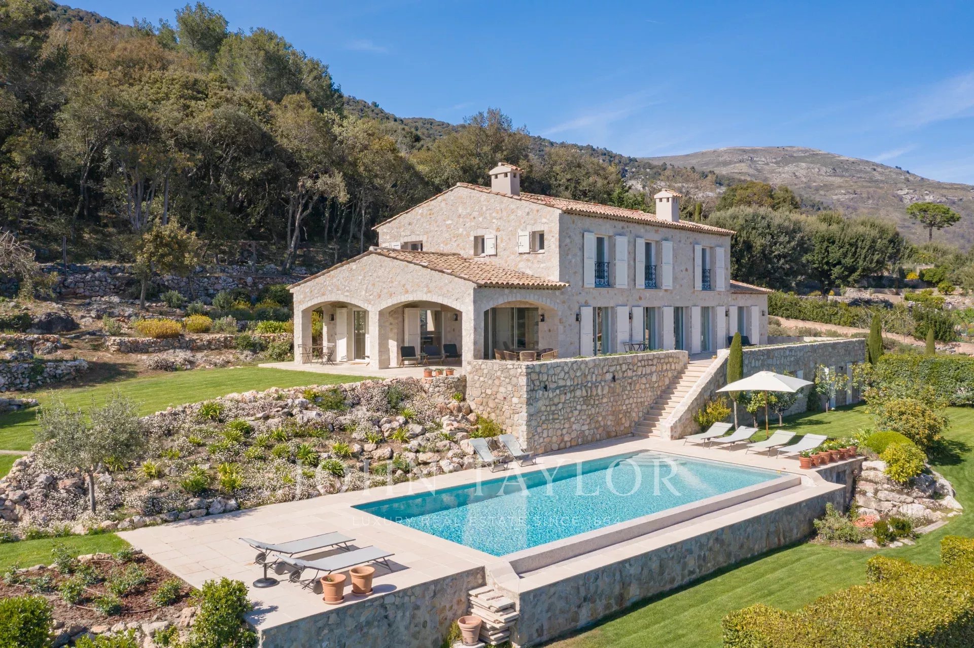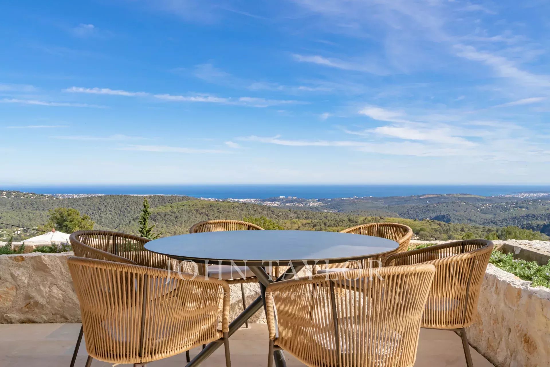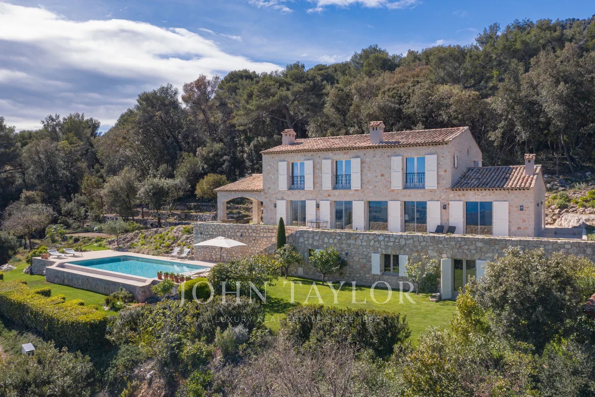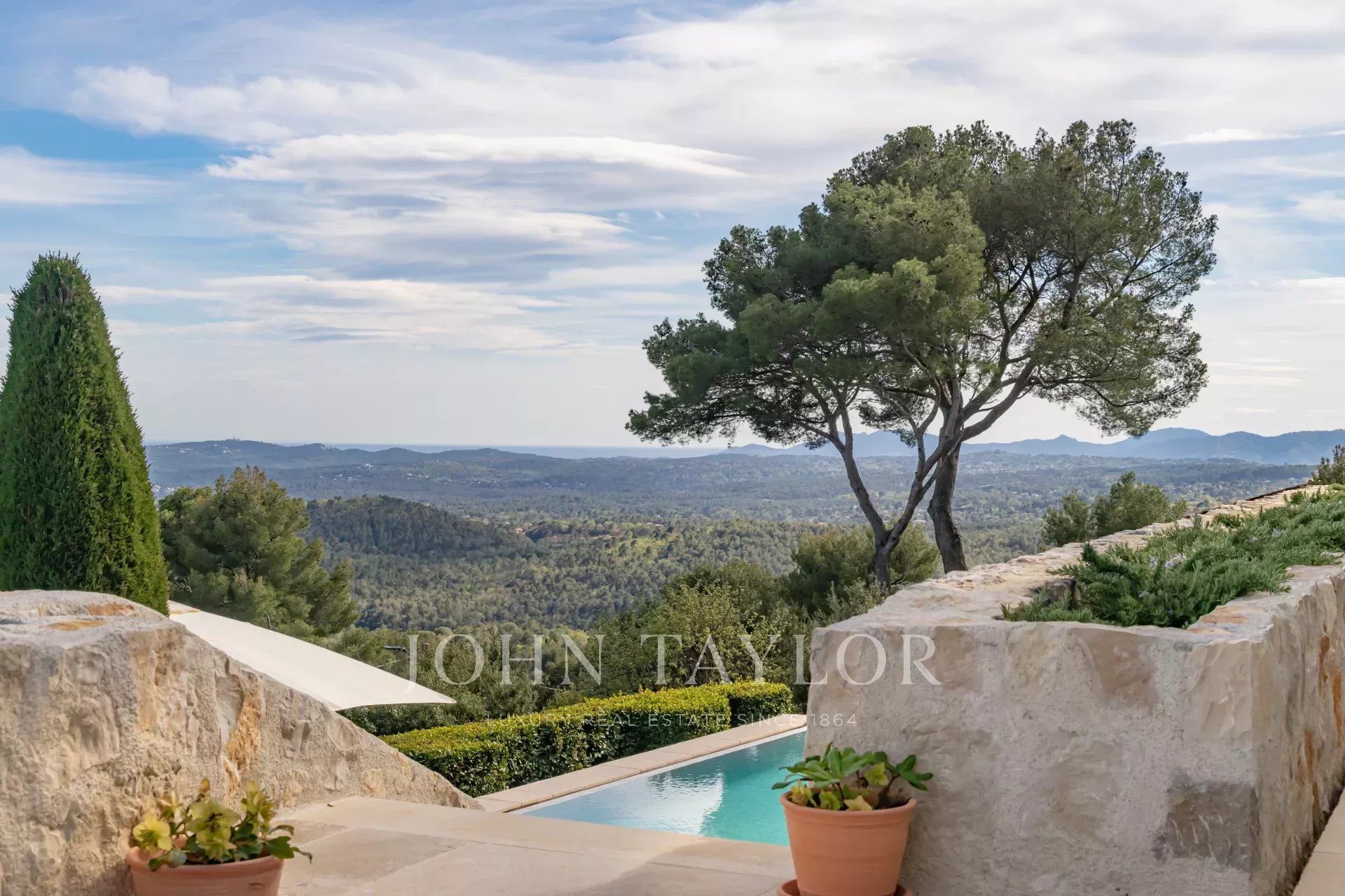 V Tourrettes sur Loup, s nádherným výhledem na moře a okolní krajinu, krásná nově postavená nemovitost o obytné ploše 320 m² na pozemku o rozloze 4 000 m² s nekonečným bazénem.
