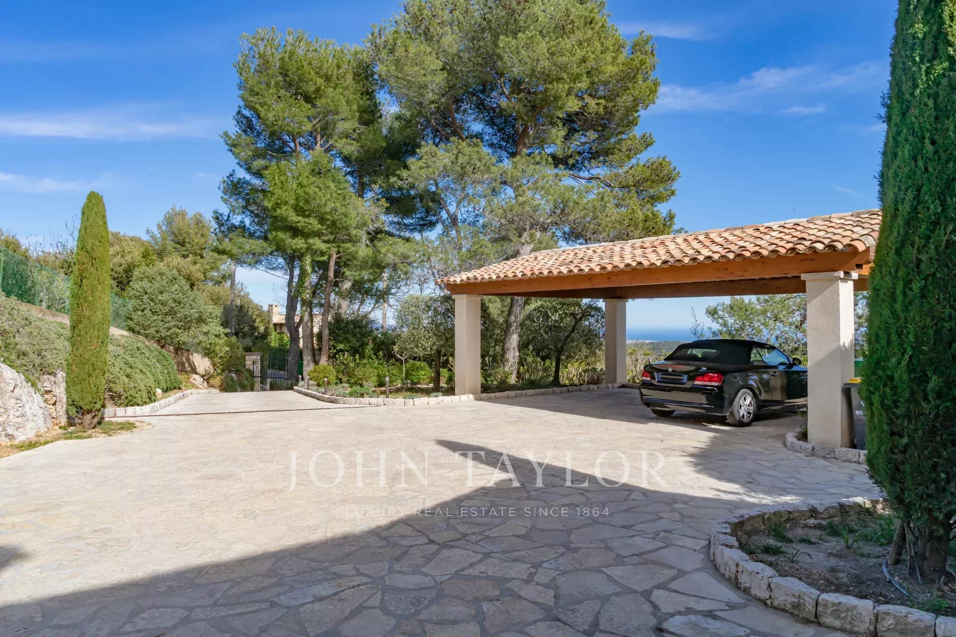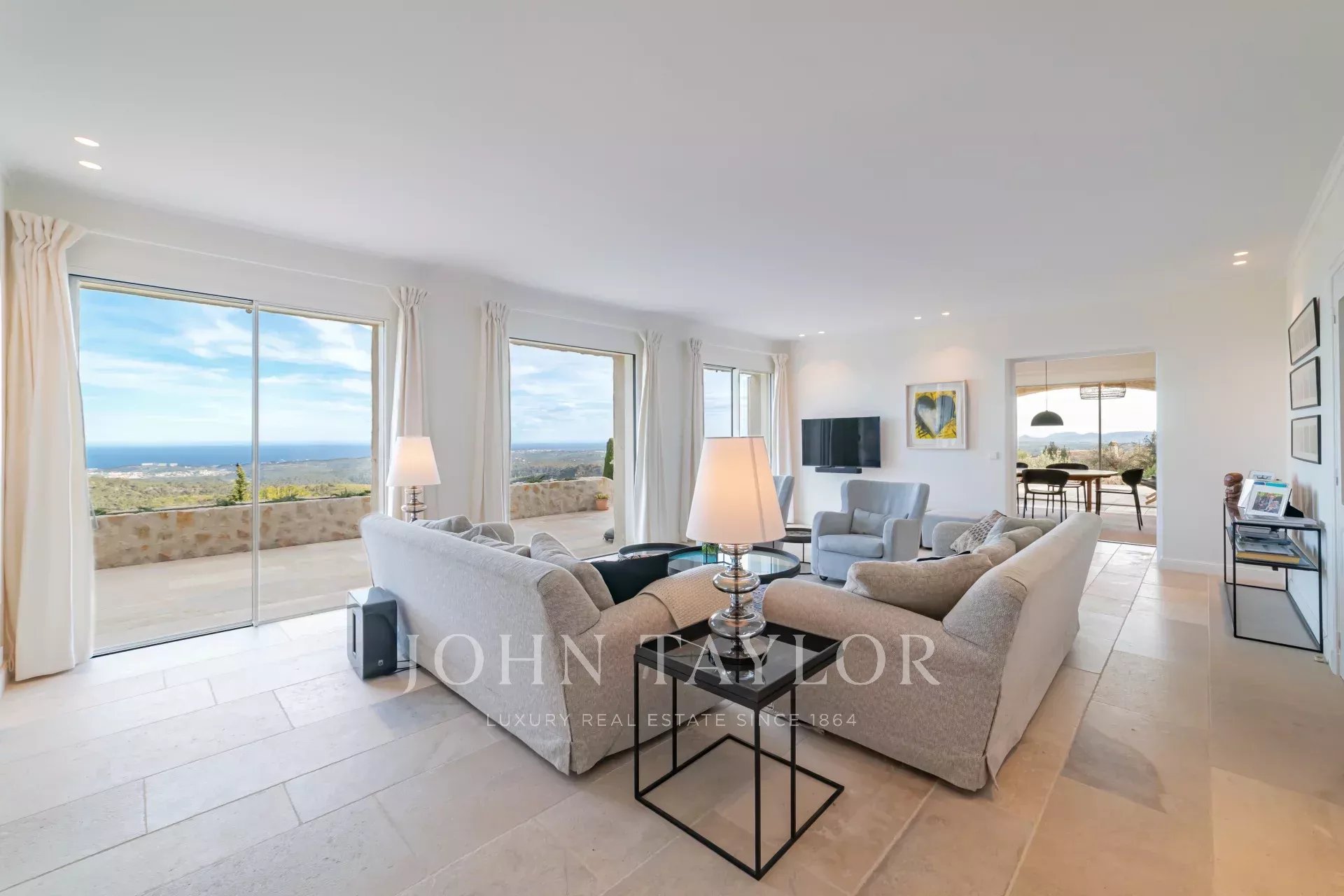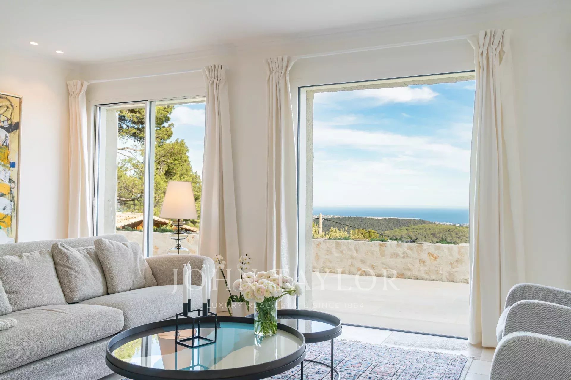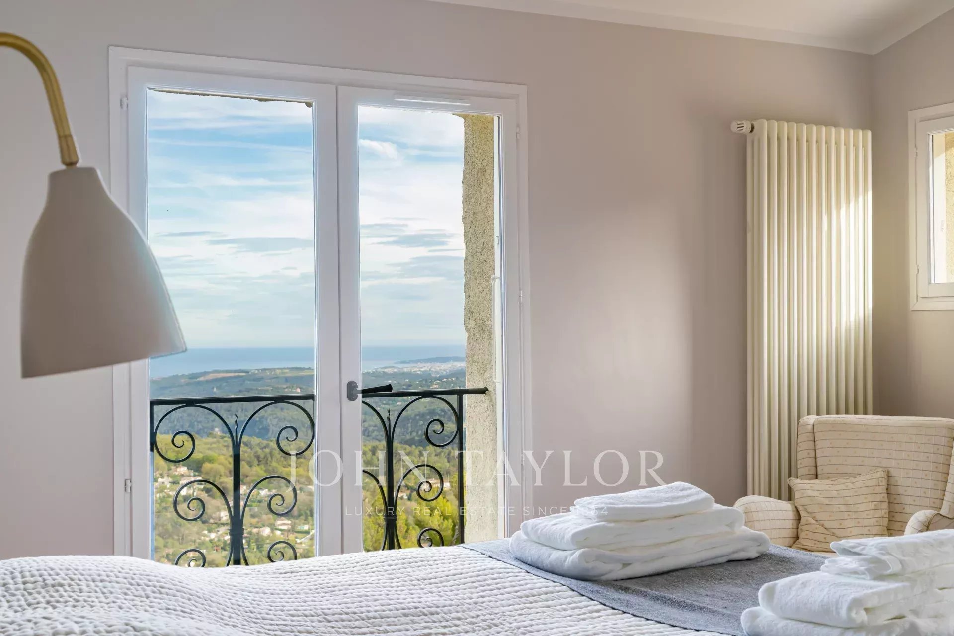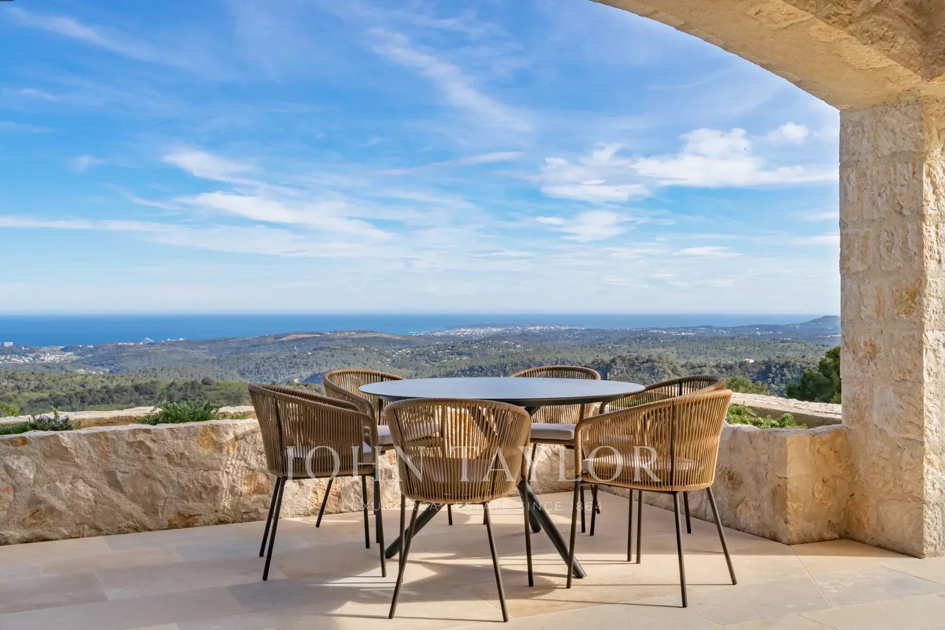 V Tourrettes sur Loup, s nádherným výhledem na moře a okolní krajinu, krásná nově postavená nemovitost o obytné ploše 320 m² na pozemku o rozloze 4 000 m² s nekonečným bazénem.