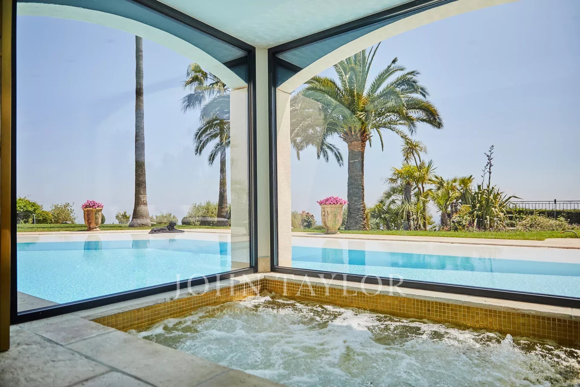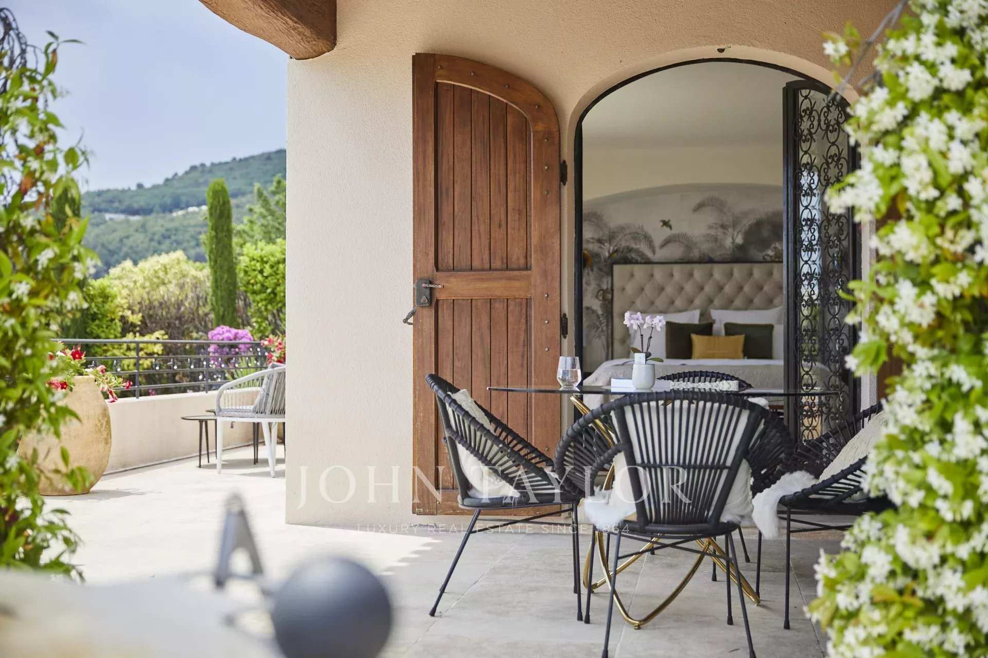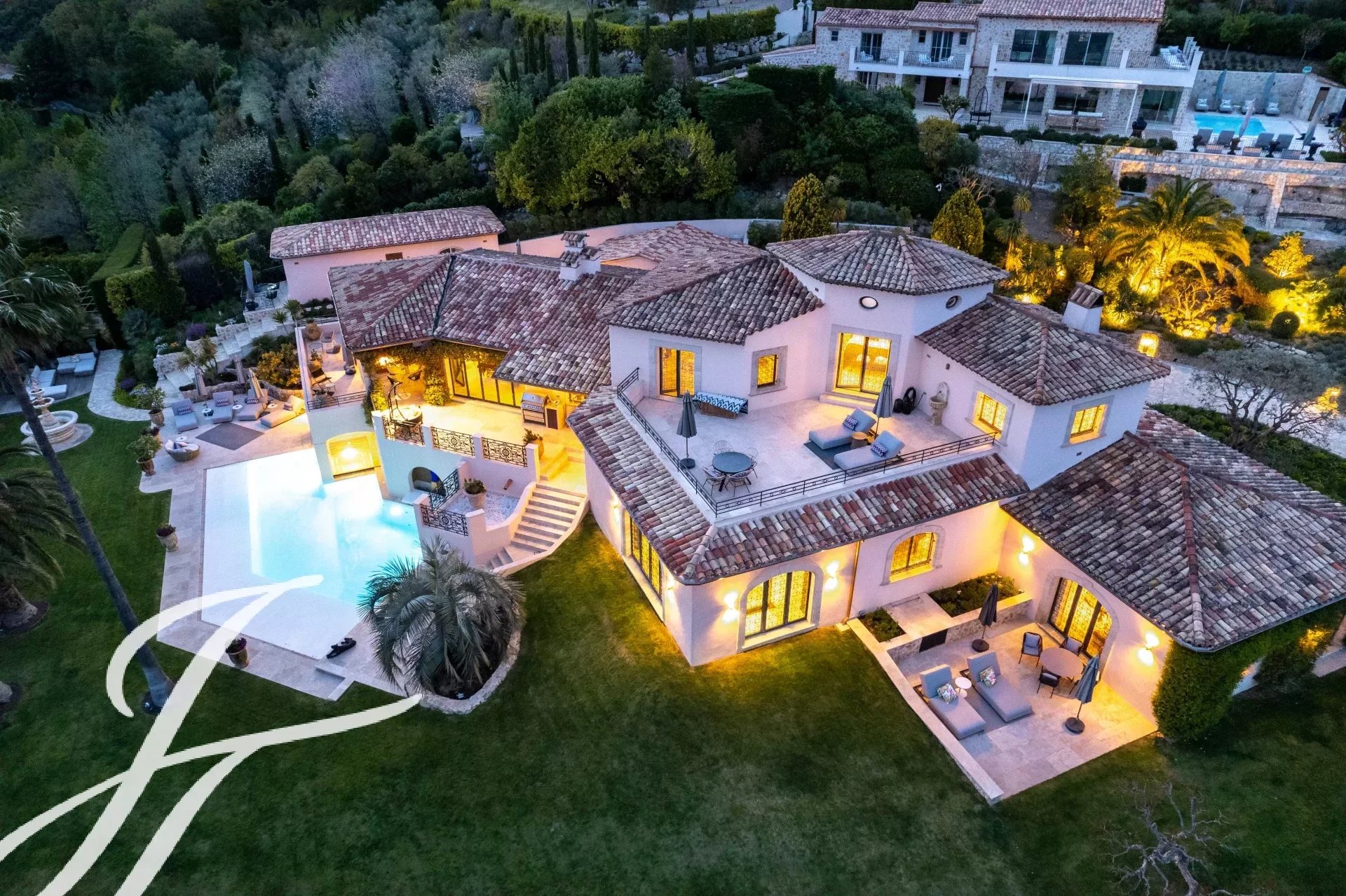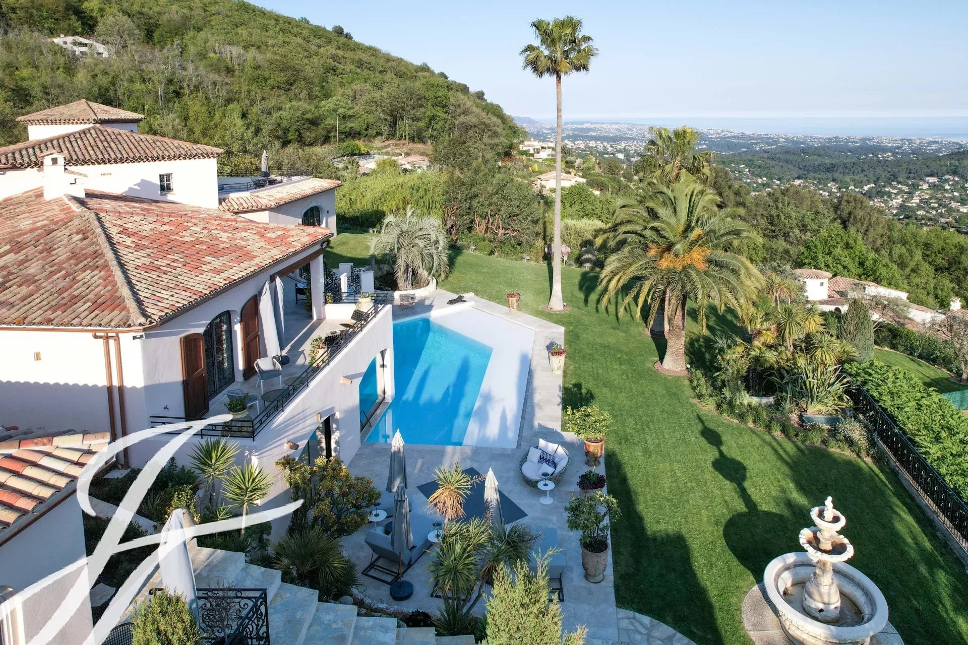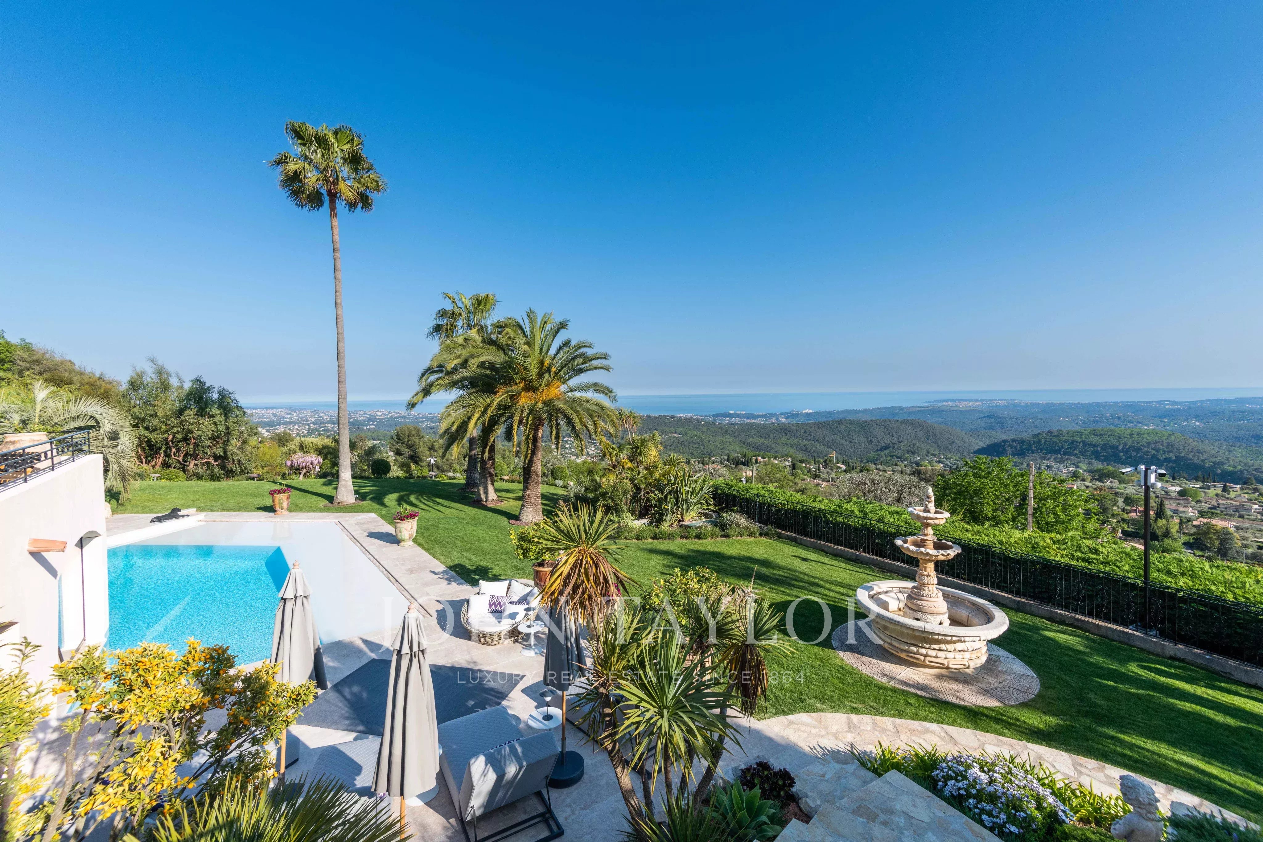 Luxusní pětihvězdičková vila v kopcích nad půvabnou vesnicí Tourrettes-sur-Loup s panoramatickým výhledem na moře a okolní hory.