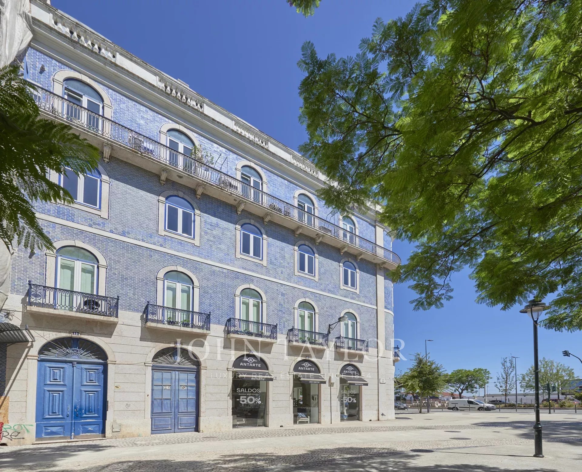 Objevte čistou eleganci v srdci Lisabonu v tomto stylovém mezonetovém bytě o rozloze 598 m2 s výhledem na řeku, který se nachází v noblesní a ikonické budově v Santos O Velho.