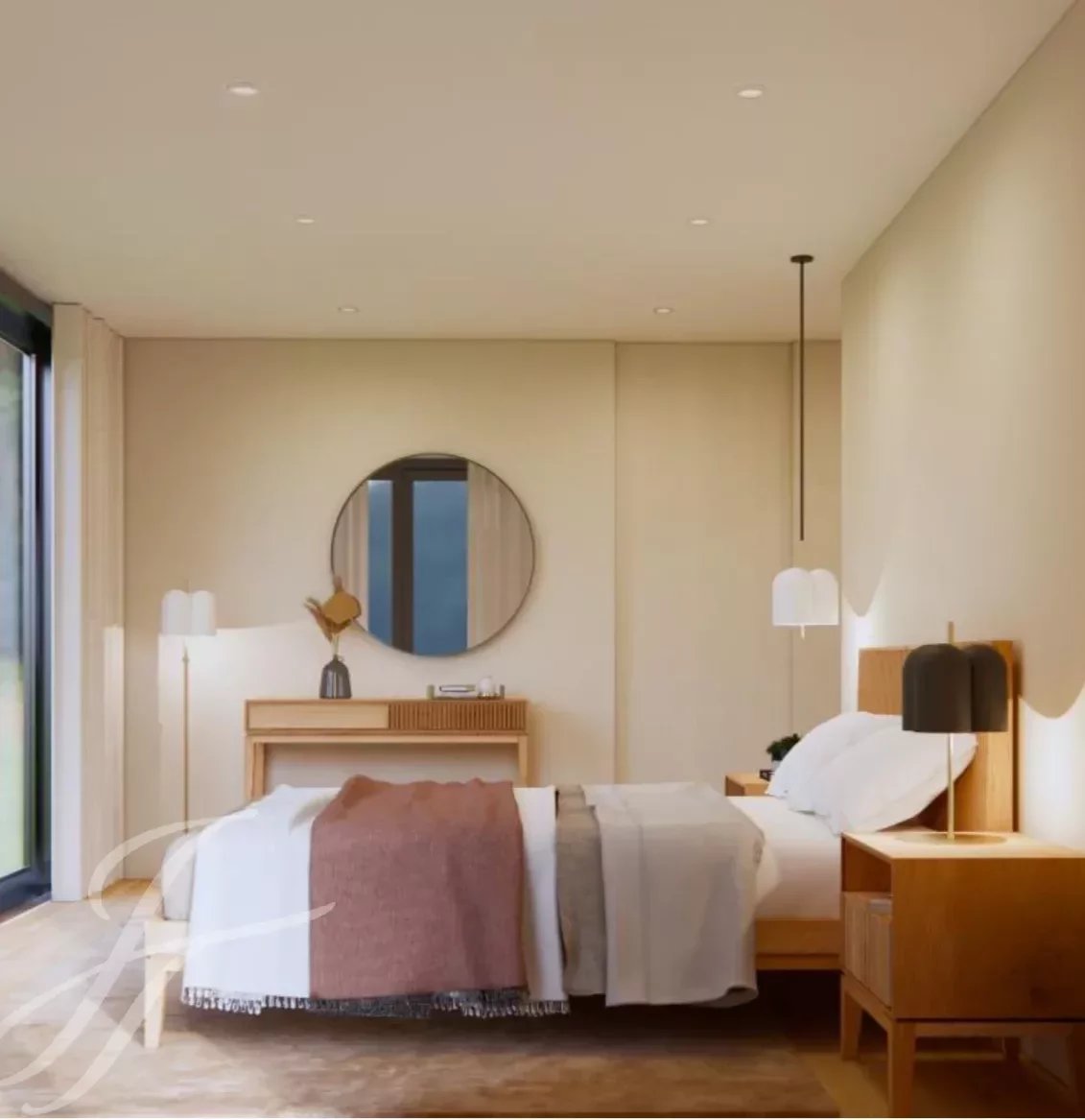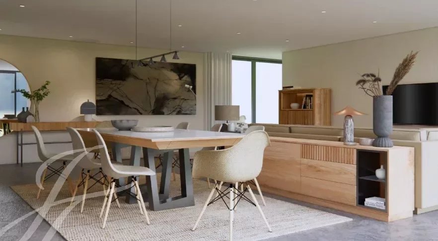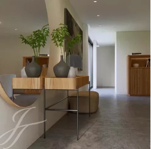 V přízemí se nachází obývací pokoj, plně vybavená otevřená kuchyně s přímým vstupem do zahrady a k bazénu. Ve stejném patře se nachází kancelář, toaleta pro hosty a 3 ložnice s vlastní koupelnou a vestavěnými skříněmi.