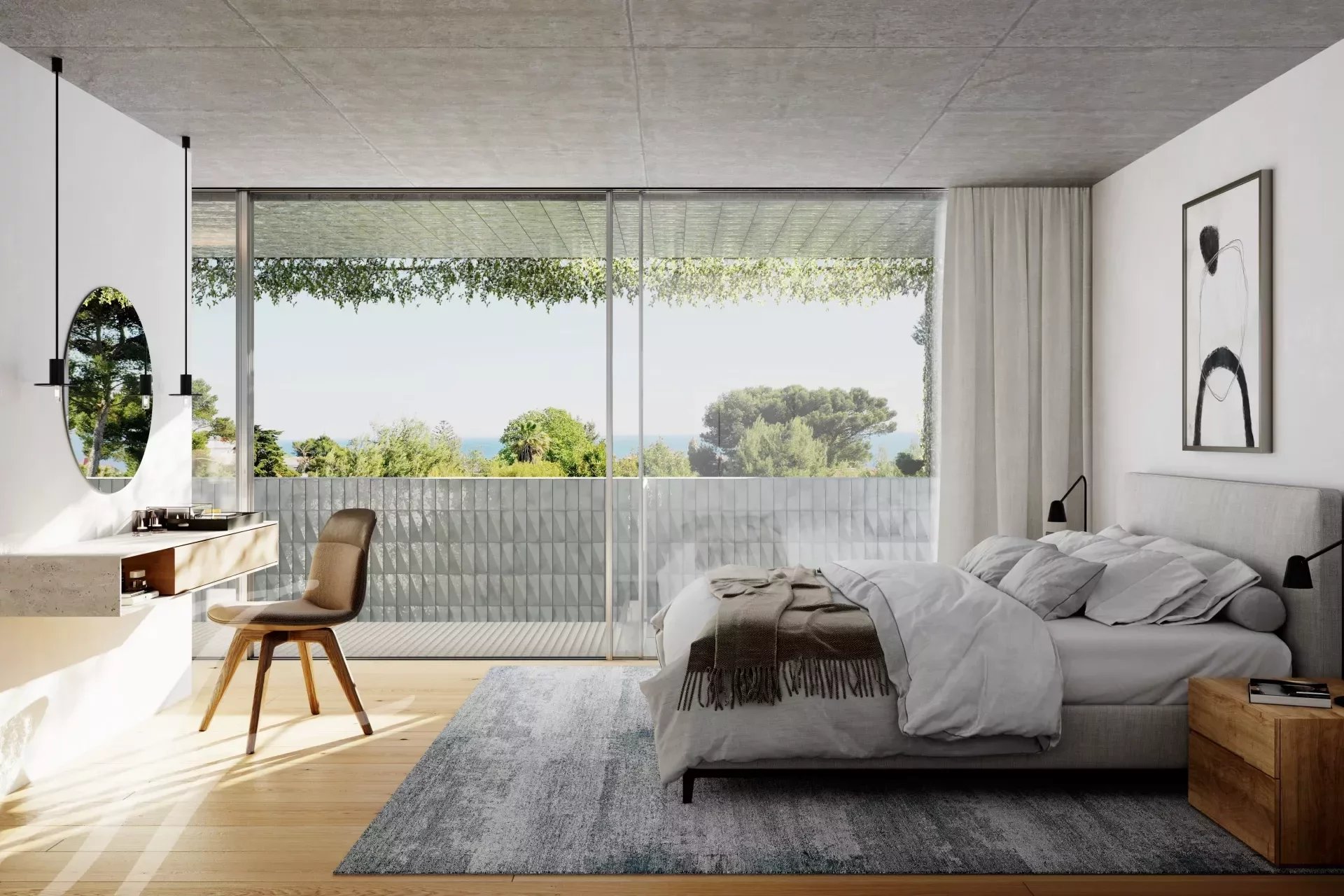 Nadstandardní ložnice s nádherným výhledem do zahrady a na moře mají vlastní koupelnu, podlahové vytápění, vestavěné skříně a balkony.