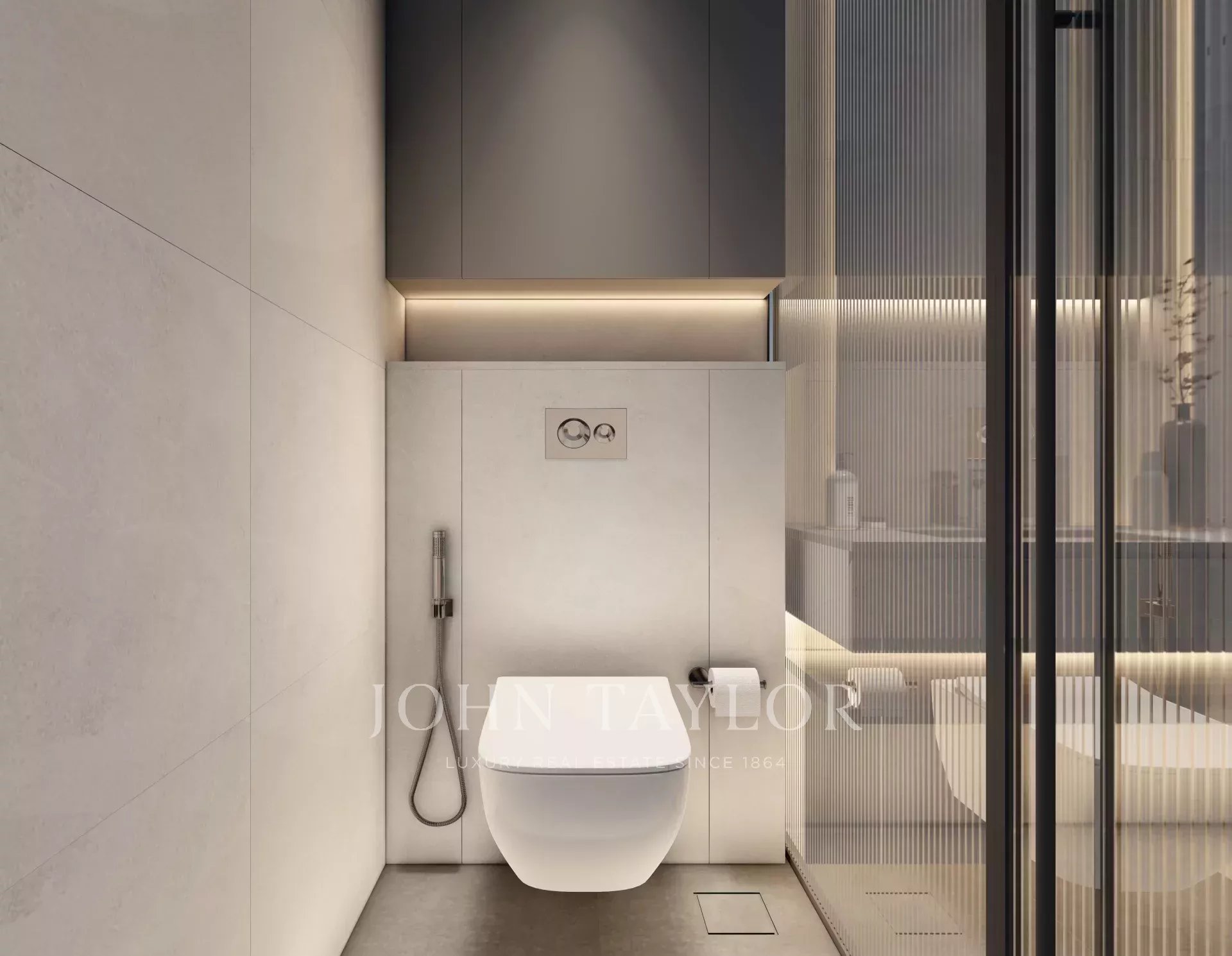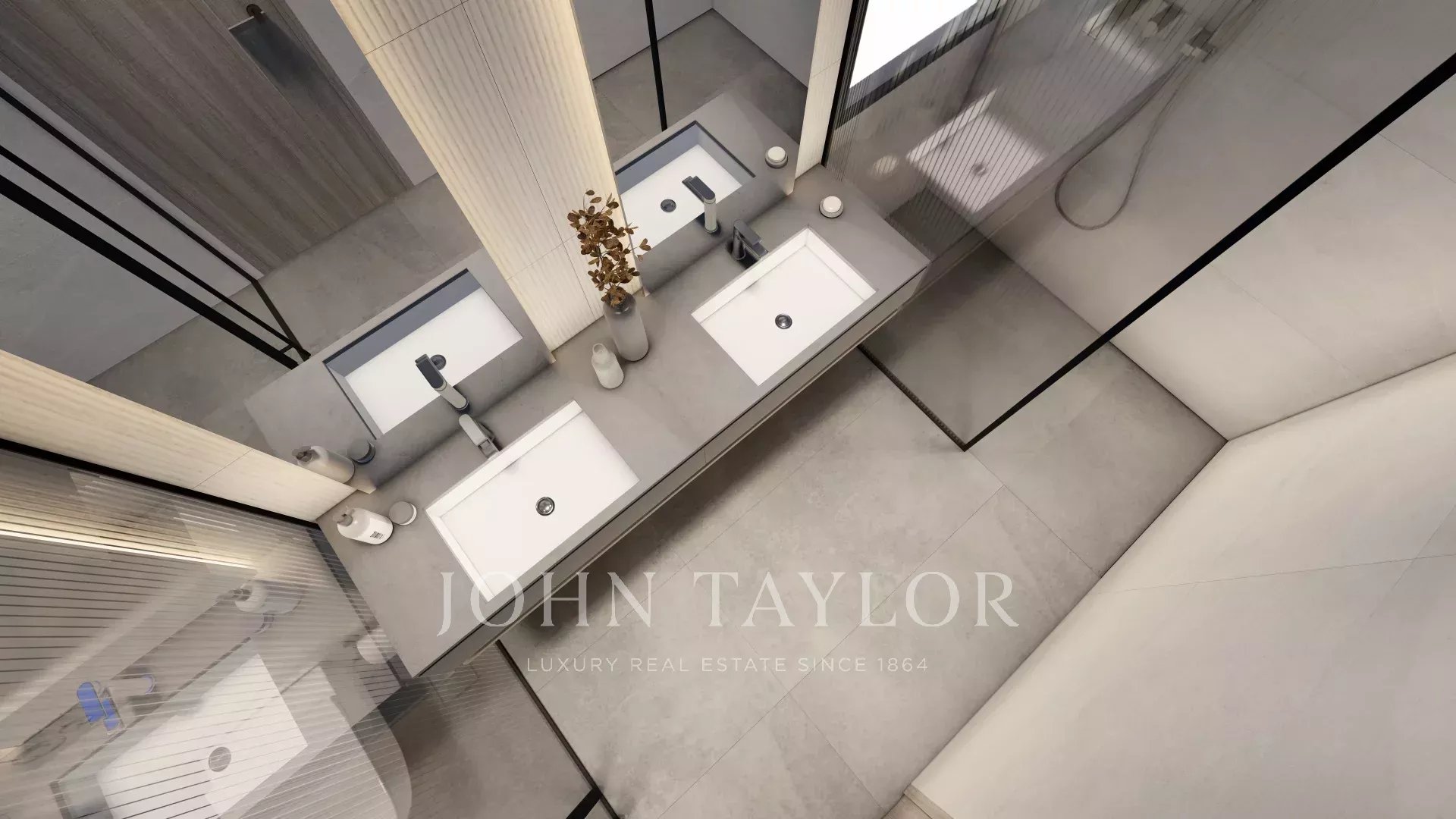 2 prostorné ložnice: Hlavní ložnice má vlastní koupelnu a šatnu, zatímco druhá ložnice nabízí dostatek prostoru se snadným přístupem do stylové koupelny pro hosty.