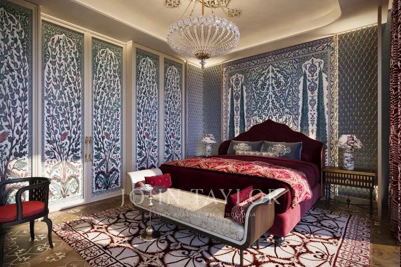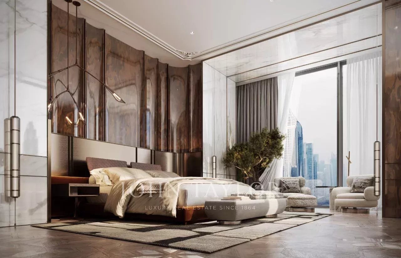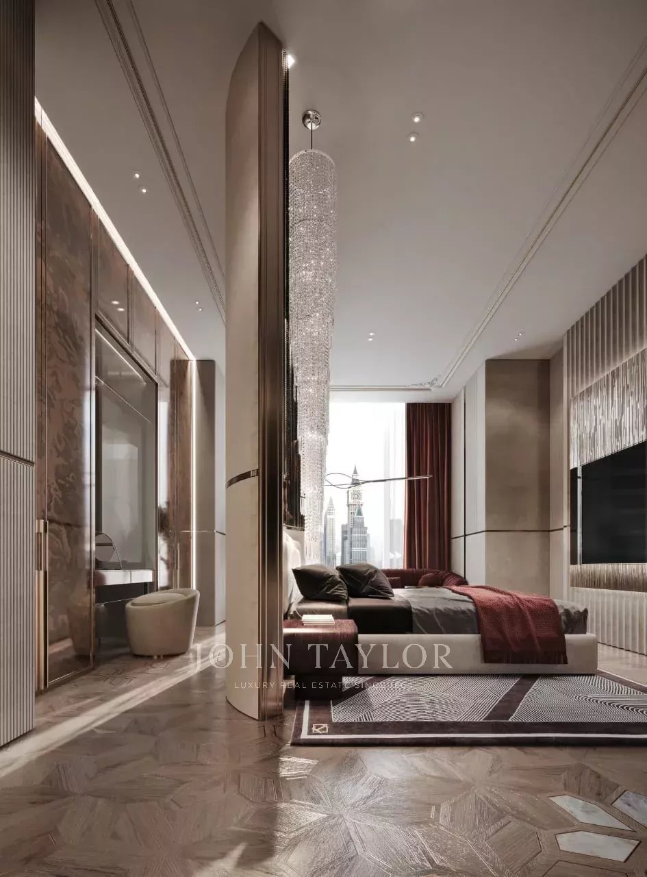 Hlavní apartmá: Luxusní hlavní ložnice s vlastní koupelnou, šatnou a panoramatickým výhledem na dubajské panorama.