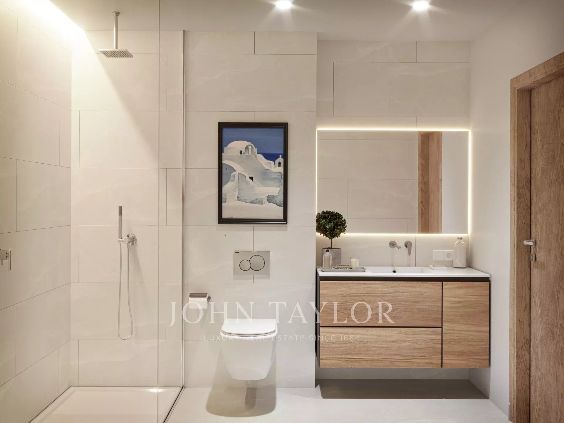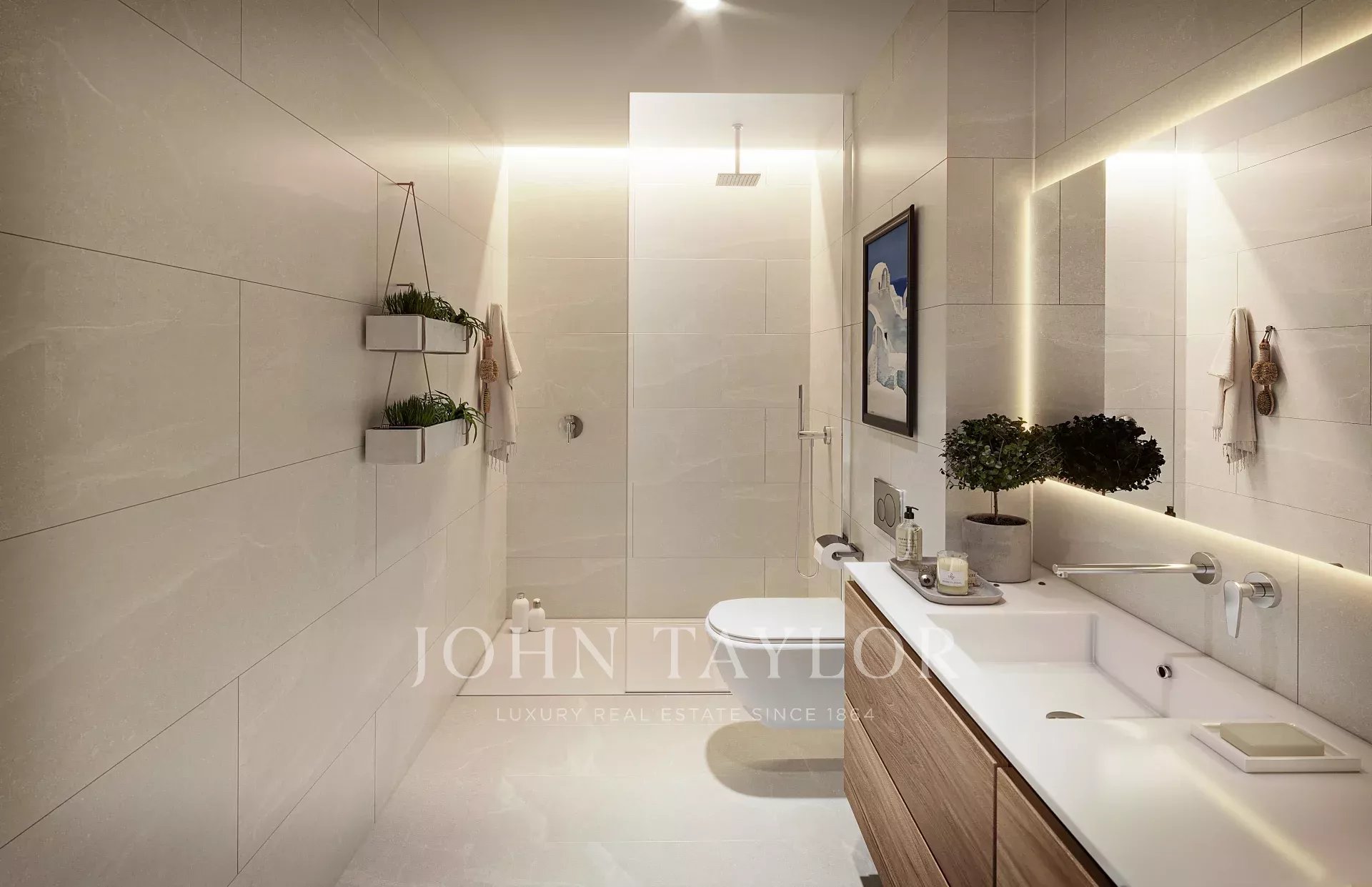 Koupelny mají dřevěnou závěsnou skříňku s jedním nebo dvěma umyvadly, sprchový kout se sprchovou vaničkou a zapuštěnými bateriemi z domu Tres. Dokončení se očekává v březnu 2026