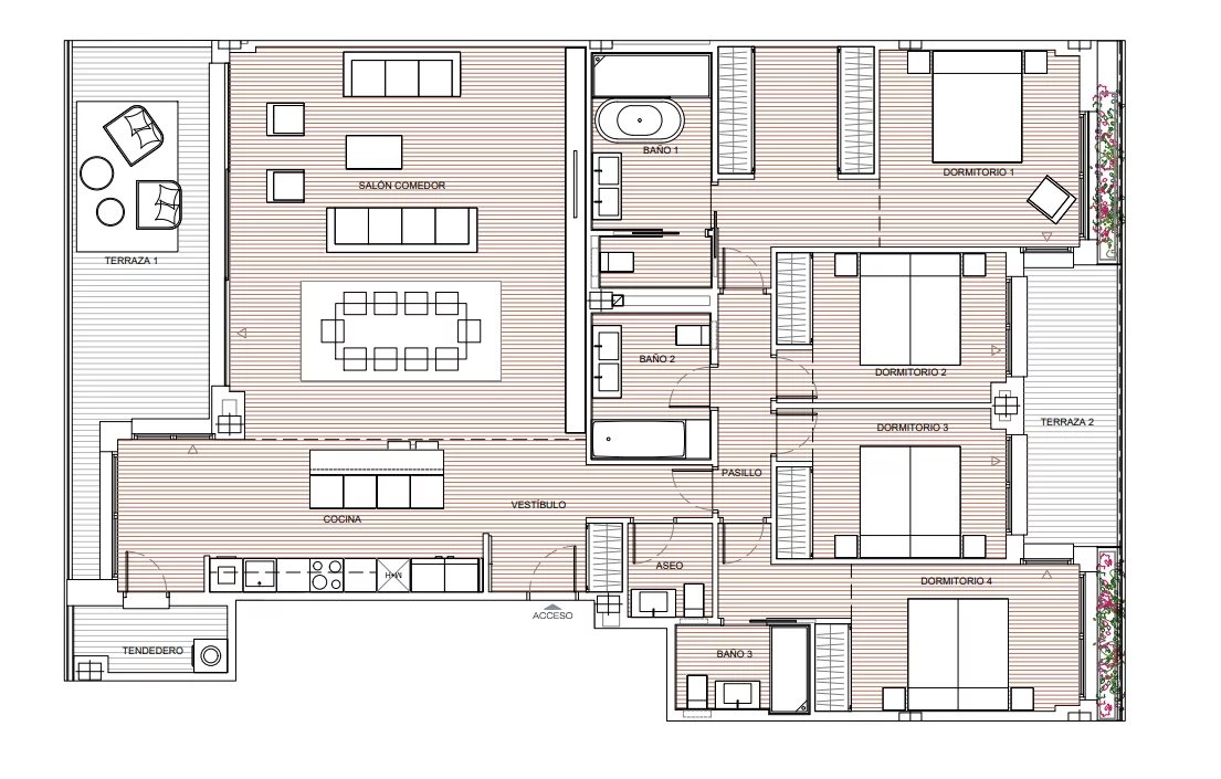 Soukromá část nabízí čtyři ložnice, z toho dvě s vlastní koupelnou, a velkolepé hlavní apartmá se šatnou a vstupem na druhou terasu. Všechny koupelny jsou dokončené podle nejvyšších standardů. Nemovitost zahrnuje podlahové vytápění teplá/chladná, aerotermální klimatizaci, domácí automatizaci a vynikající izolaci, která zaručuje maximální pohodlí.