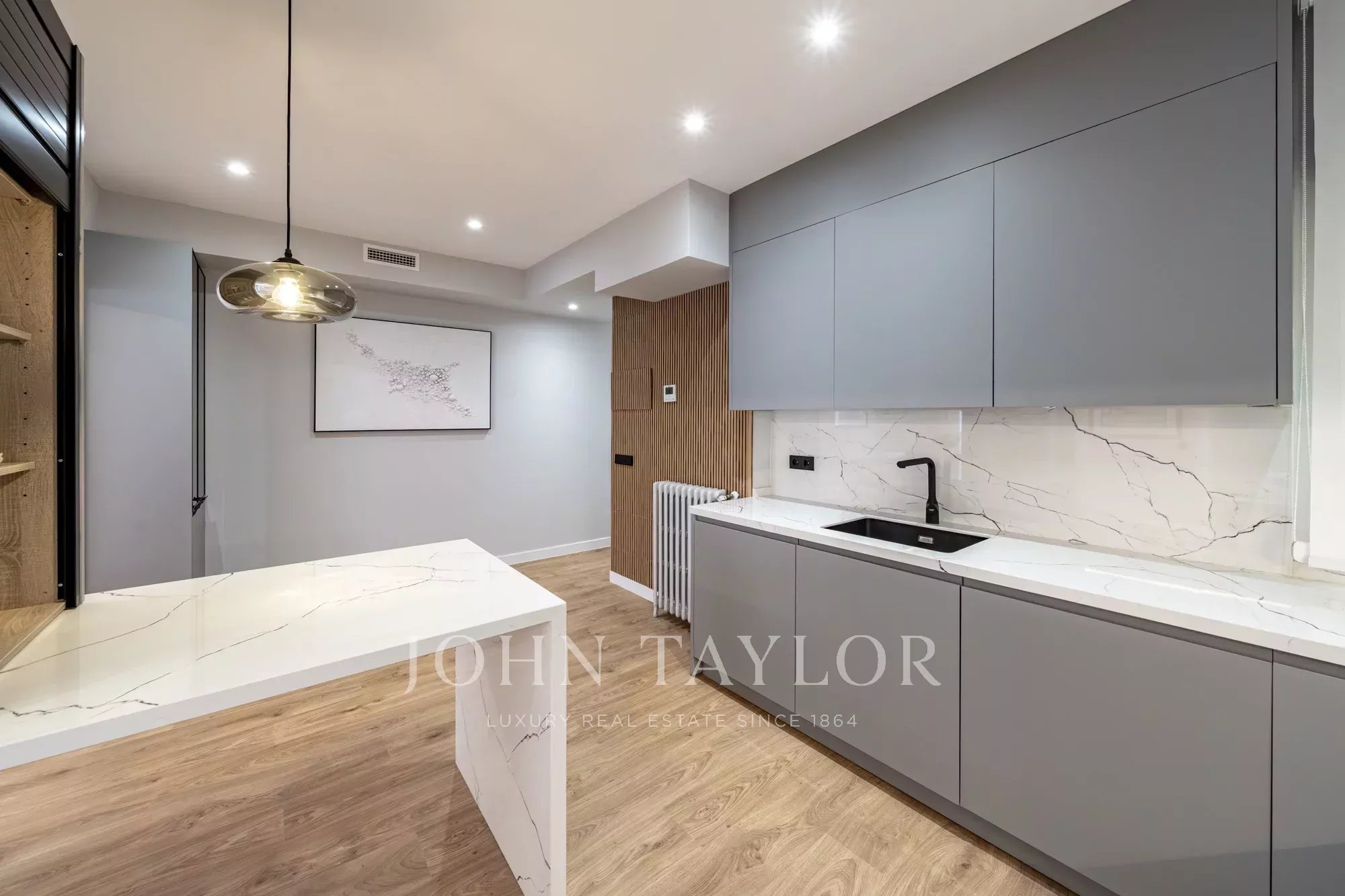 Nemovitost má dvě velké ložnice, dvě designové koupelny a samostatnou prádelnu a nabízí funkční a zároveň elegantní uspořádání.