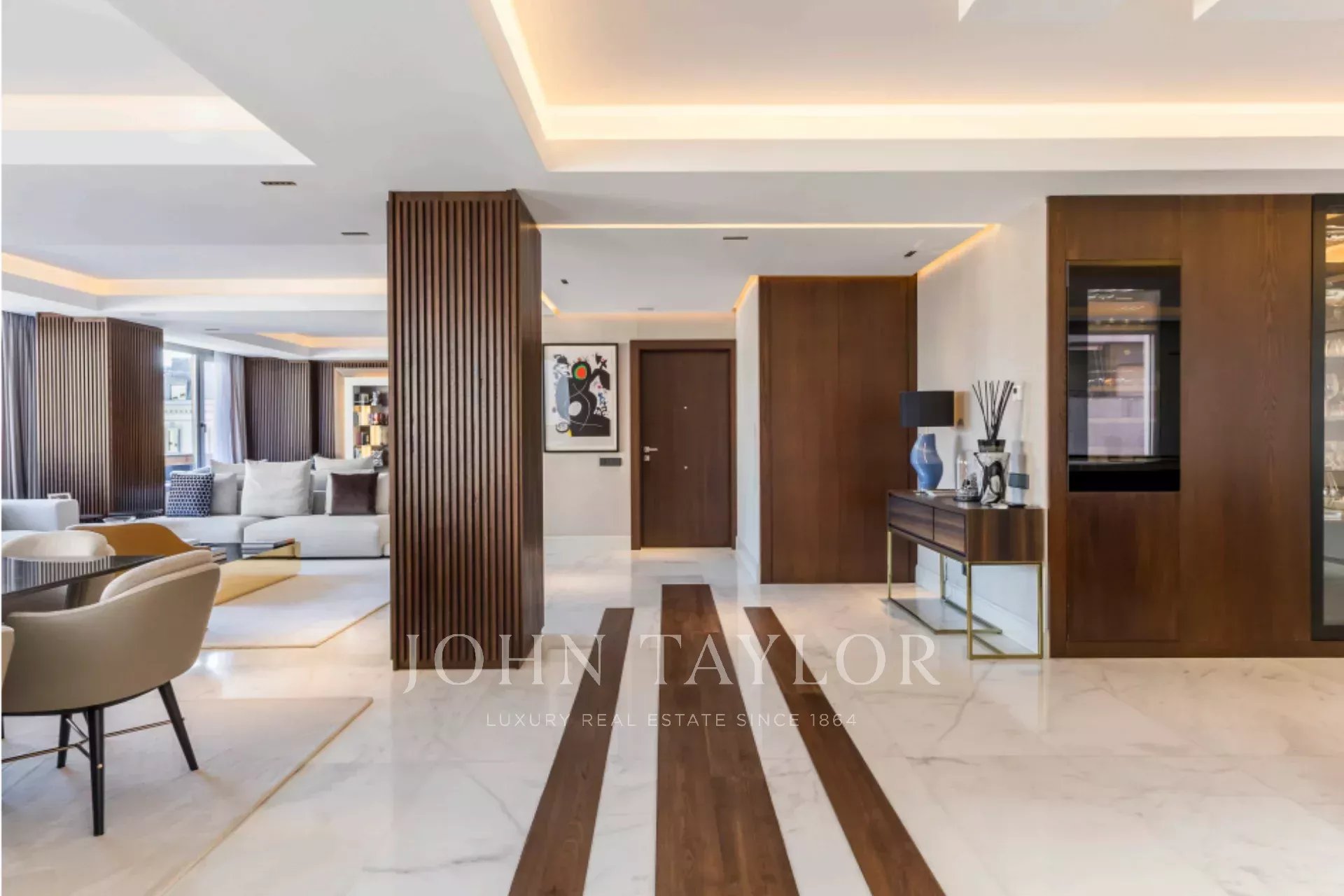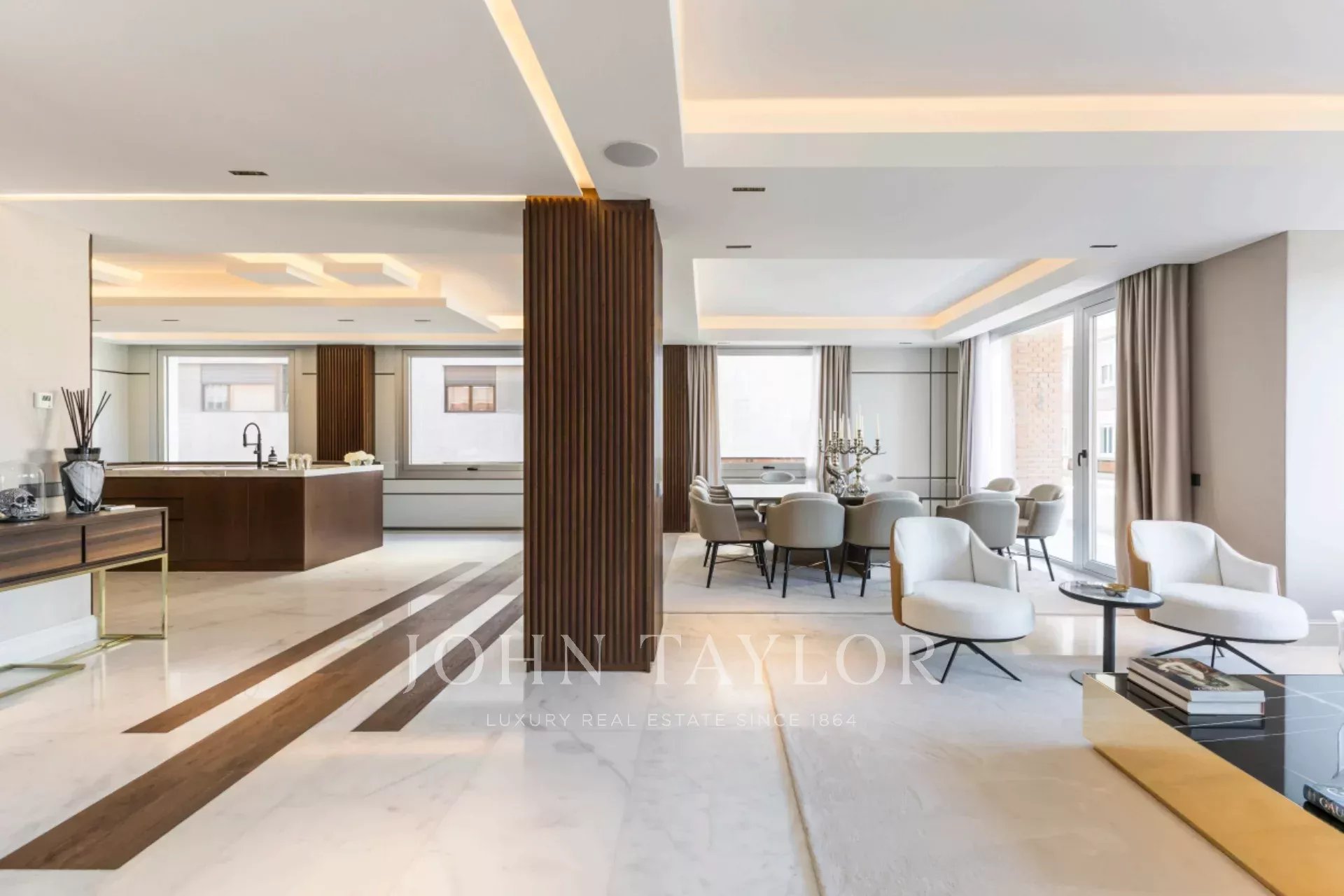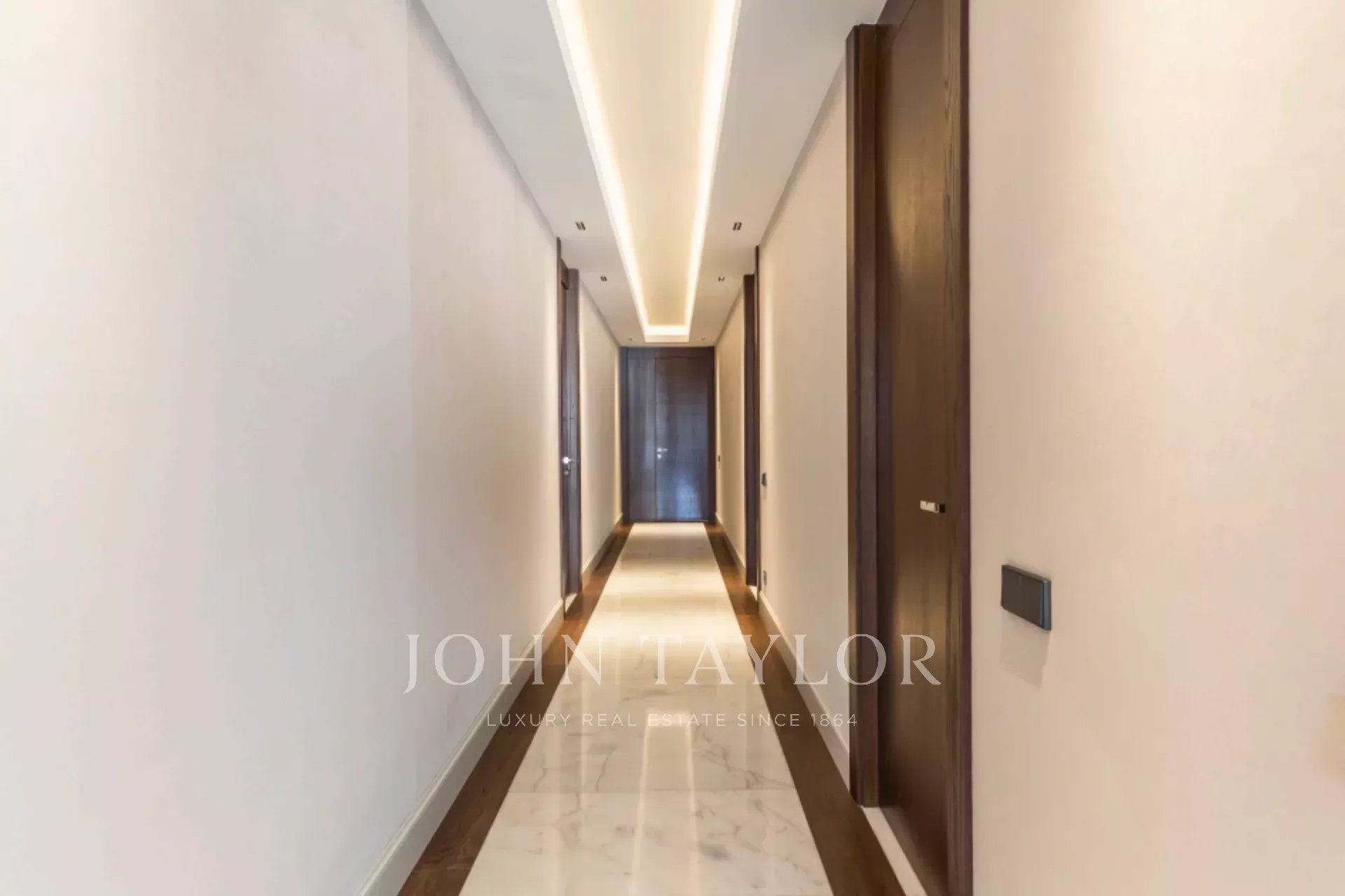 Tato výjimečná nemovitost se nachází v jedné z nejlepších částí Madridu a kombinuje mezinárodní moderní design se špičkovými povrchovými úpravami. Vytvořilo ji renomované studio interiérového designu a využívá ušlechtilé materiály, jako je dolomitový mramor a přírodní dubové dřevo, které dodávají domu jedinečný charakter.