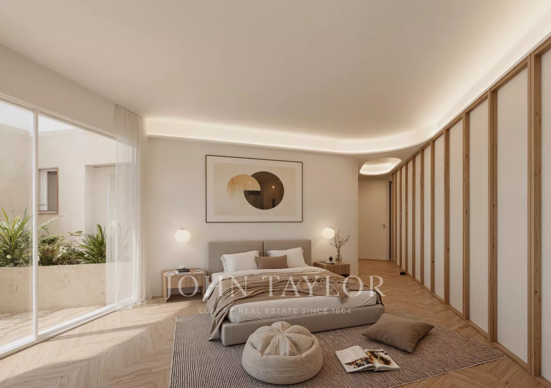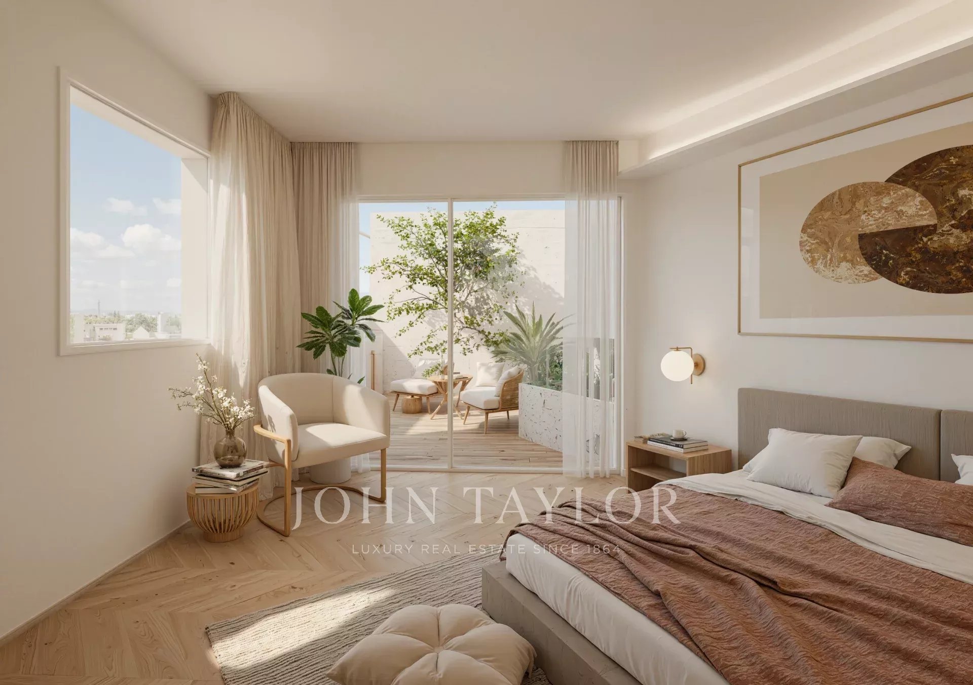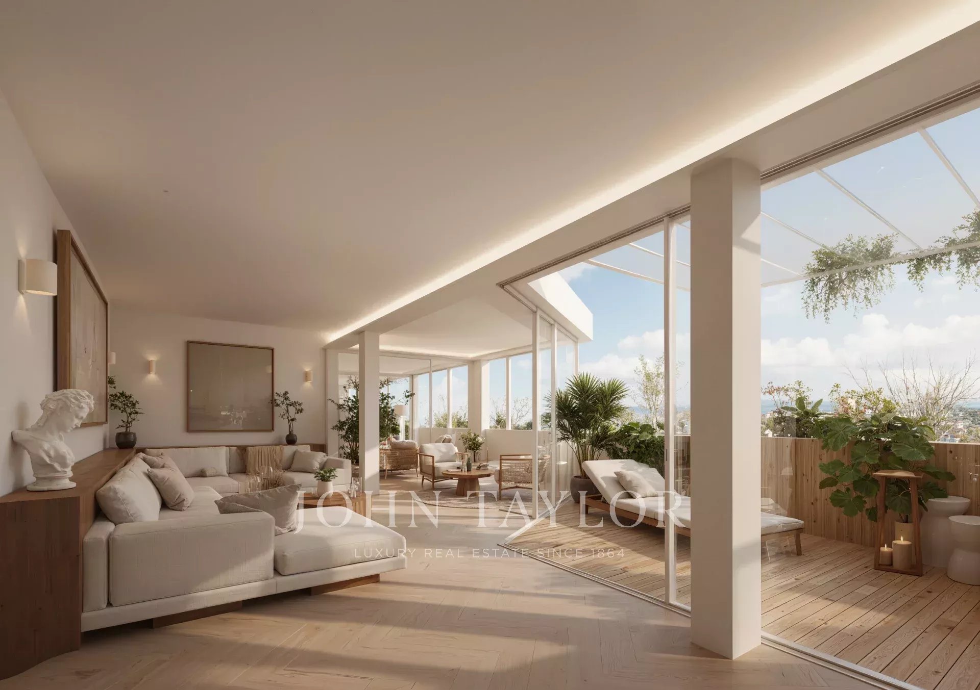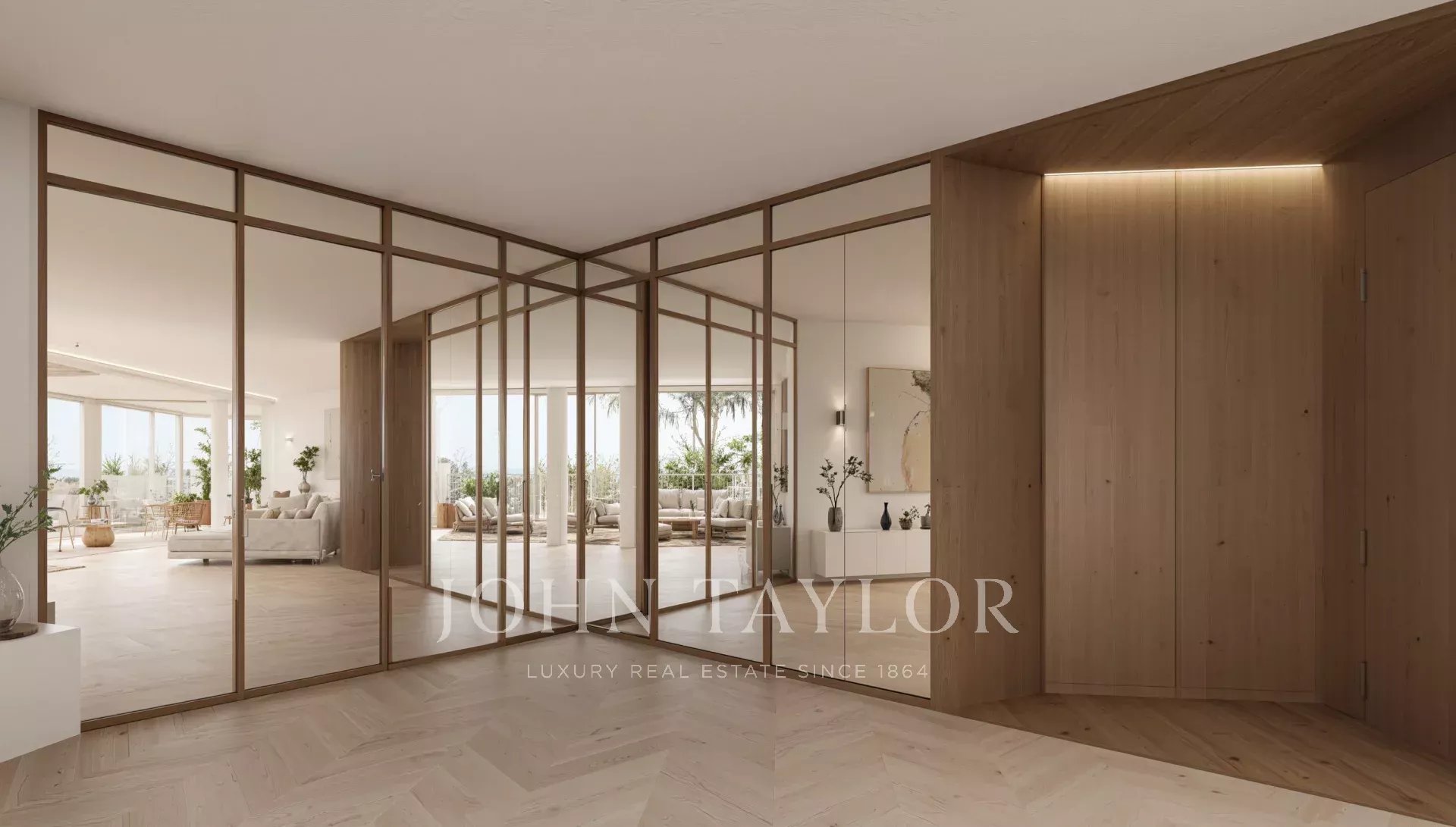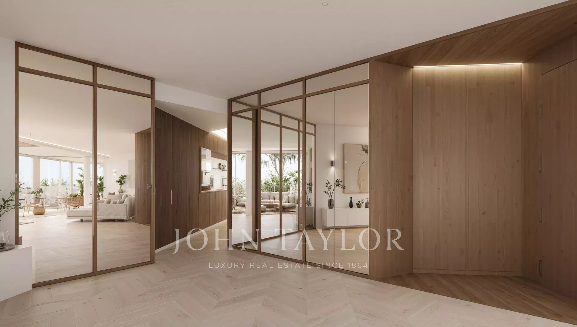 Dům zabírá celé osmé patro budovy a má dokonale uspořádanou dispozici kolem velkého centrálního dvora ve dvou odlišných oblastech: společenské a soukromé. Jakmile vstoupíme, najdeme velký obývací pokoj s jídelnou, zaplavený světlem a orientovaný na západ. Terasa o rozloze téměř 20 m² je integrována do obývacího pokoje pomocí posuvných skleněných dveří od podlahy ke stropu, které umožňují vychutnat si krásný nerušený výhled. Společenskou zónu doplňuje okouzlující toaleta pro hosty.
