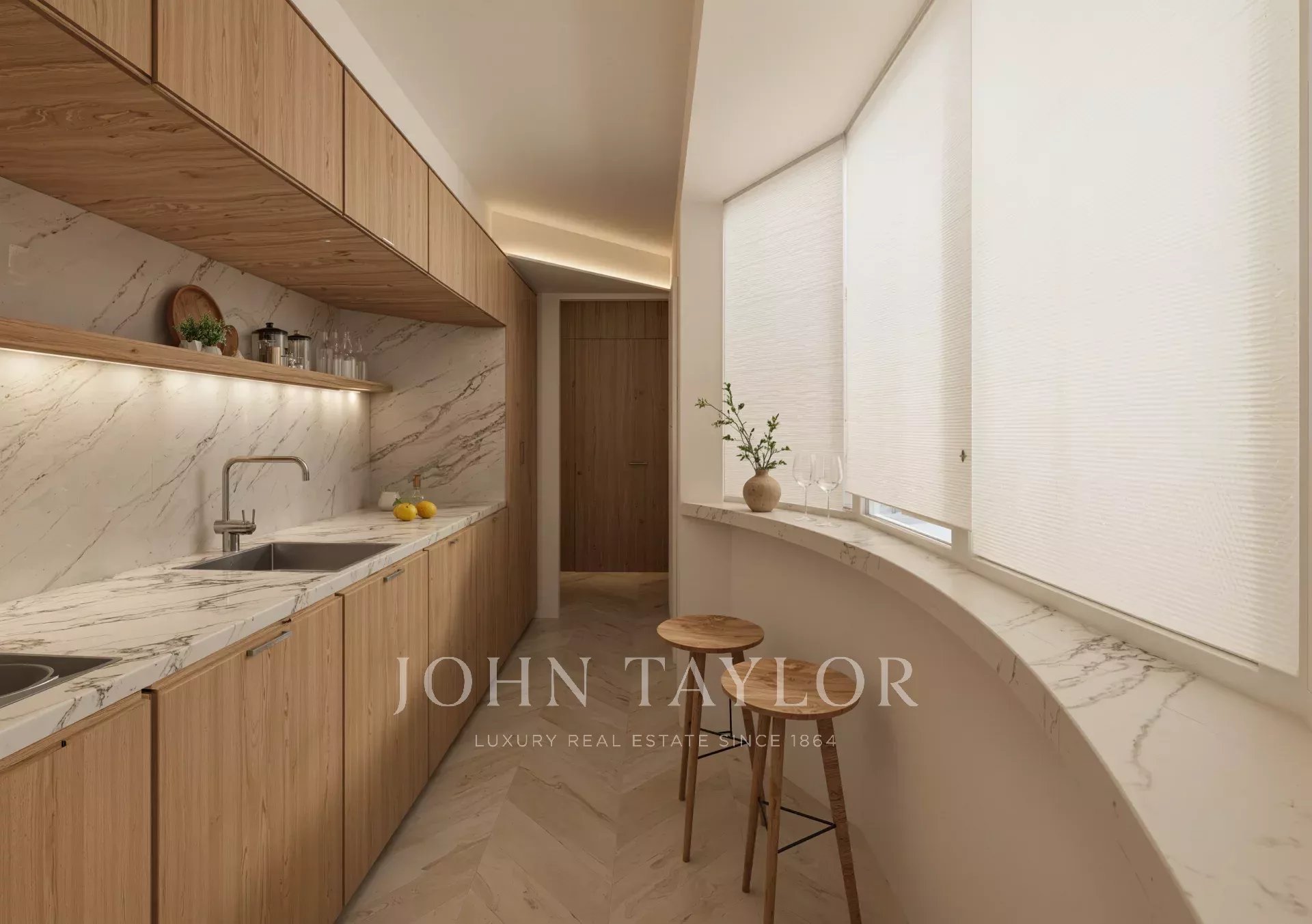 Kuchyň moderního designu, vybavená špičkovými spotřebiči, propojuje společenskou a soukromou část. Vyniká vynikajícím přirozeným světlem díky velkým oknům orientovaným na jih.