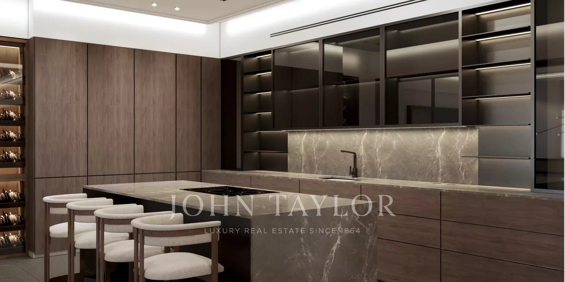 V nemovitosti je designová kuchyň, plně vybavená špičkovými spotřebiči a integrovaná centrálním ostrůvkem, který spojuje funkčnost a estetiku, ideální jak pro každodenní život, tak pro chvíle setkávání.
