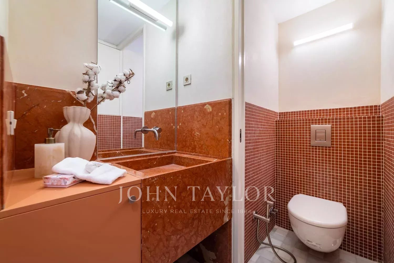 Dispozice byla pečlivě promyšlena tak, aby nabízela pohodlí a funkčnost: prostorný obývací pokoj, samostatná jídelna, plně vybavená samostatná kuchyň, dvě ložnice s vlastním sociálním zařízením, z nichž jedna má šatnu, a toaleta pro hosty. Nemovitost má vestavěné skříně, topení a klimatizaci, což zaručuje maximální pohodlí po celý rok.