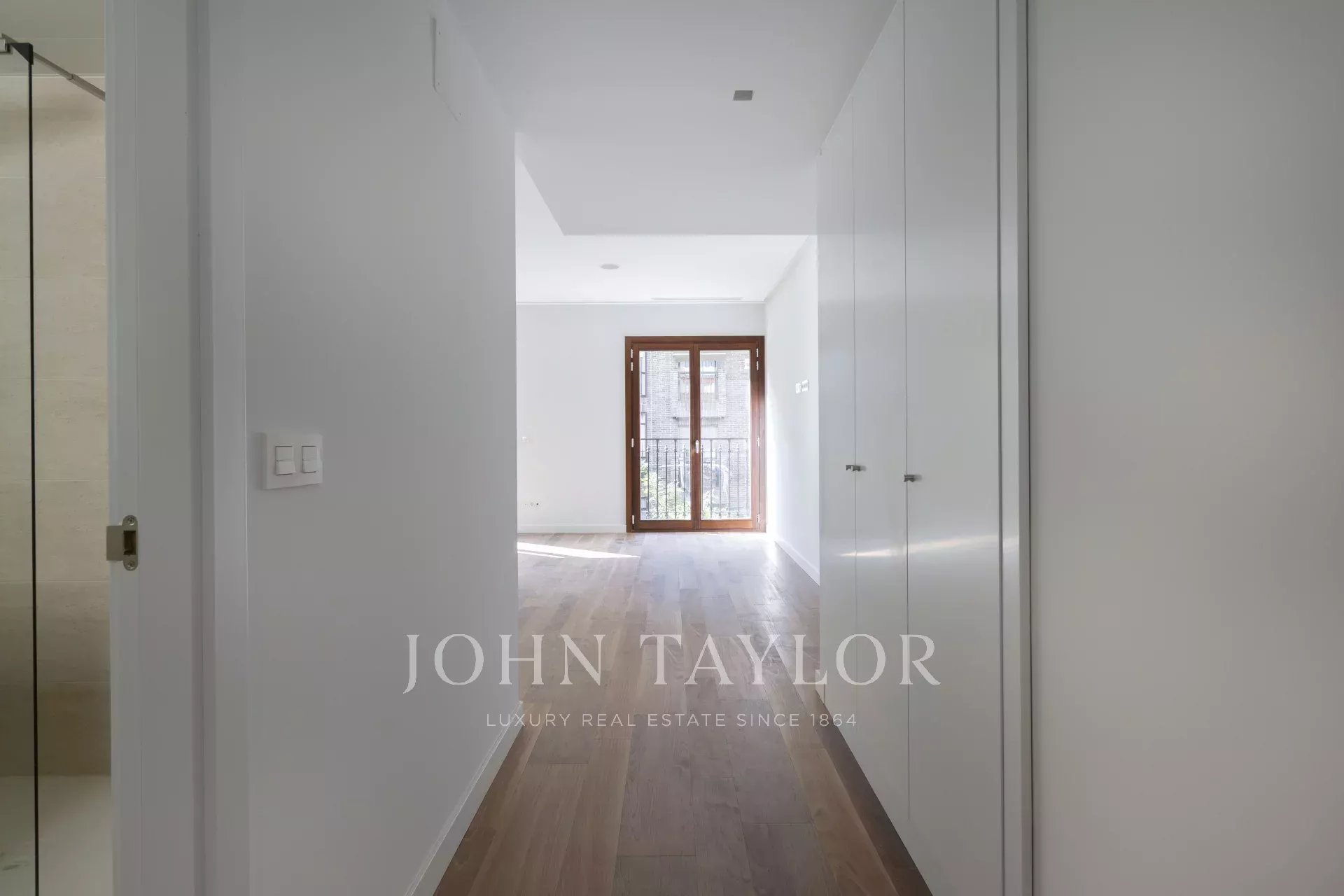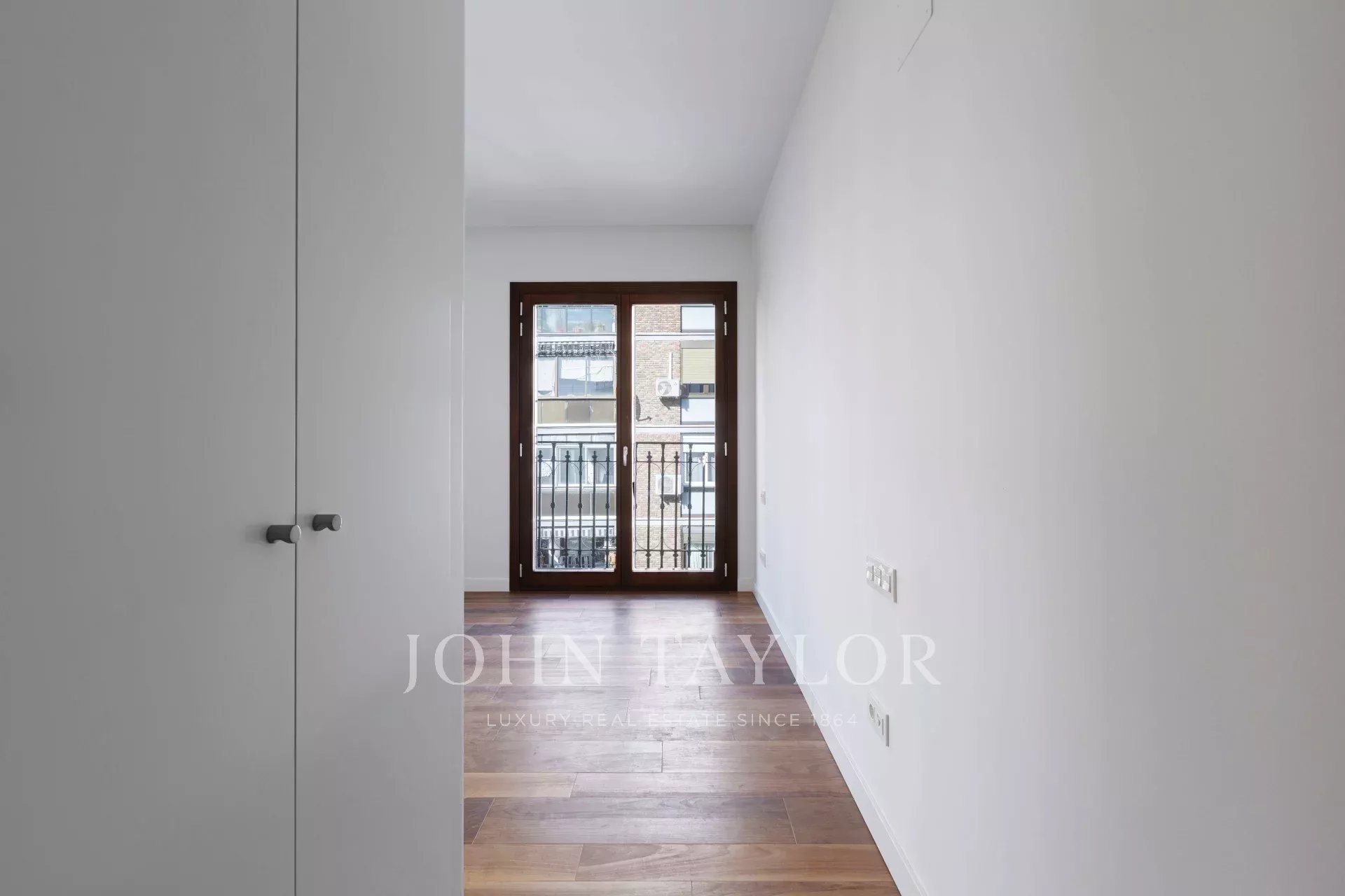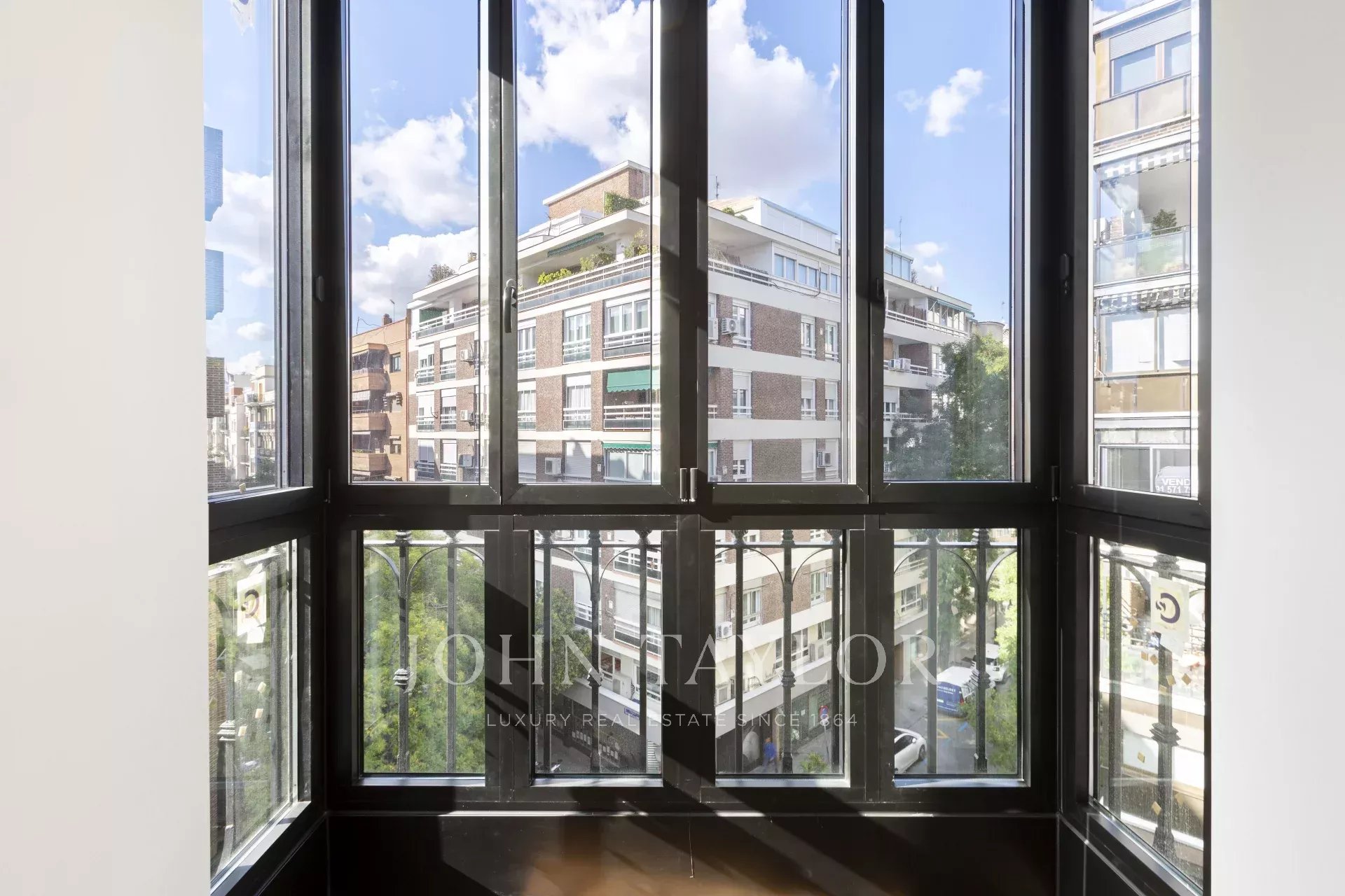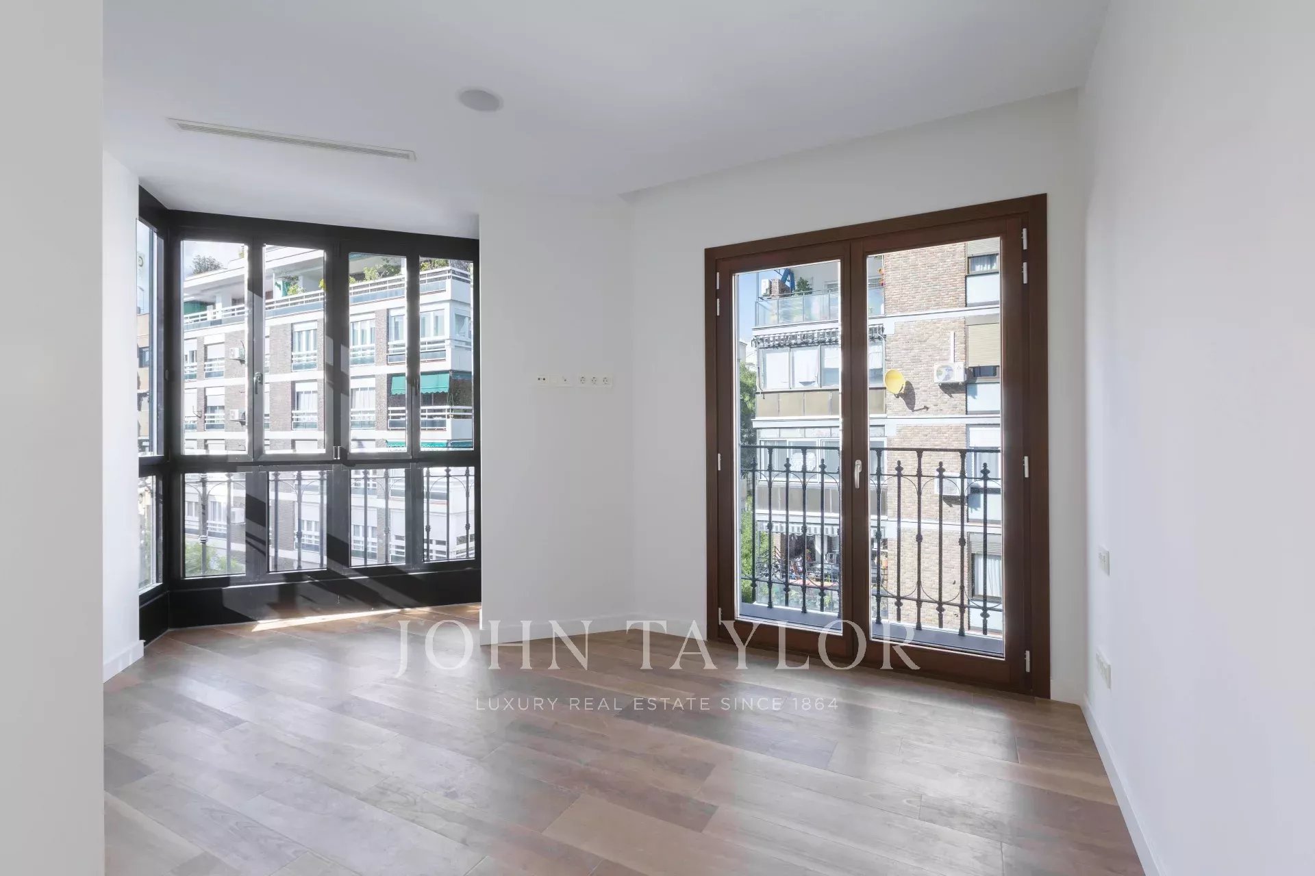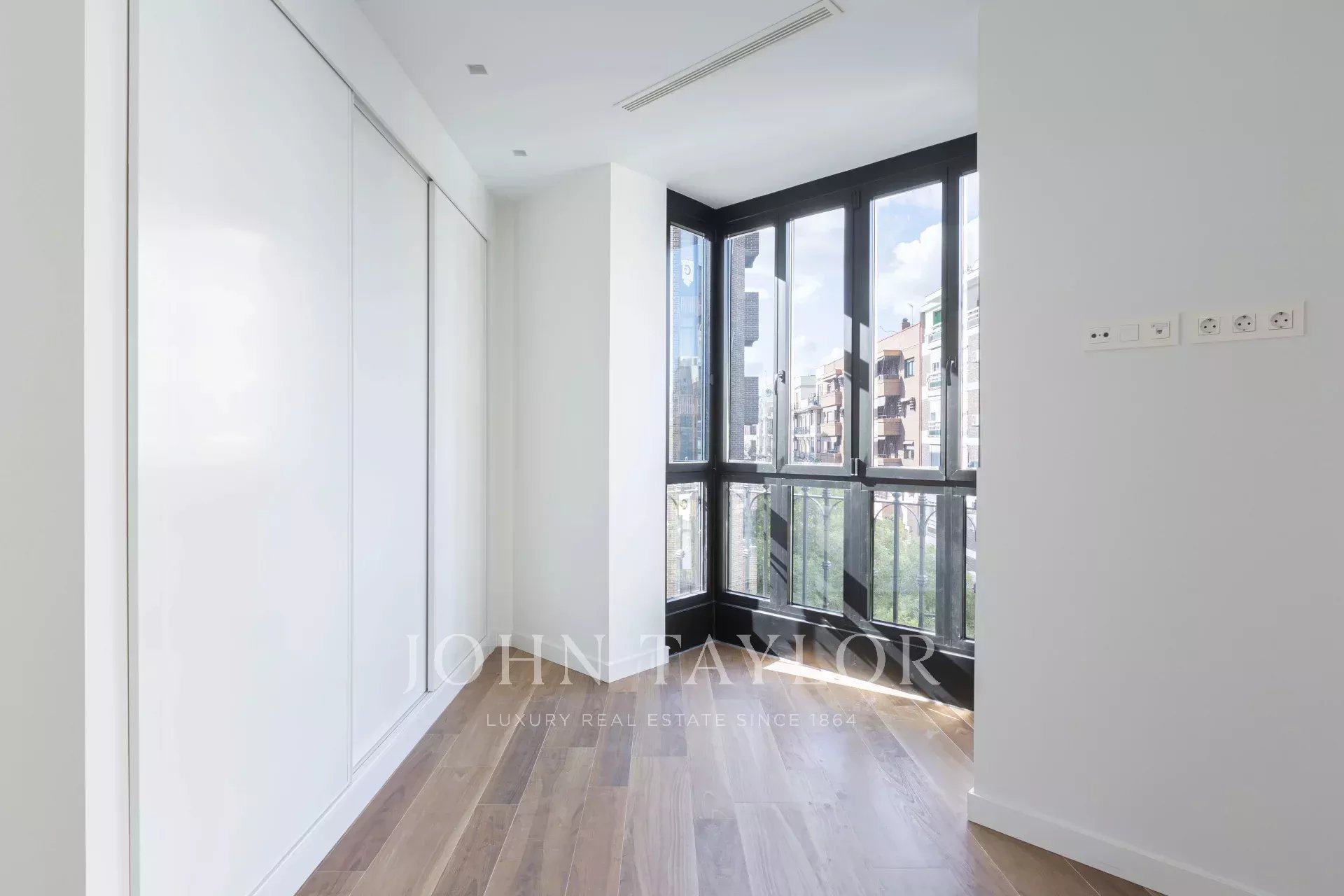 V jedné z mála novostaveb ve čtvrti Barrio de Salamanca se nachází tento báječný nový byt. Byt s pěti balkony s výhledem do ulice, který zaujímá roh čtvrtého patra budovy, se těší fantastickému světlu a prostornosti.