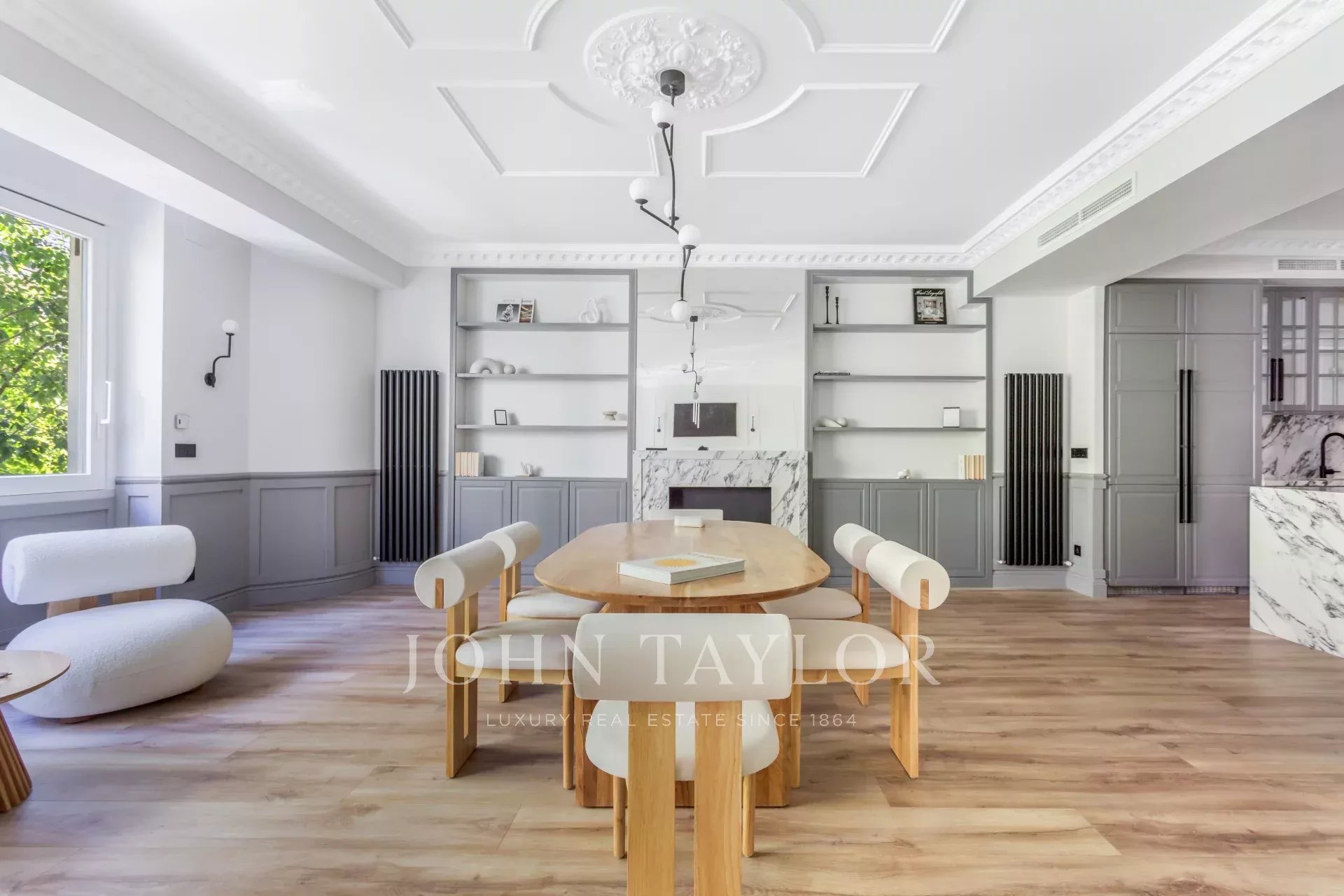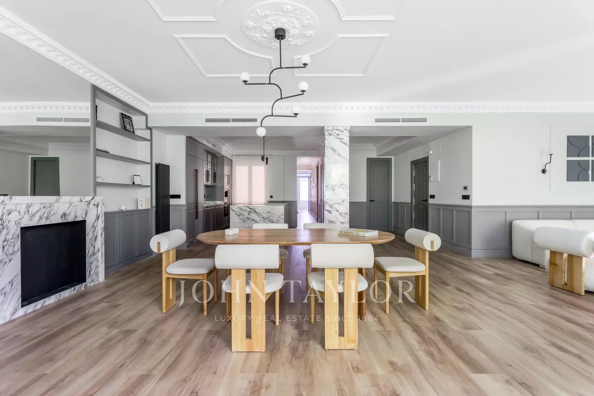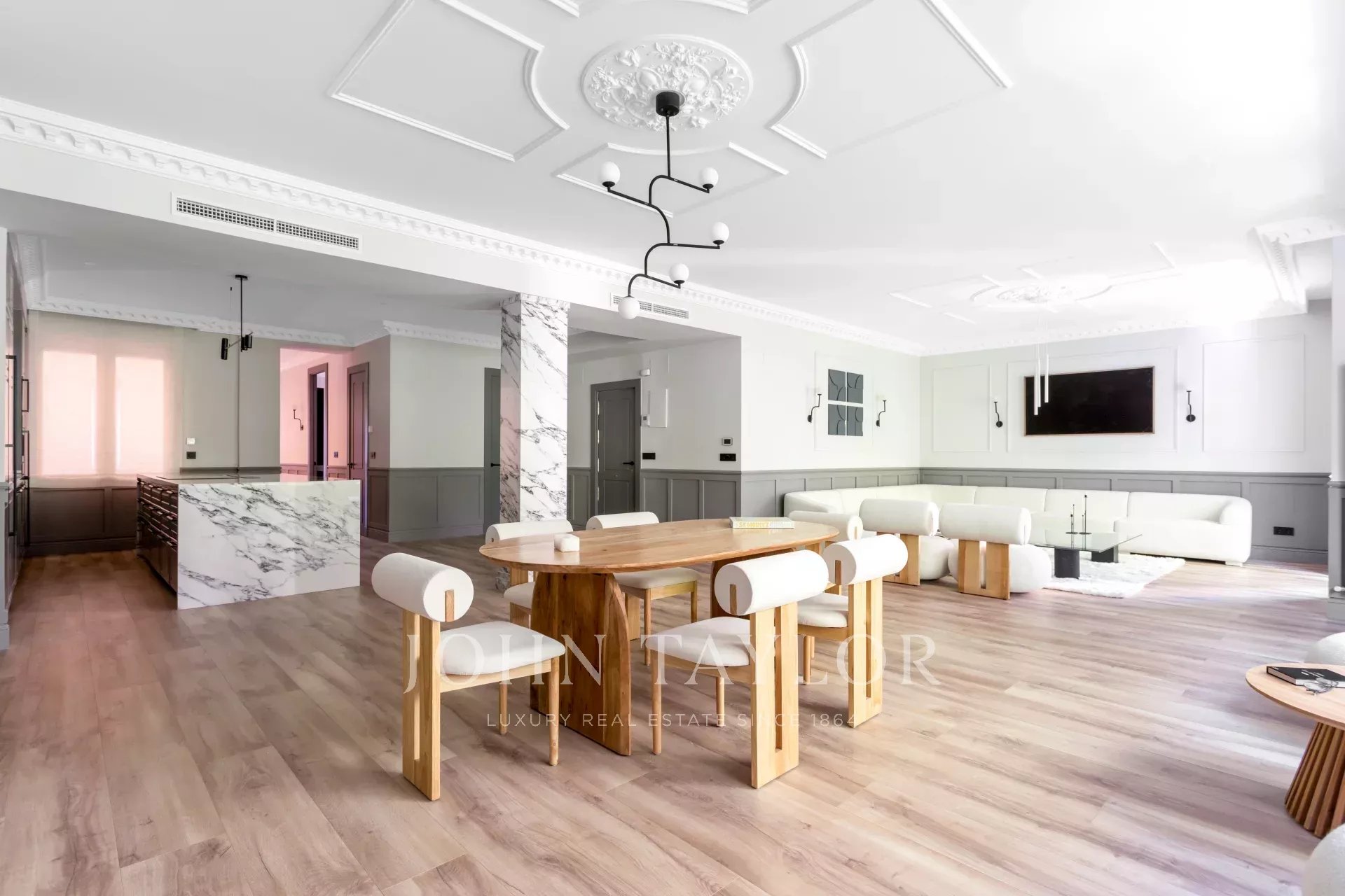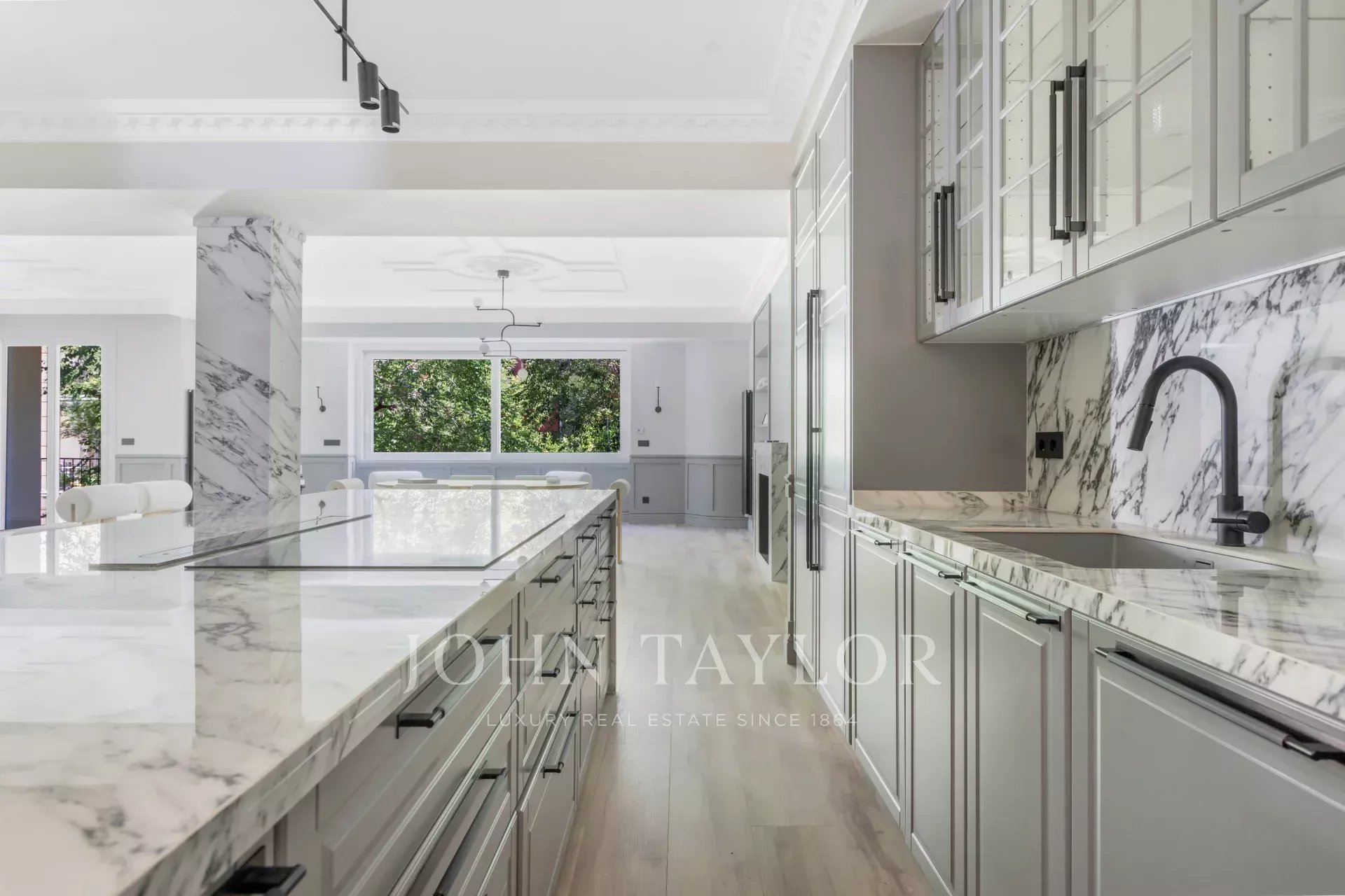Velký obývací pokoj s jídelnou a několika místnostmi se díky velkým oknům těší příjemnému přirozenému světlu. Otevřená k obývacímu pokoji se nachází prostorná kuchyně s velkým centrálním ostrůvkem a vybavená špičkovými spotřebiči.