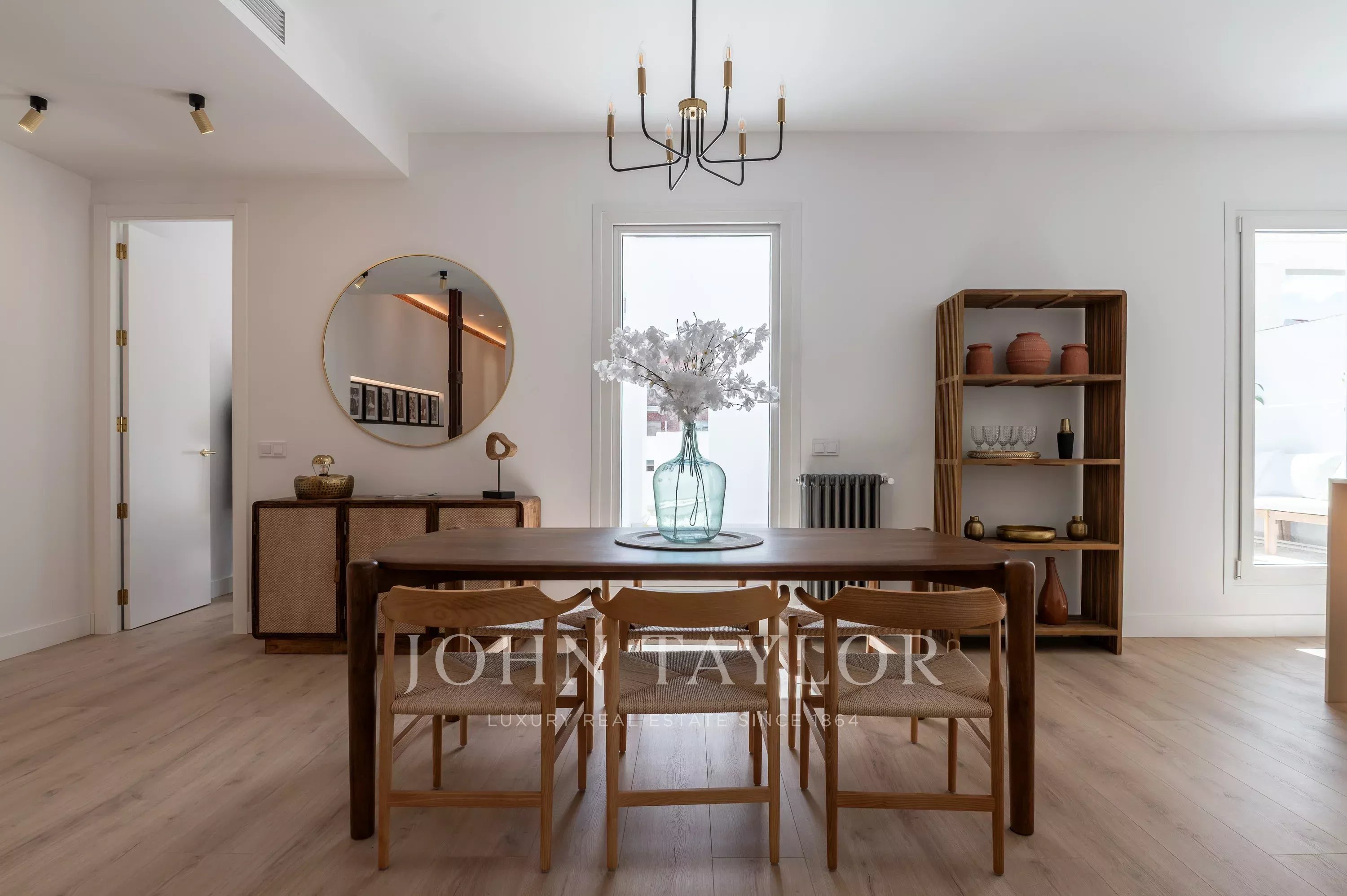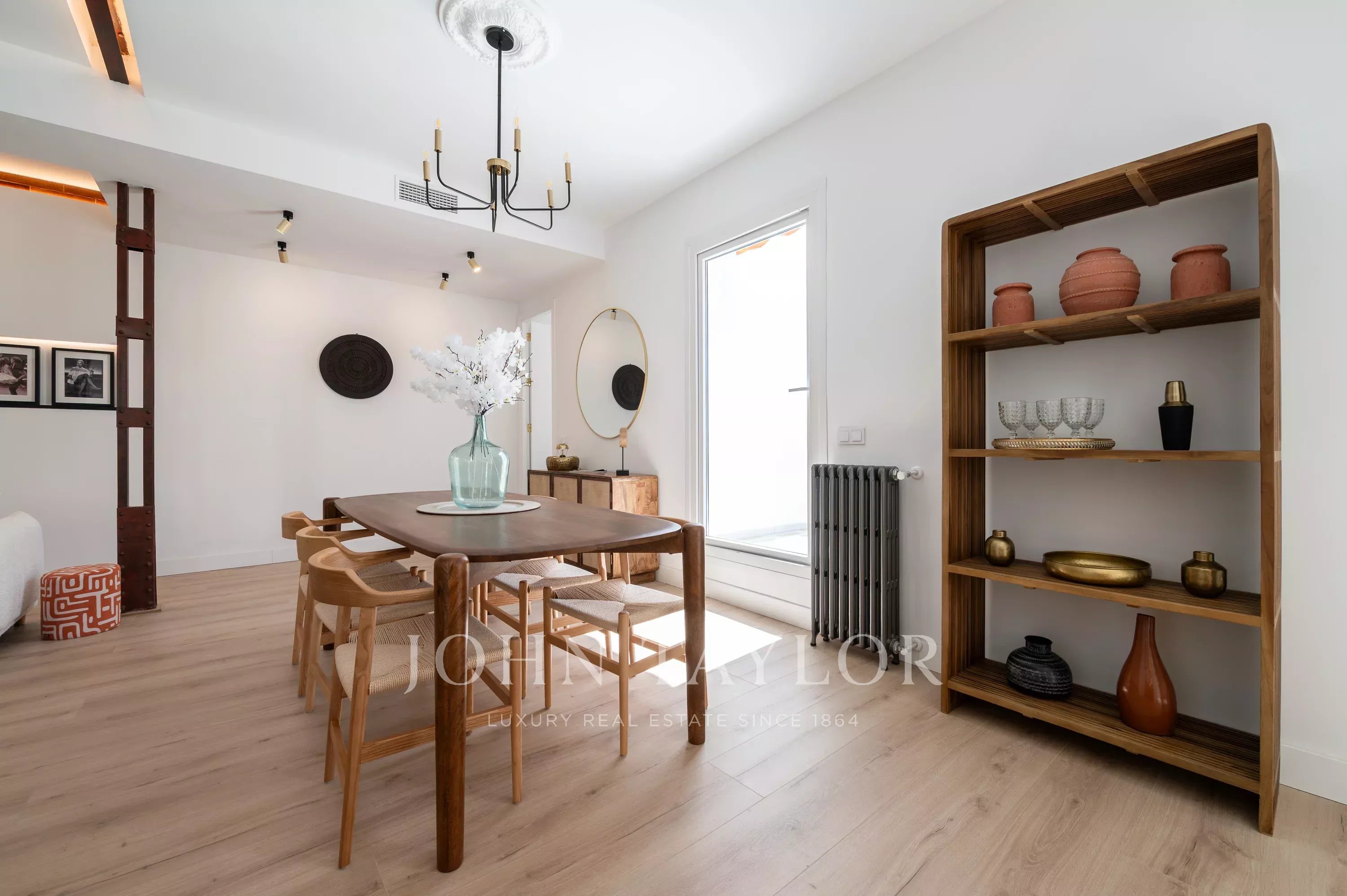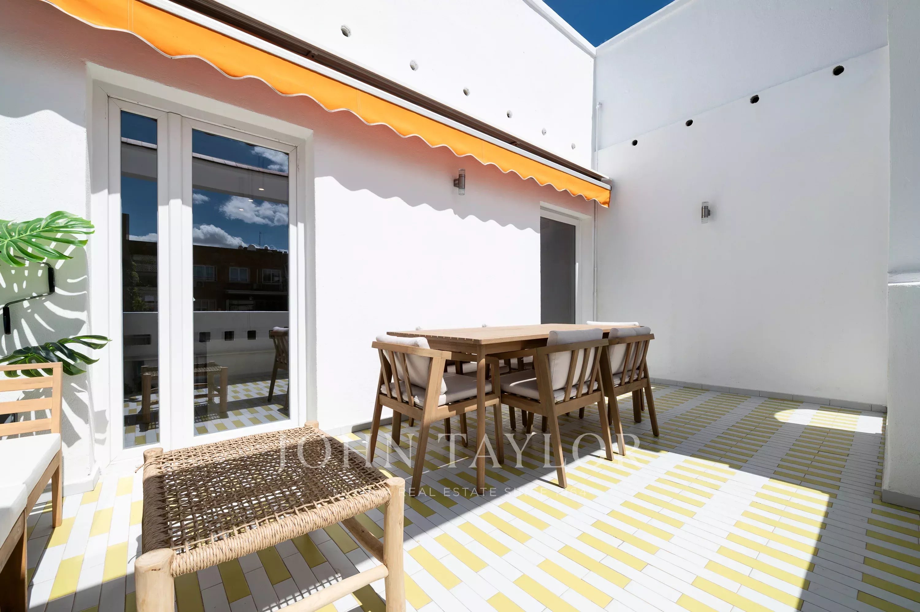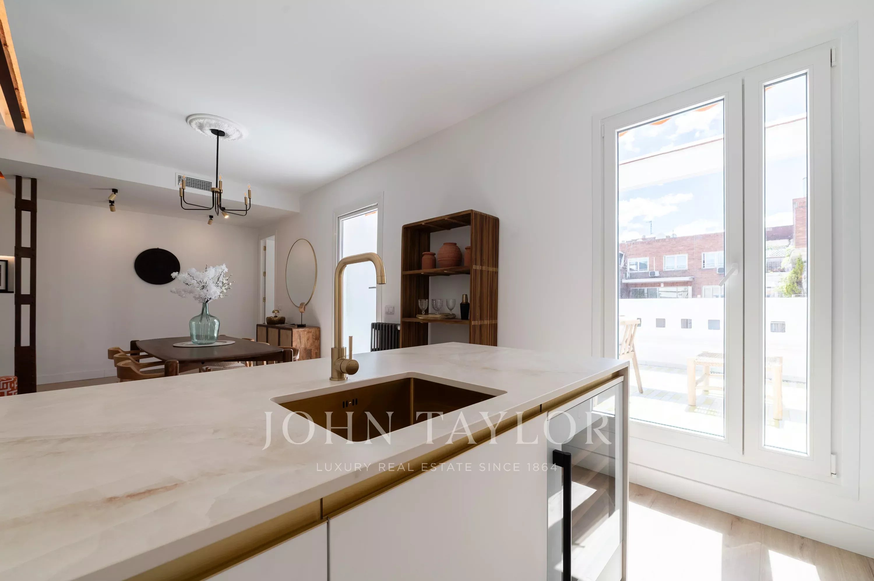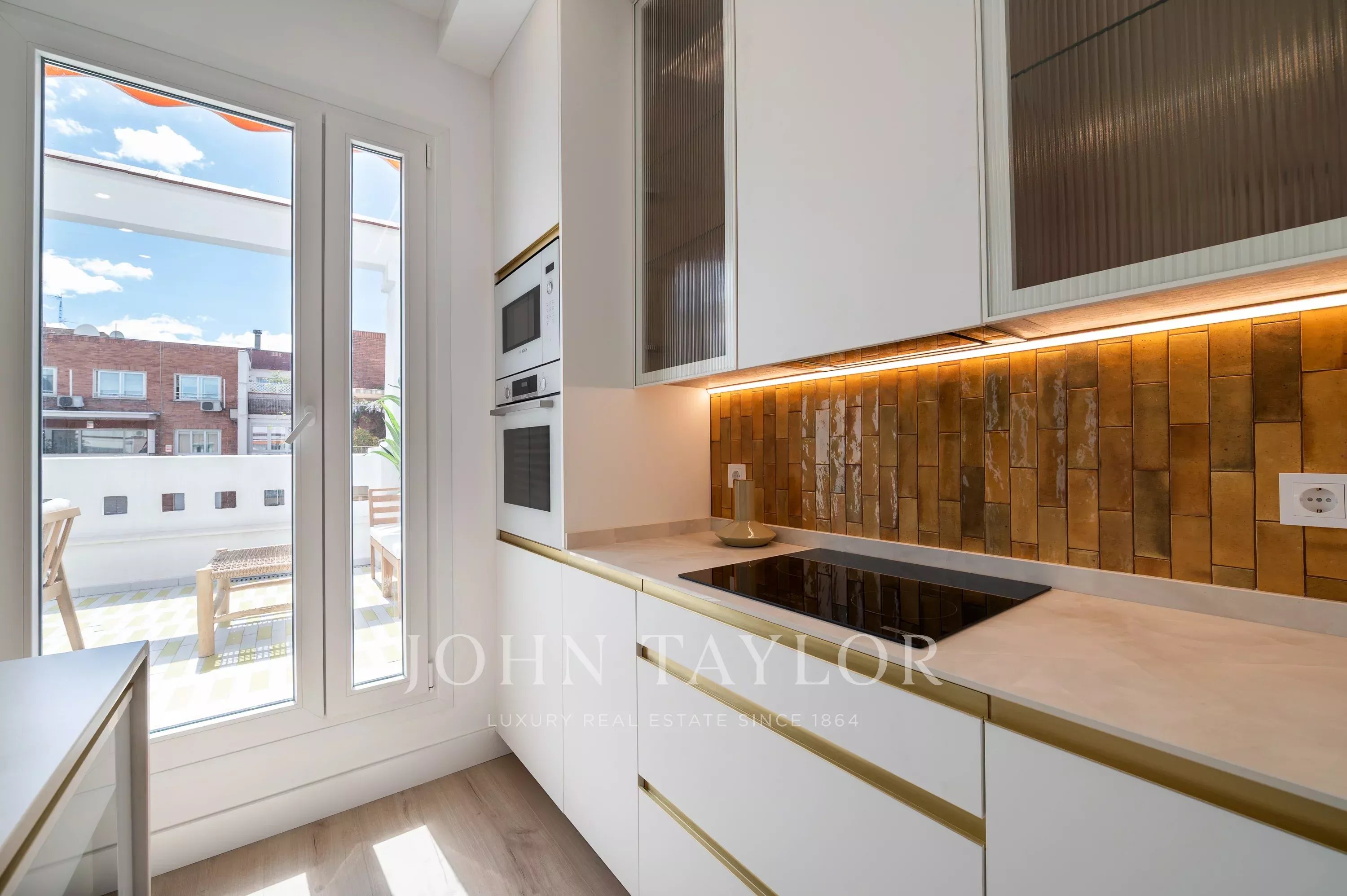 Exteriérový penthouse orientovaný na jih v klasické budově, kde přirozené světlo a klid zvyšují kvalitu bydlení v Madridu.