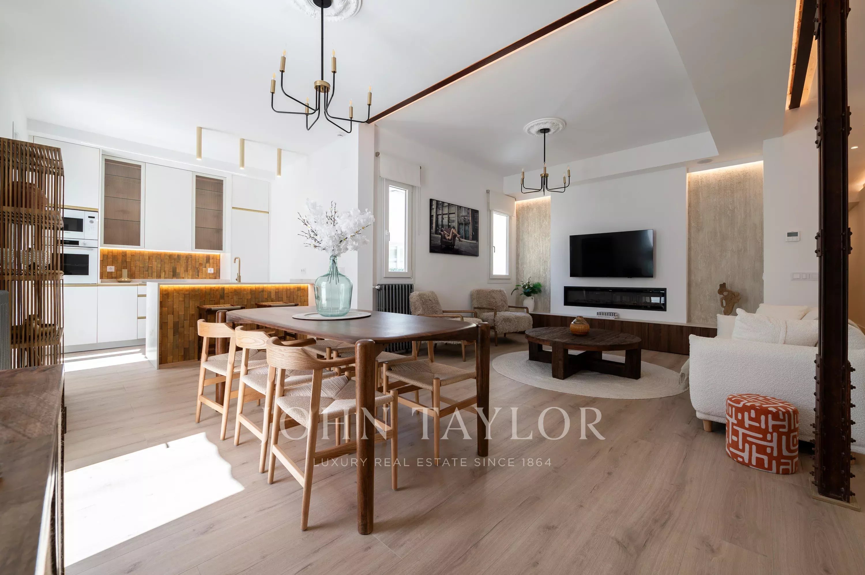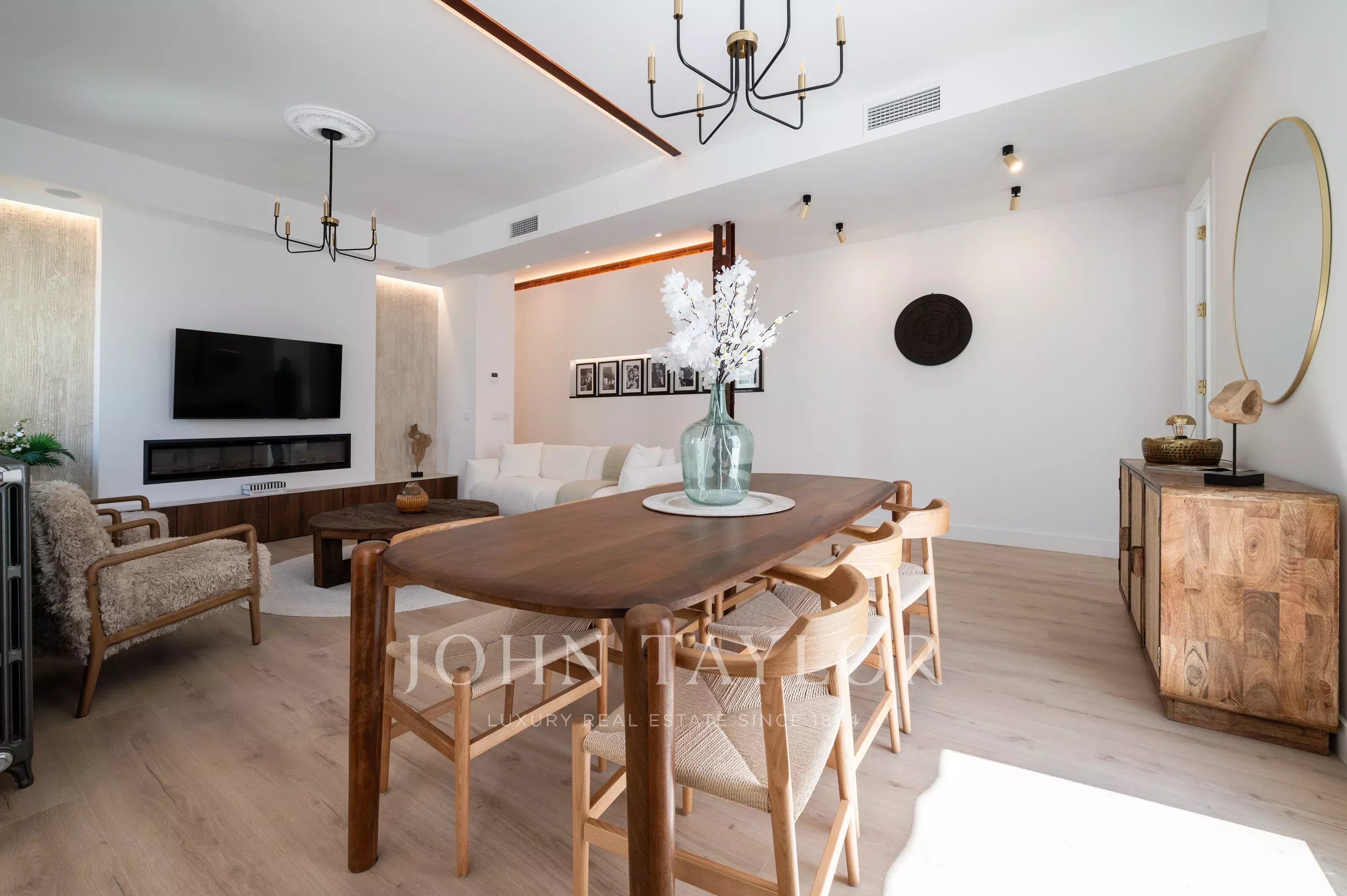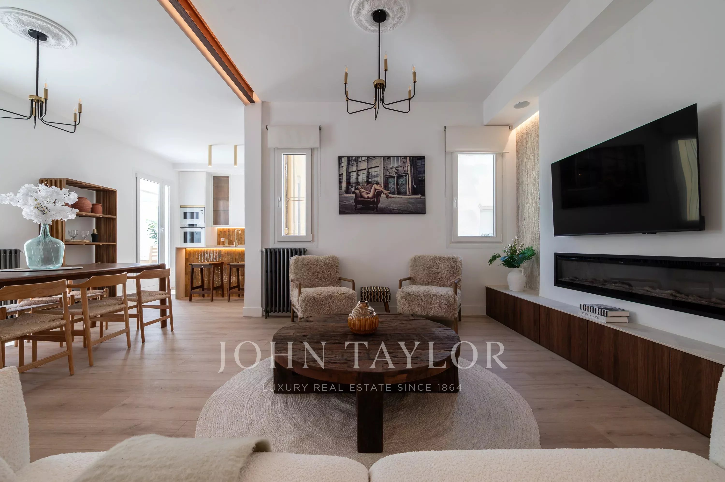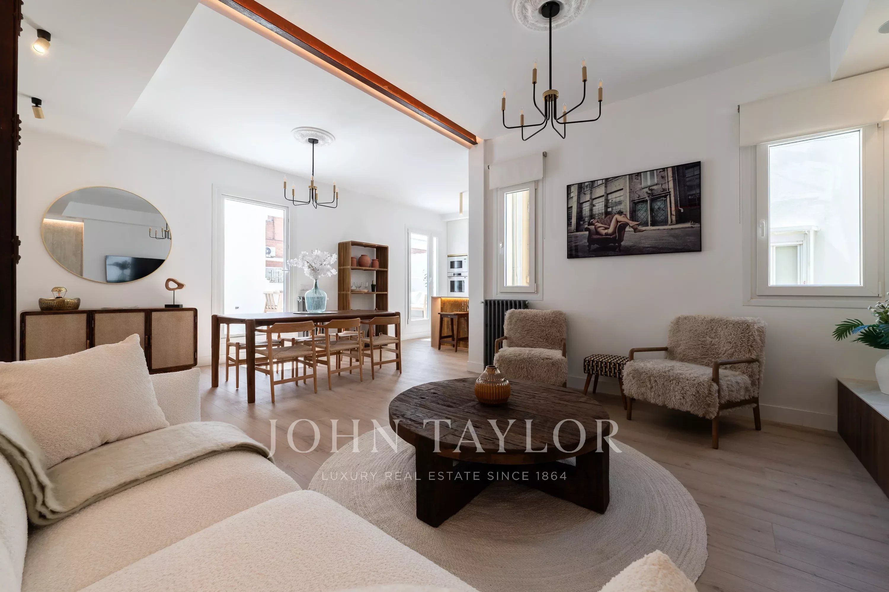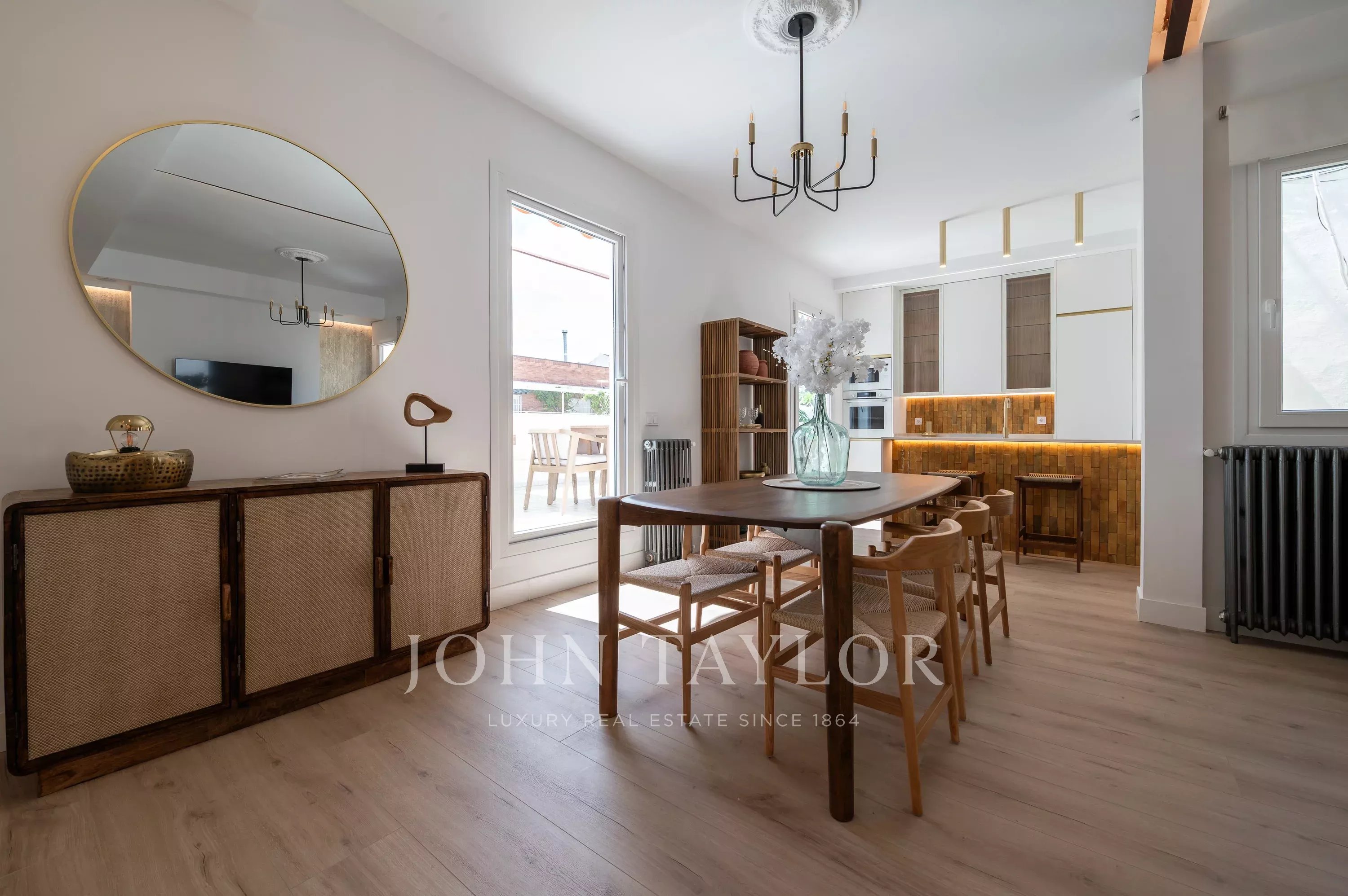 Exteriérový penthouse orientovaný na jih v klasické budově, kde přirozené světlo a klid zvyšují kvalitu bydlení v Madridu.