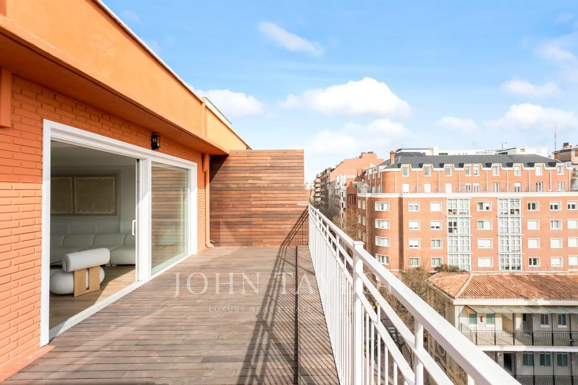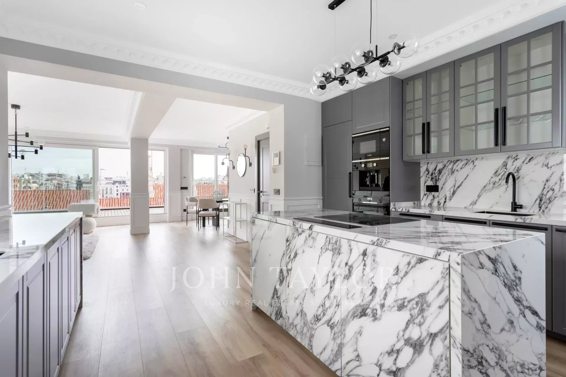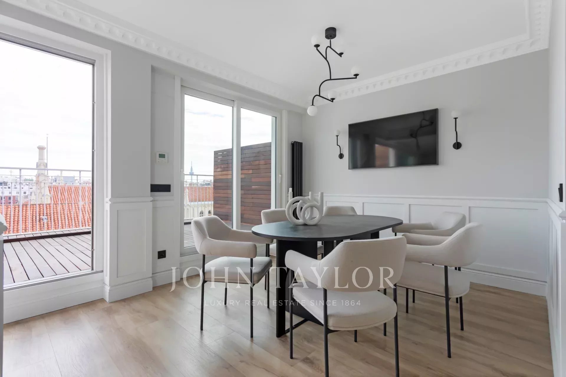 Venkovní prostor zabírá velký obývací pokoj s jídelnou a otevřenou kuchyní vybavenou špičkovými spotřebiči. Velké posuvné okno umožňuje vstup na velkou terasu, která má východní orientaci a bezkonkurenční panoramatický výhled na Colegio de Nuestra Señora del Pilar.