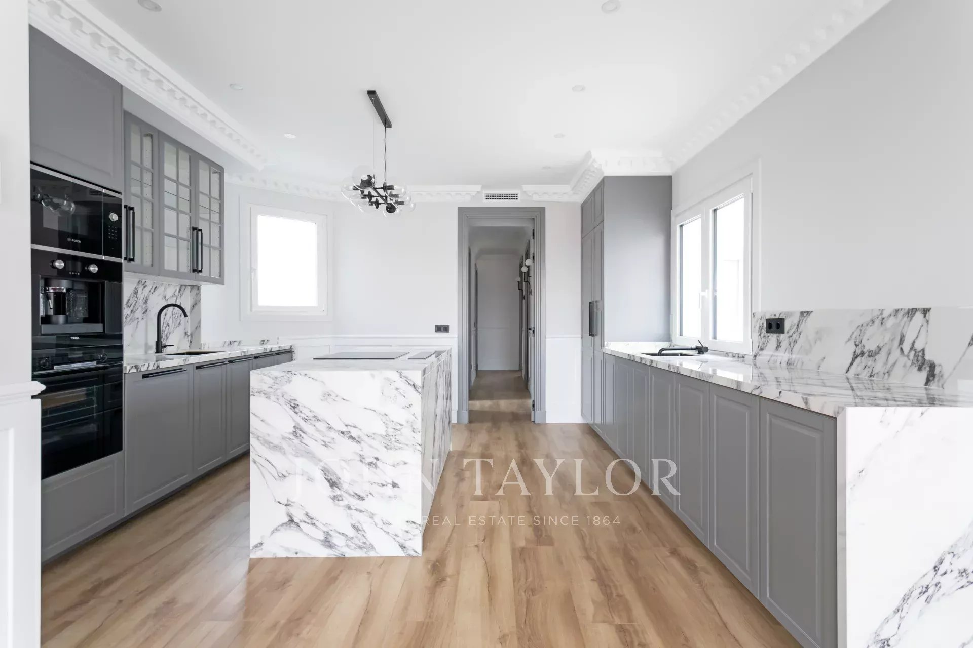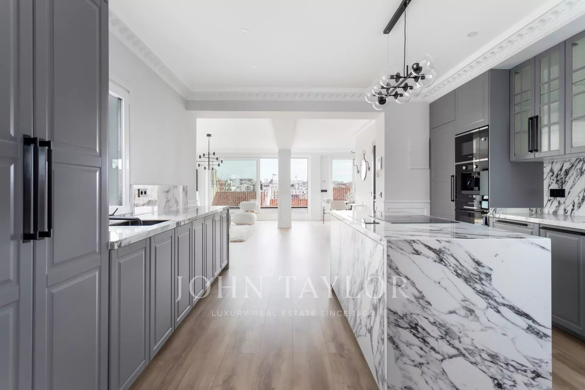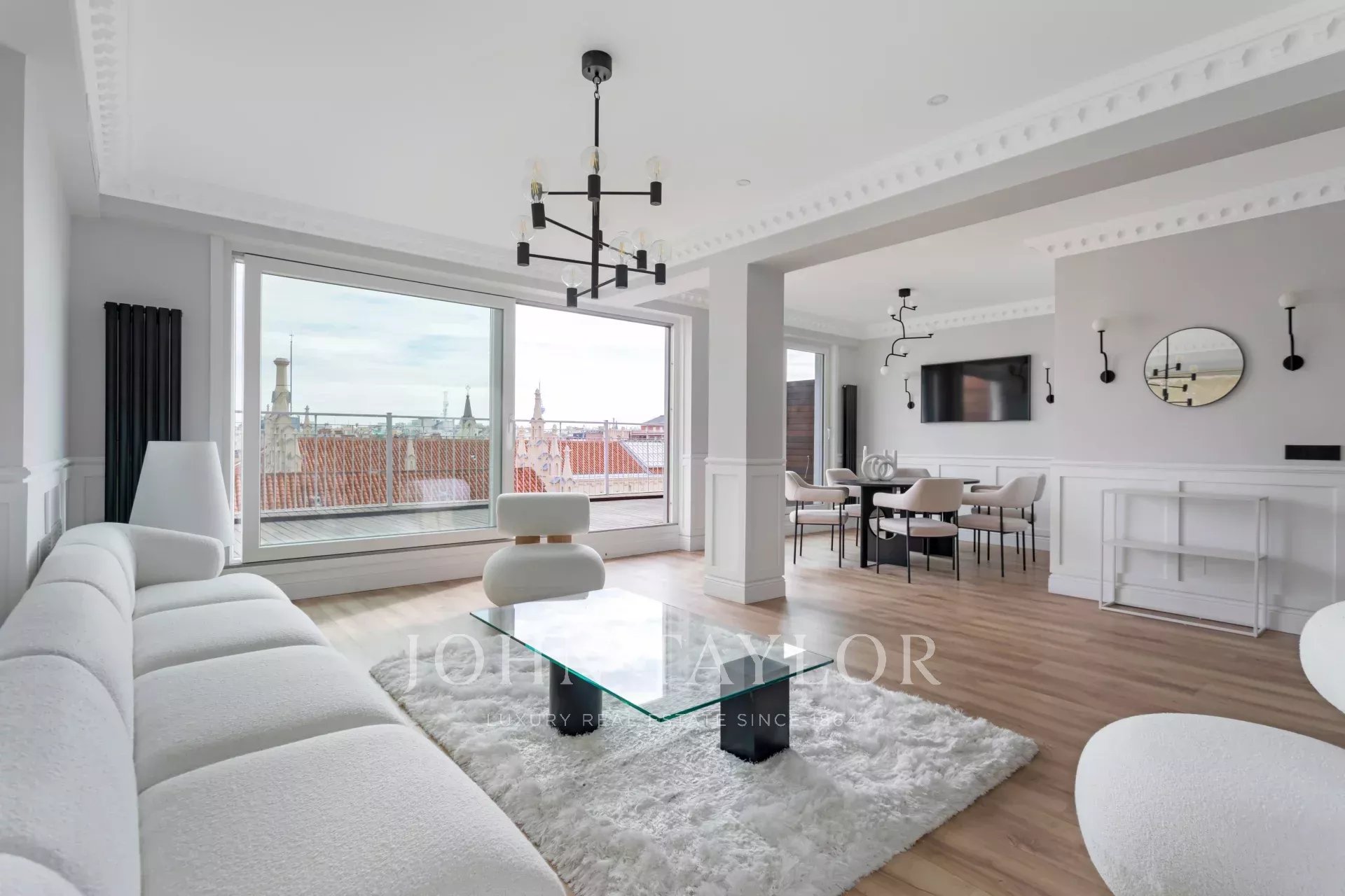 Venkovní prostor zabírá velký obývací pokoj s jídelnou a otevřenou kuchyní vybavenou špičkovými spotřebiči. Velké posuvné okno umožňuje vstup na velkou terasu, která má východní orientaci a bezkonkurenční panoramatický výhled na Colegio de Nuestra Señora del Pilar.