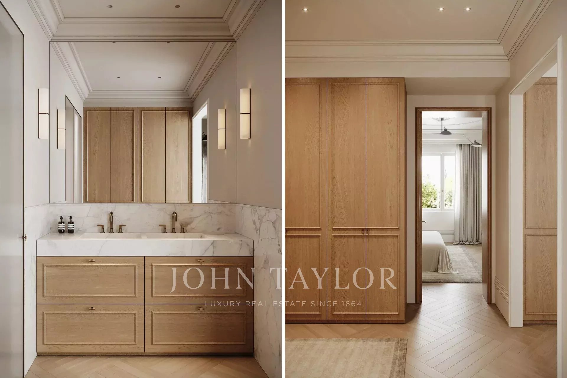 Byt určený ke kompletní rekonstrukci vyniká velkorysými objemy a prakticky otevřenou dispozicí, která umožňuje flexibilní a elegantní přerozdělení. Projekt snadno pojme tři nebo čtyři ložnice s vlastním příslušenstvím, toaletu pro hosty, služební ložnici, prádelnu a velký společenský prostor koncipovaný jako velký souvislý prostor.