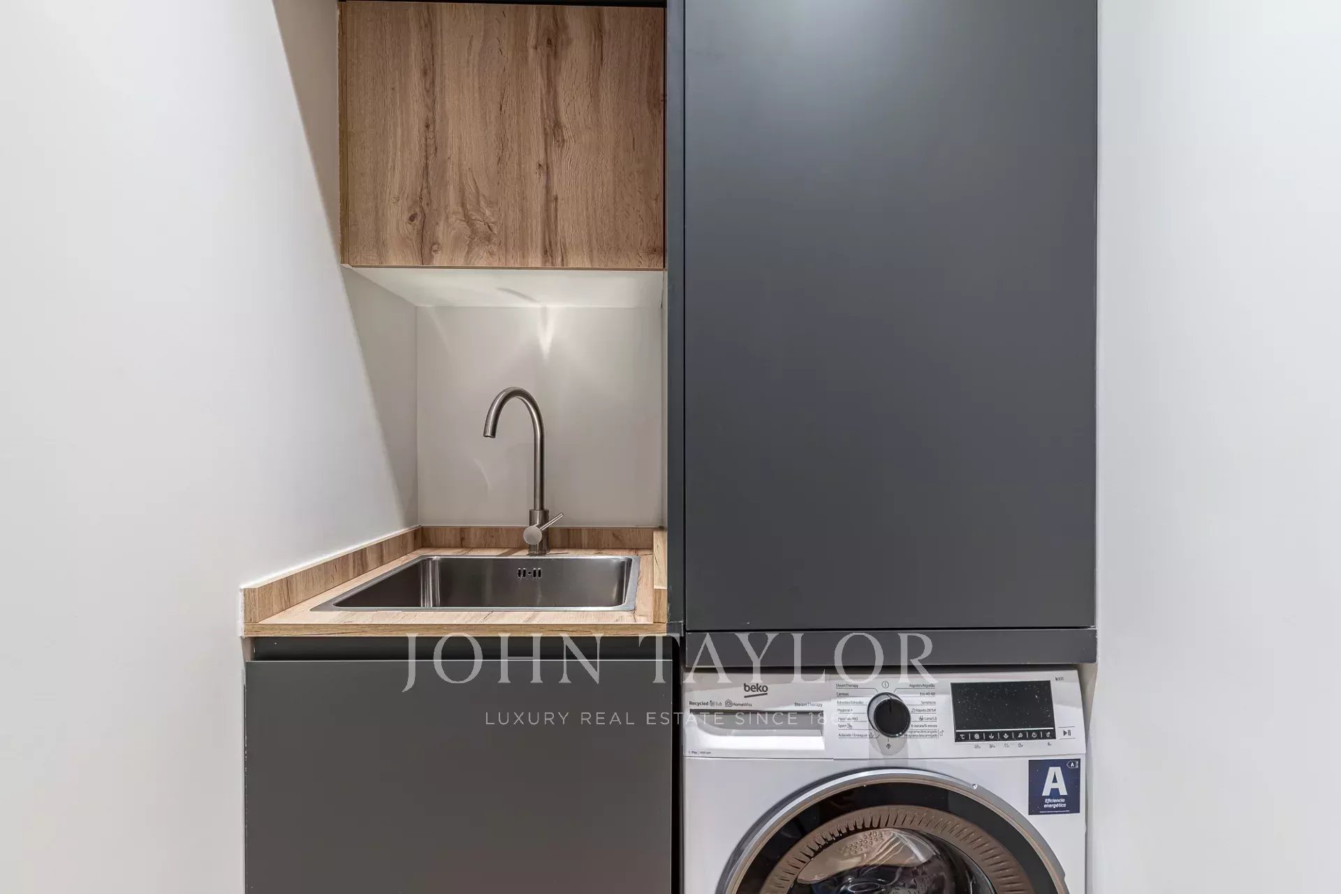 Nemovitost je rozdělena na dvě prostorné ložnice s vlastní koupelnou, toaletu pro hosty a světlý společenský prostor, který kombinuje obývací pokoj a jídelnu v sofistikované a příjemné atmosféře. Detaily rekonstrukce spolu s vysokými stropy a kvalitními povrchovými úpravami vytvářejí elegantní prostor určený pro pohodlí.