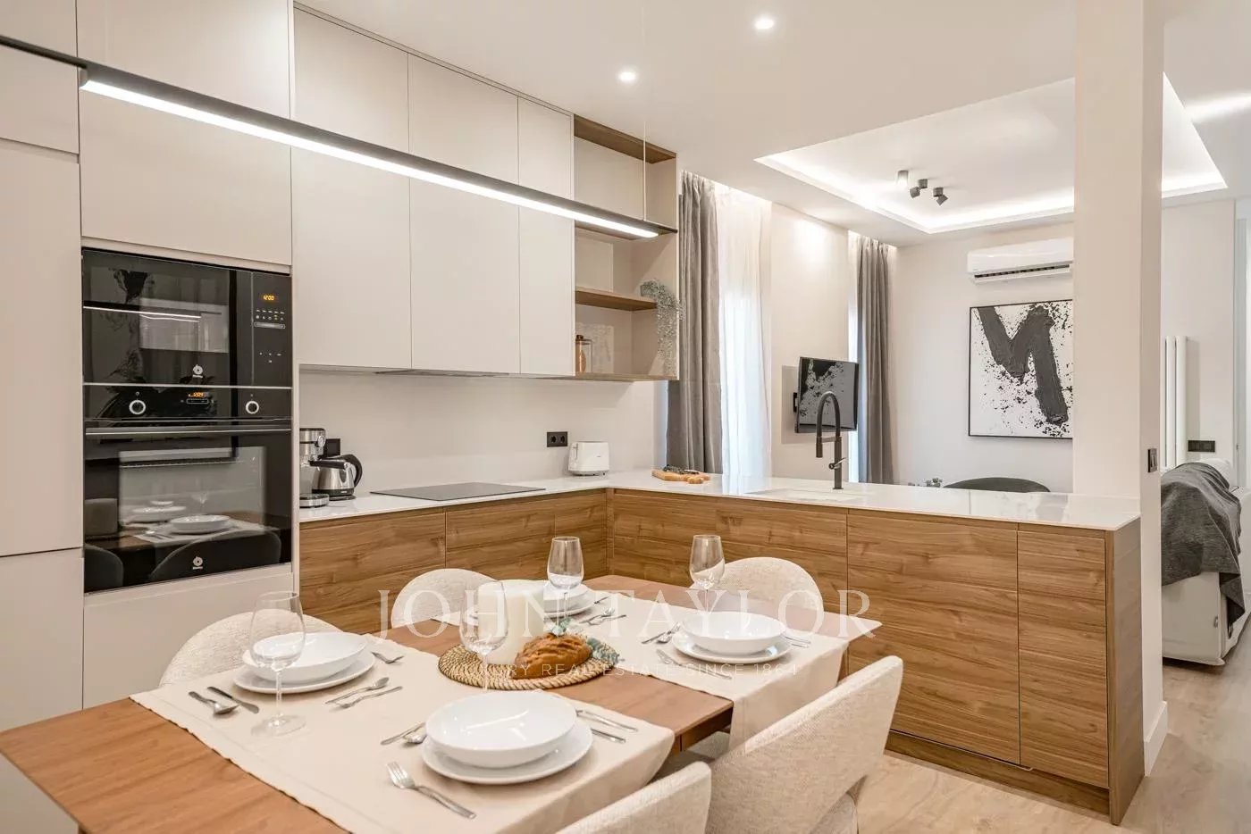 Nemovitost má tři prostorné ložnice, z nichž jedna má vlastní koupelnu, a celkem tři koupelny, všechny navržené z vysoce kvalitních materiálů. Kuchyně, plně vybavená špičkovými spotřebiči, je ideální pro ty, kteří mají rádi kulinářské umění ve funkčním a moderním prostředí.