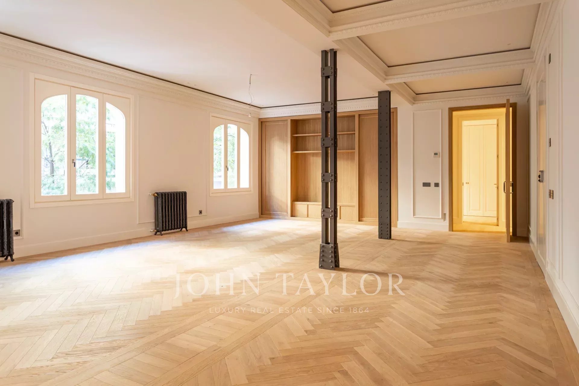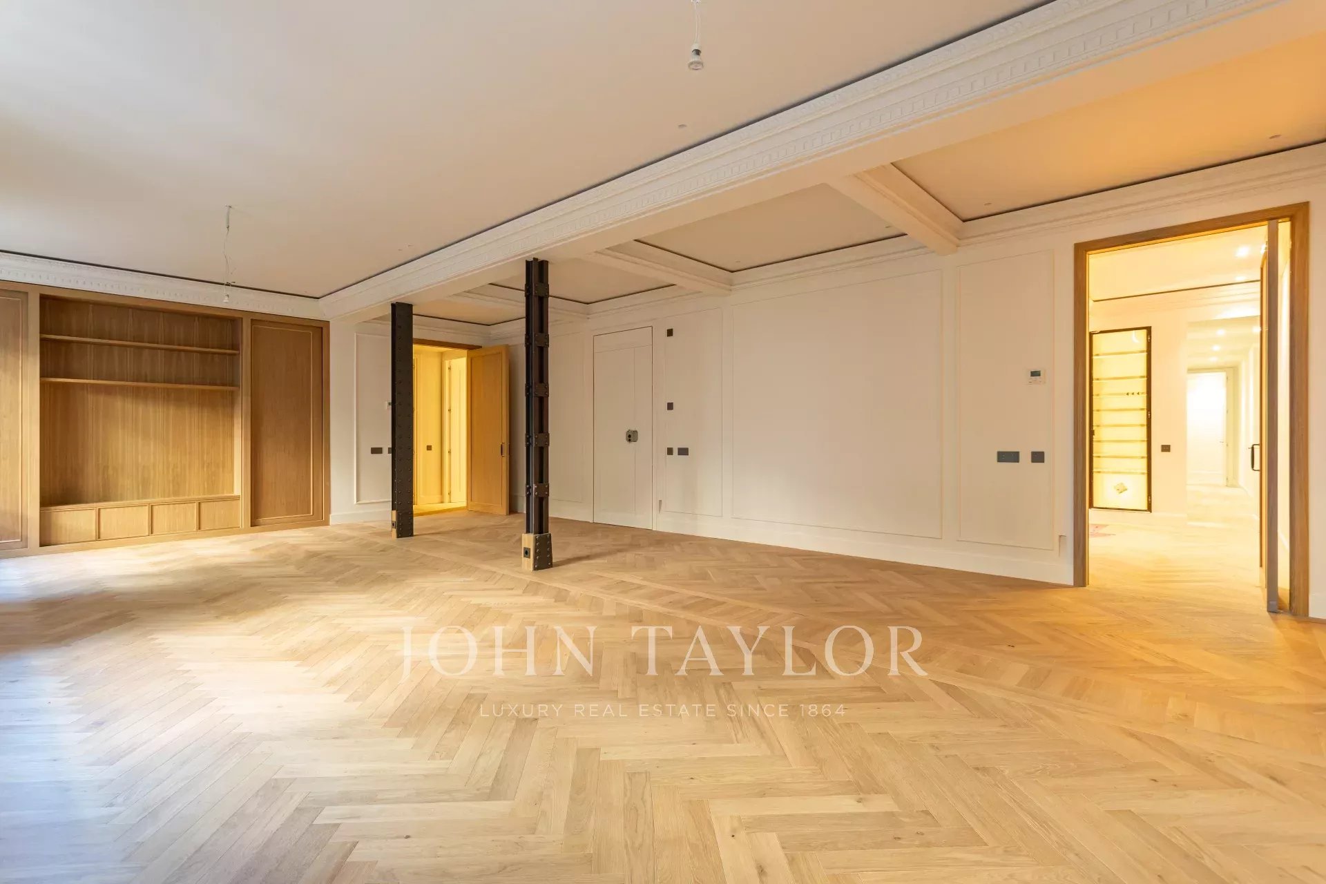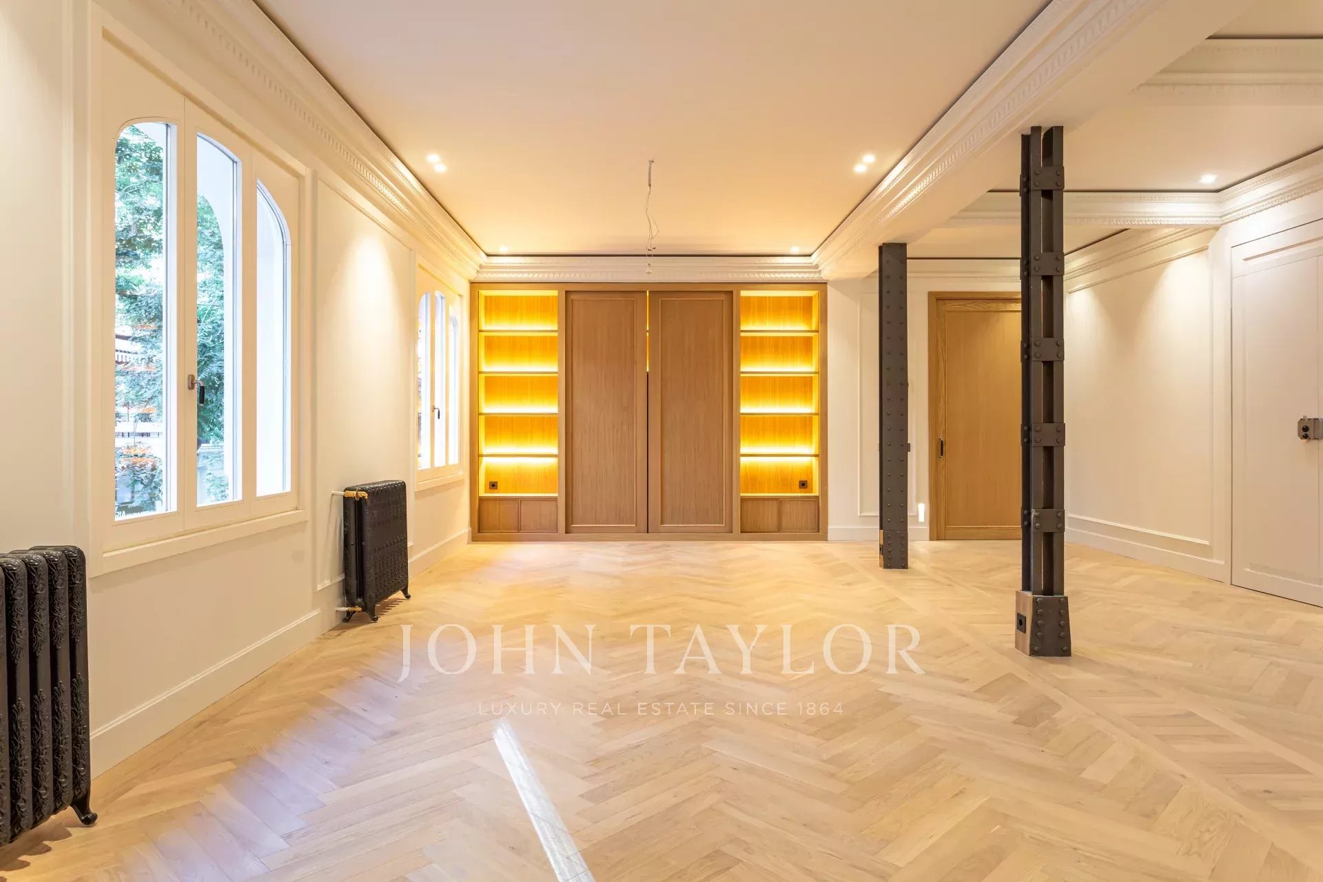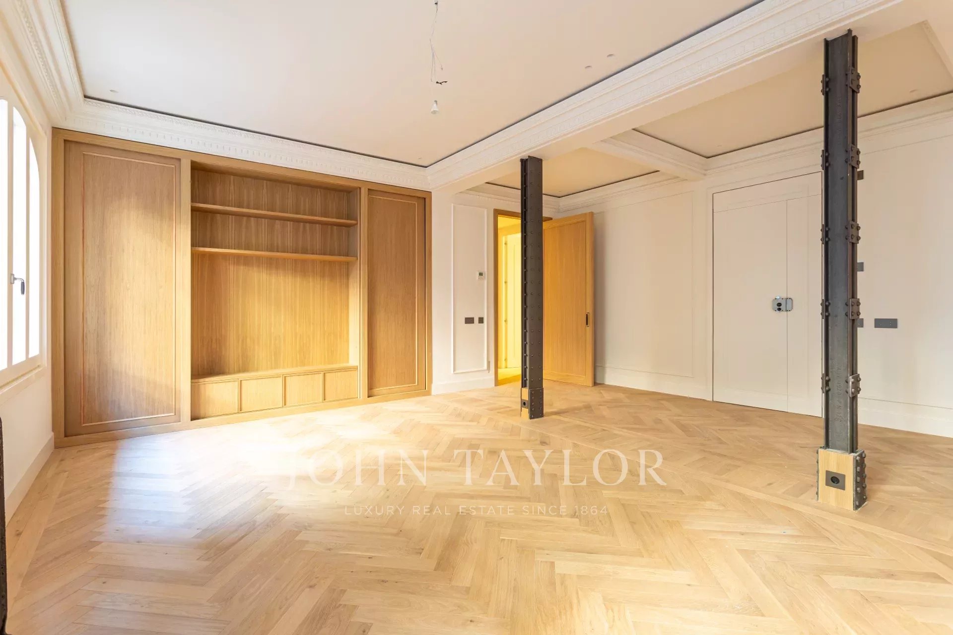 Obývací pokoj a jídelna jsou velmi prostorné, v otevřeném prostoru s původními železnými sloupy a dubovou skříní na knihy a televizi vyrobenou na zakázku. Byt má 4 kompletní a prostorné ložnice s vestavěnými skříněmi. V koupelnách je mramor a vysoce kvalitní vybavení. Kuchyně byla navržena firmou Gunni&Trentino a je plně vybavena spotřebiči Miele, jak si kategorie této nemovitosti zaslouží. Kuchyně je částečně vestavěná a má samostatnou prádelnu, vybavenou pračkou a sušičkou, prostorem na žehlení a sušákem.