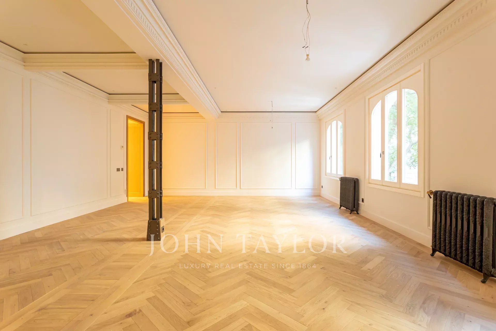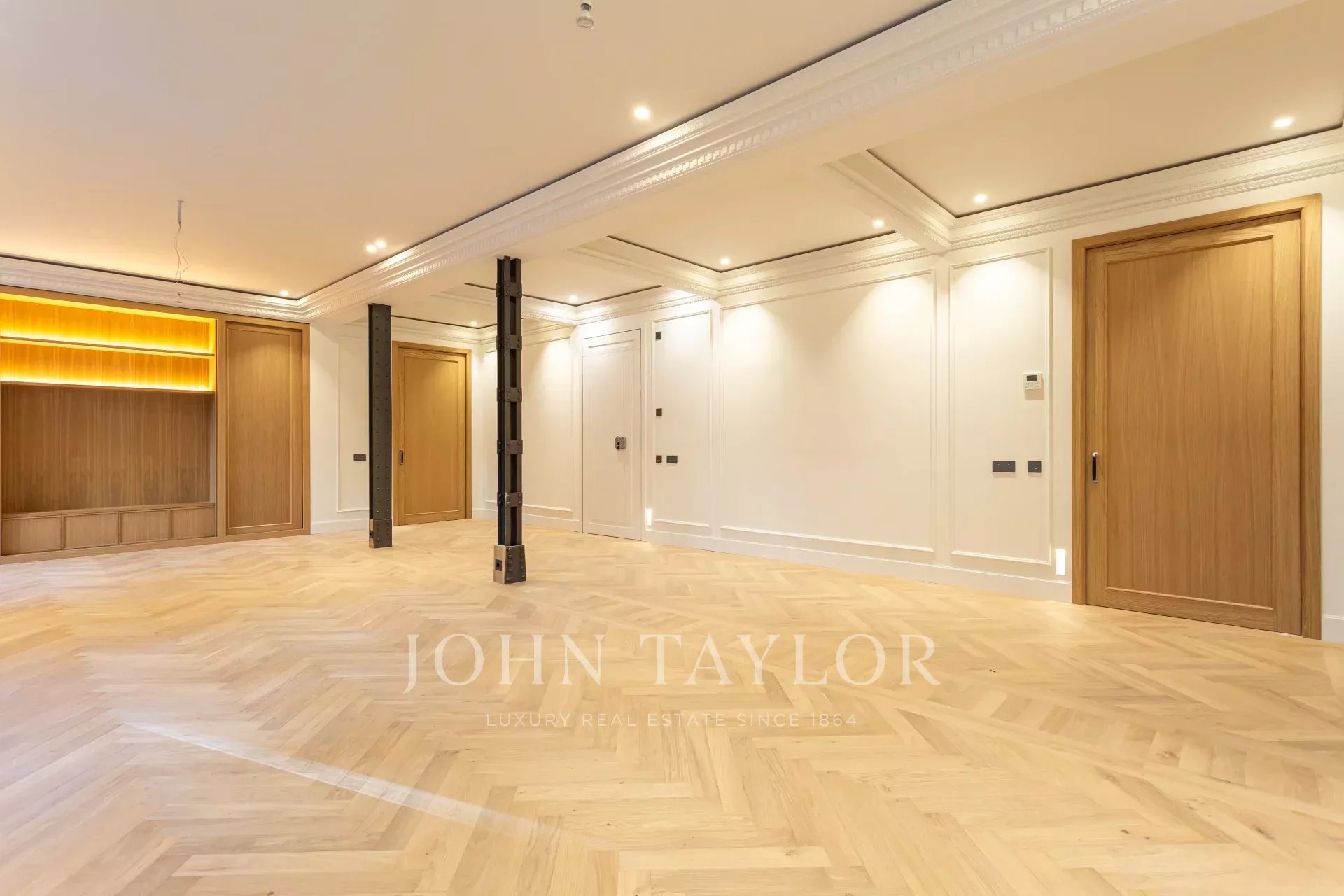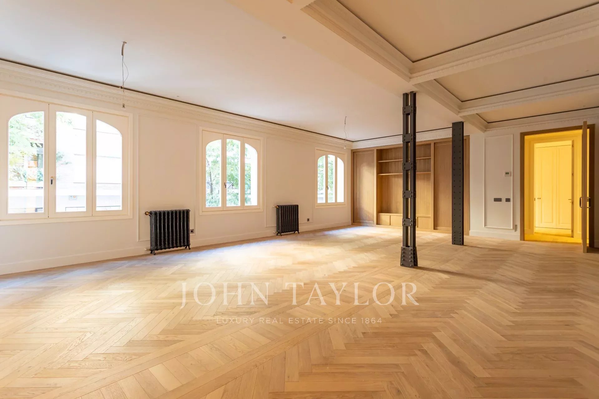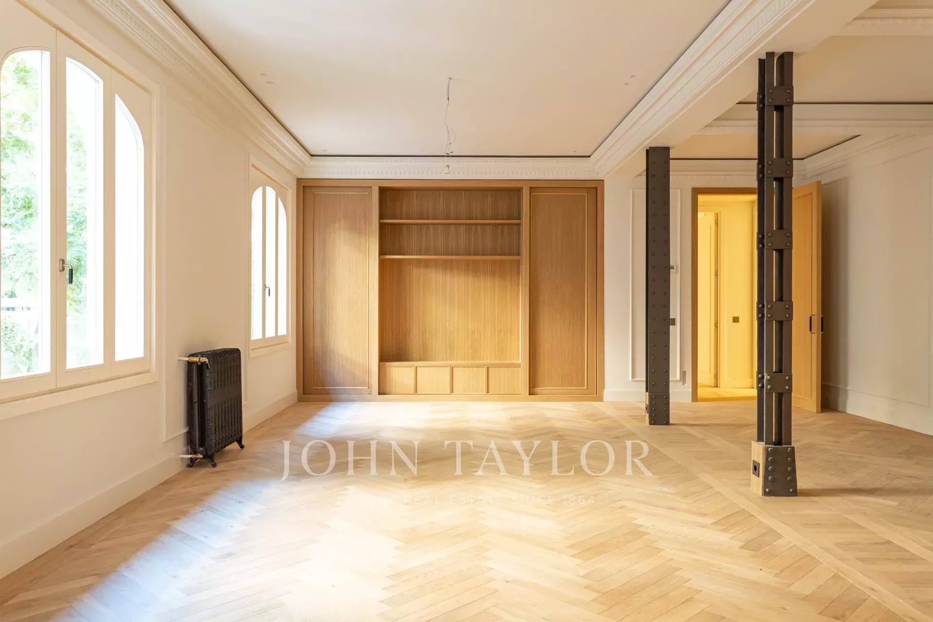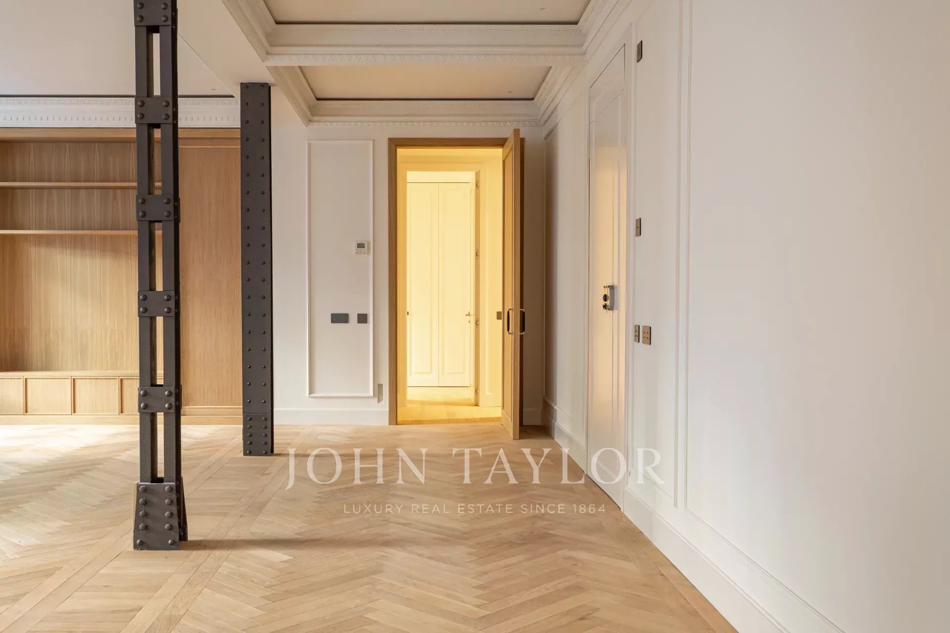 Obývací pokoj a jídelna jsou velmi prostorné, v otevřeném prostoru s původními železnými sloupy a dubovou skříní na knihy a televizi vyrobenou na zakázku. Byt má 4 kompletní a prostorné ložnice s vestavěnými skříněmi. V koupelnách je mramor a vysoce kvalitní vybavení. Kuchyně byla navržena firmou Gunni&Trentino a je plně vybavena spotřebiči Miele, jak si kategorie této nemovitosti zaslouží. Kuchyně je částečně vestavěná a má samostatnou prádelnu, vybavenou pračkou a sušičkou, prostorem na žehlení a sušákem.