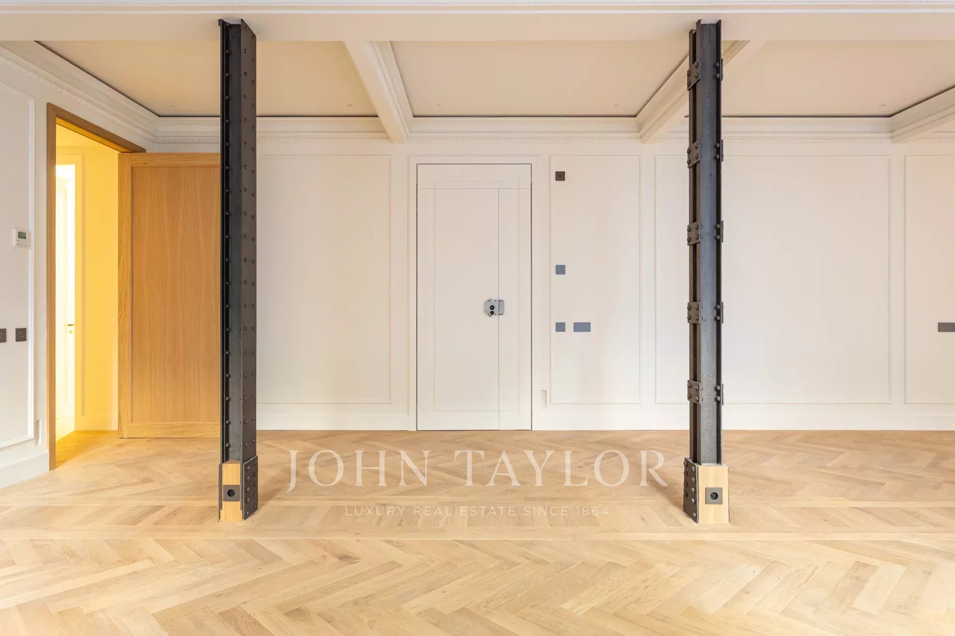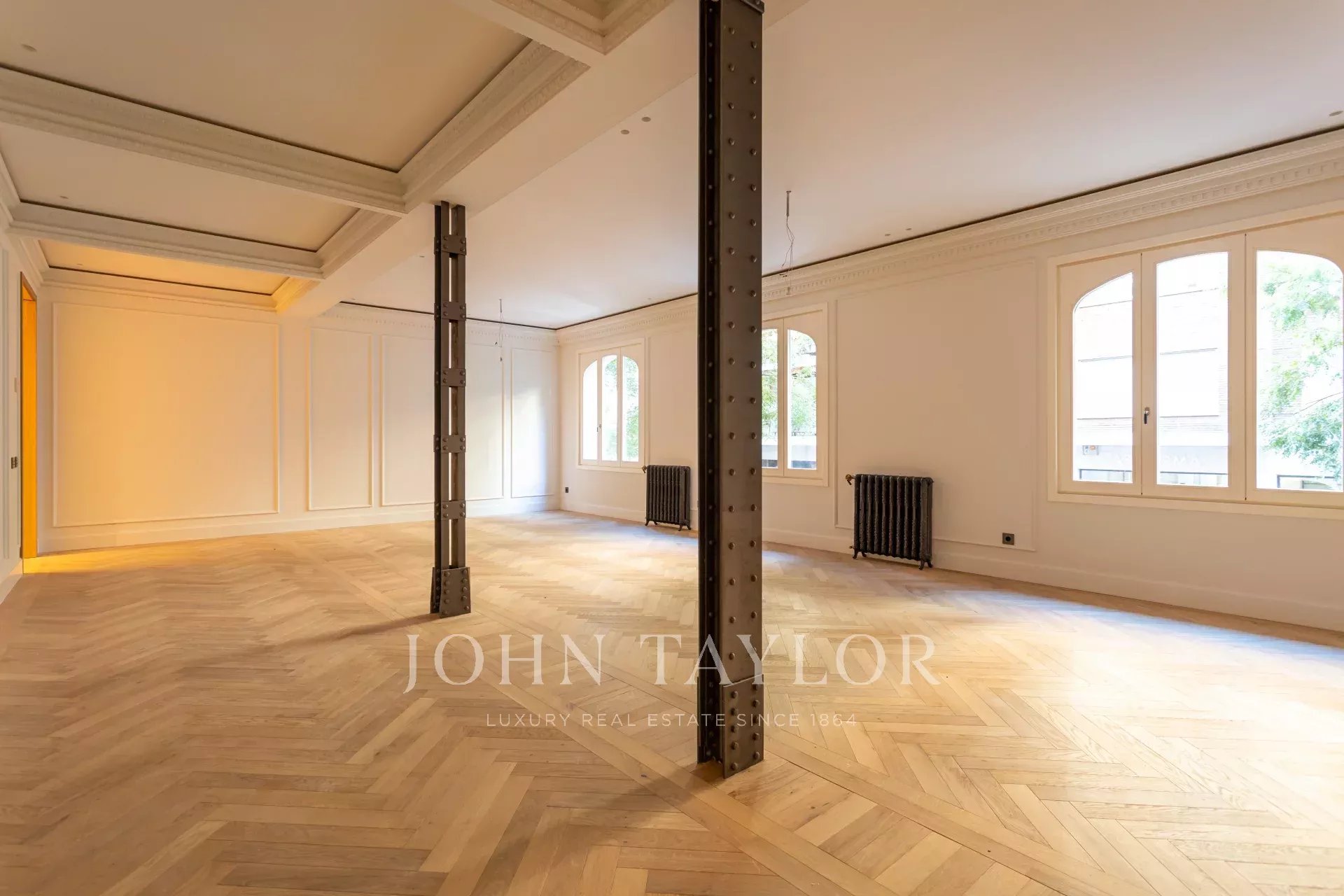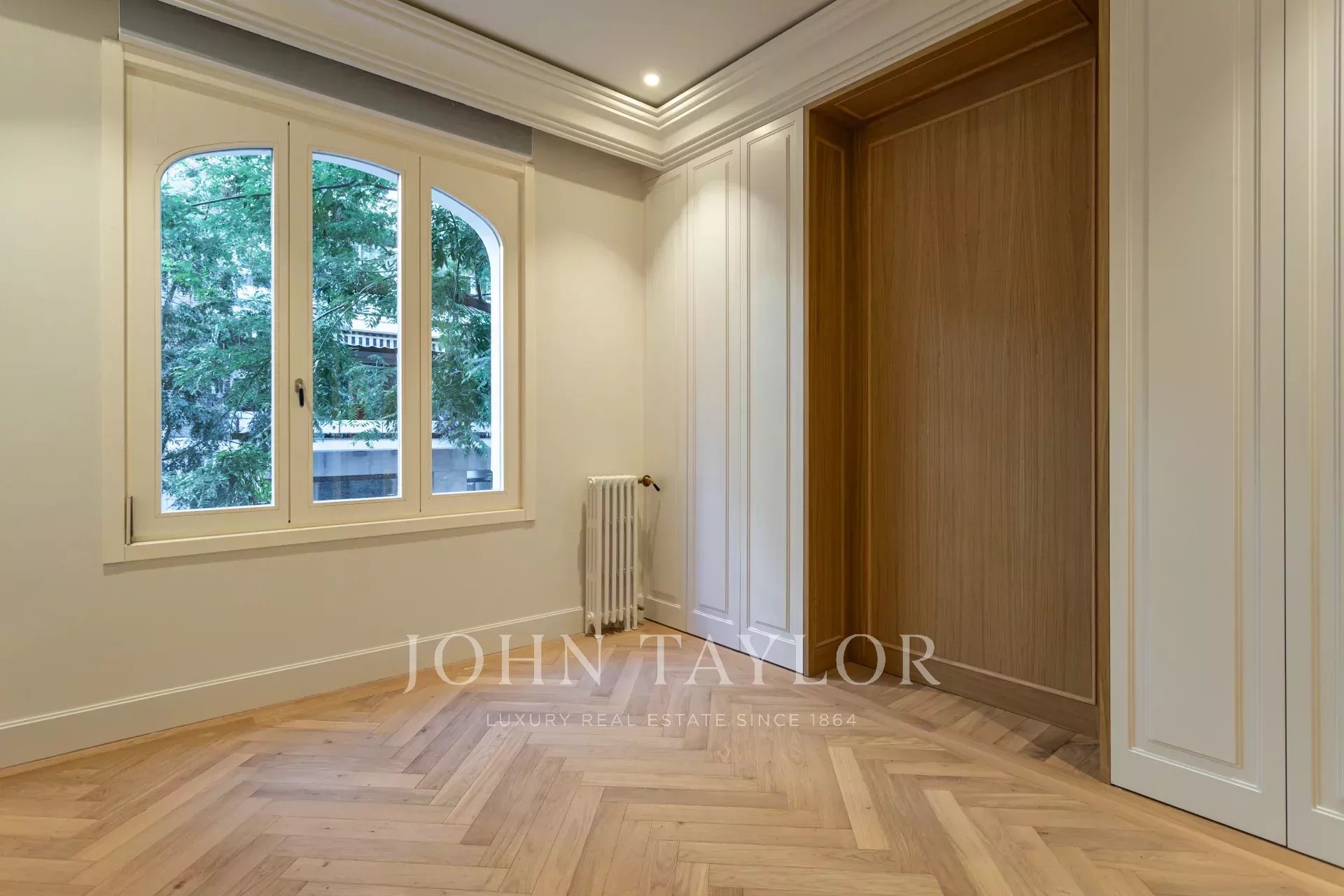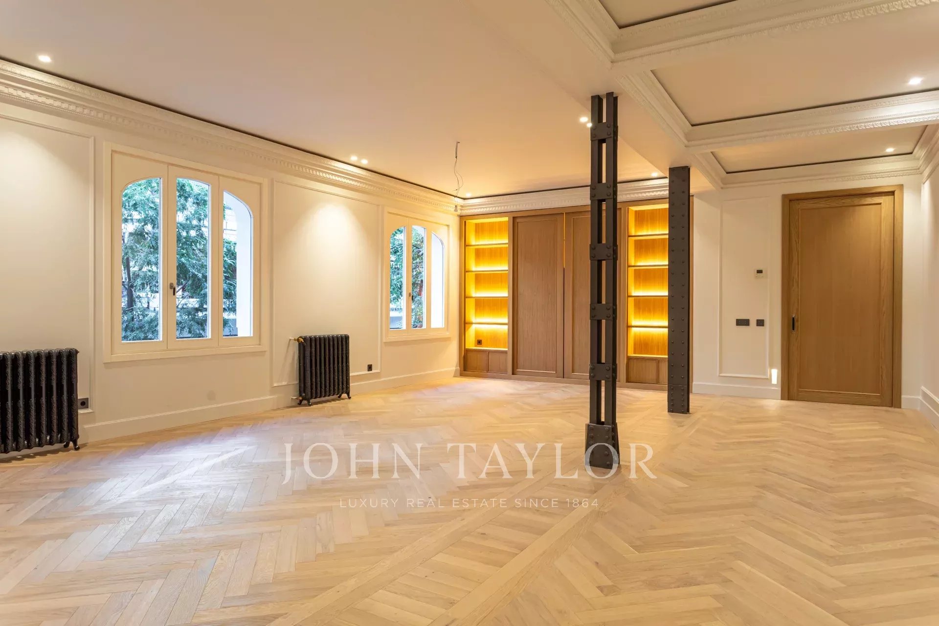 Obývací pokoj a jídelna jsou velmi prostorné, v otevřeném prostoru s původními železnými sloupy a dubovou skříní na knihy a televizi vyrobenou na zakázku. Byt má 4 kompletní a prostorné ložnice s vestavěnými skříněmi. V koupelnách je mramor a vysoce kvalitní vybavení. Kuchyně byla navržena firmou Gunni&Trentino a je plně vybavena spotřebiči Miele, jak si kategorie této nemovitosti zaslouží. Kuchyně je částečně vestavěná a má samostatnou prádelnu, vybavenou pračkou a sušičkou, prostorem na žehlení a sušákem.