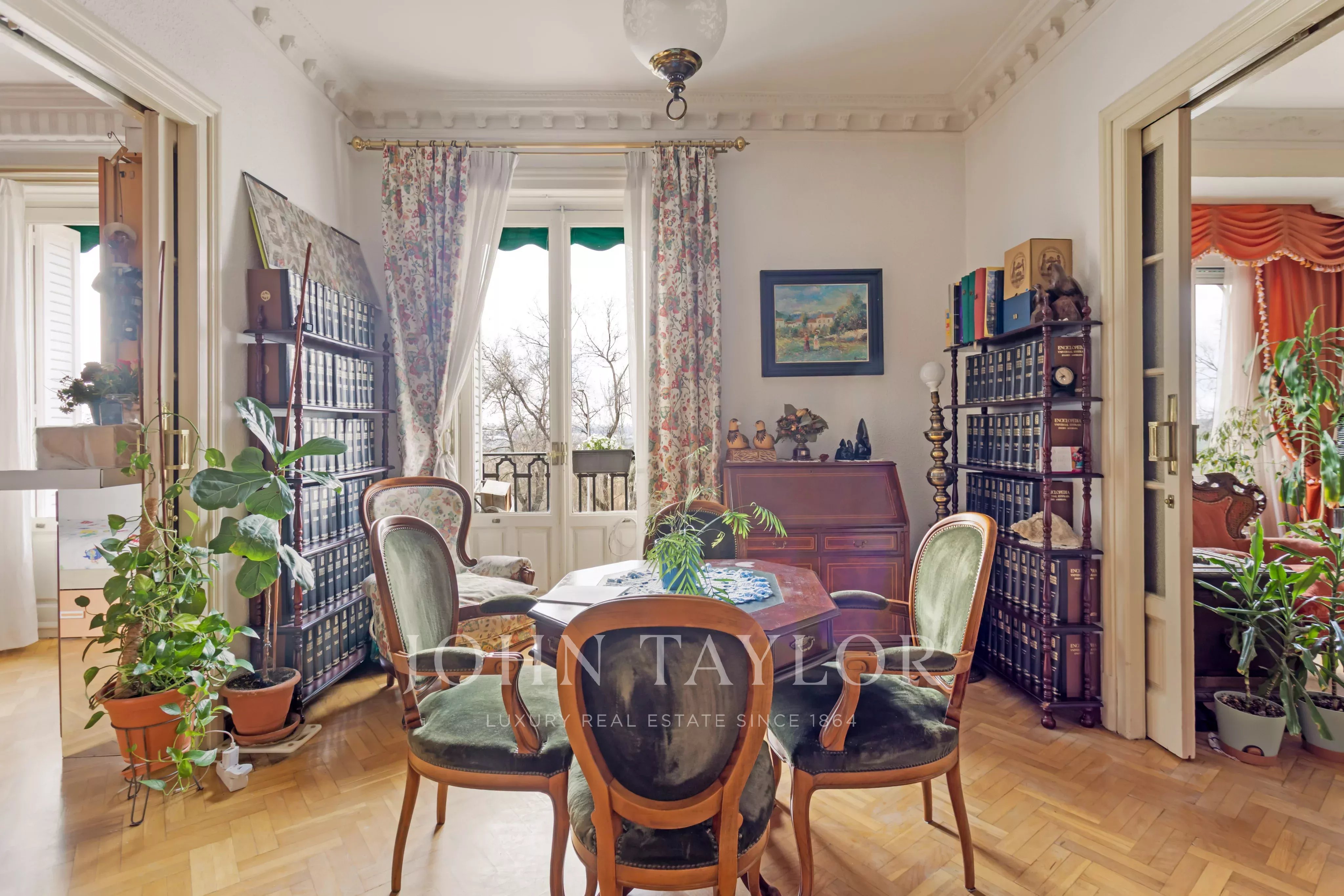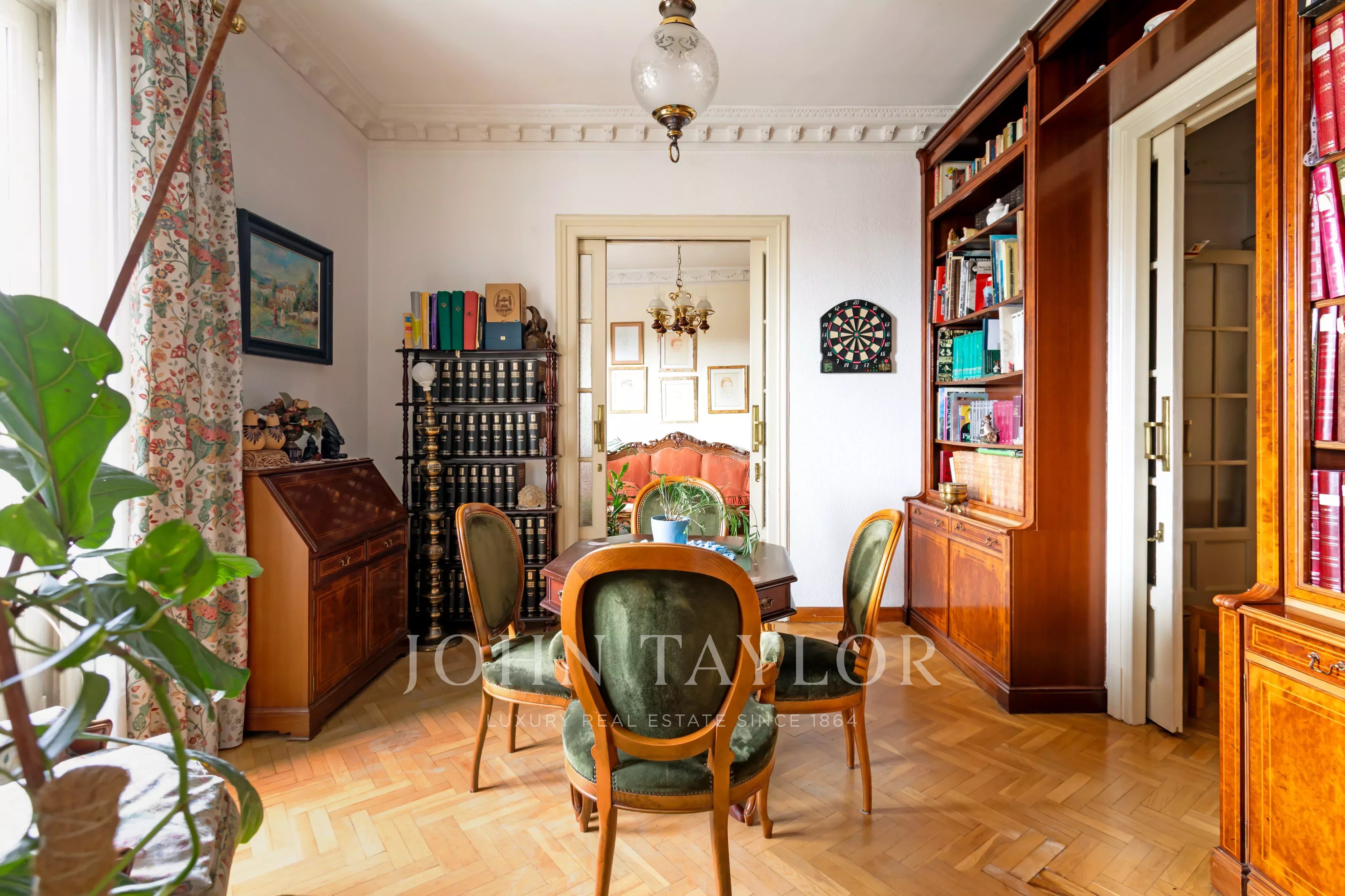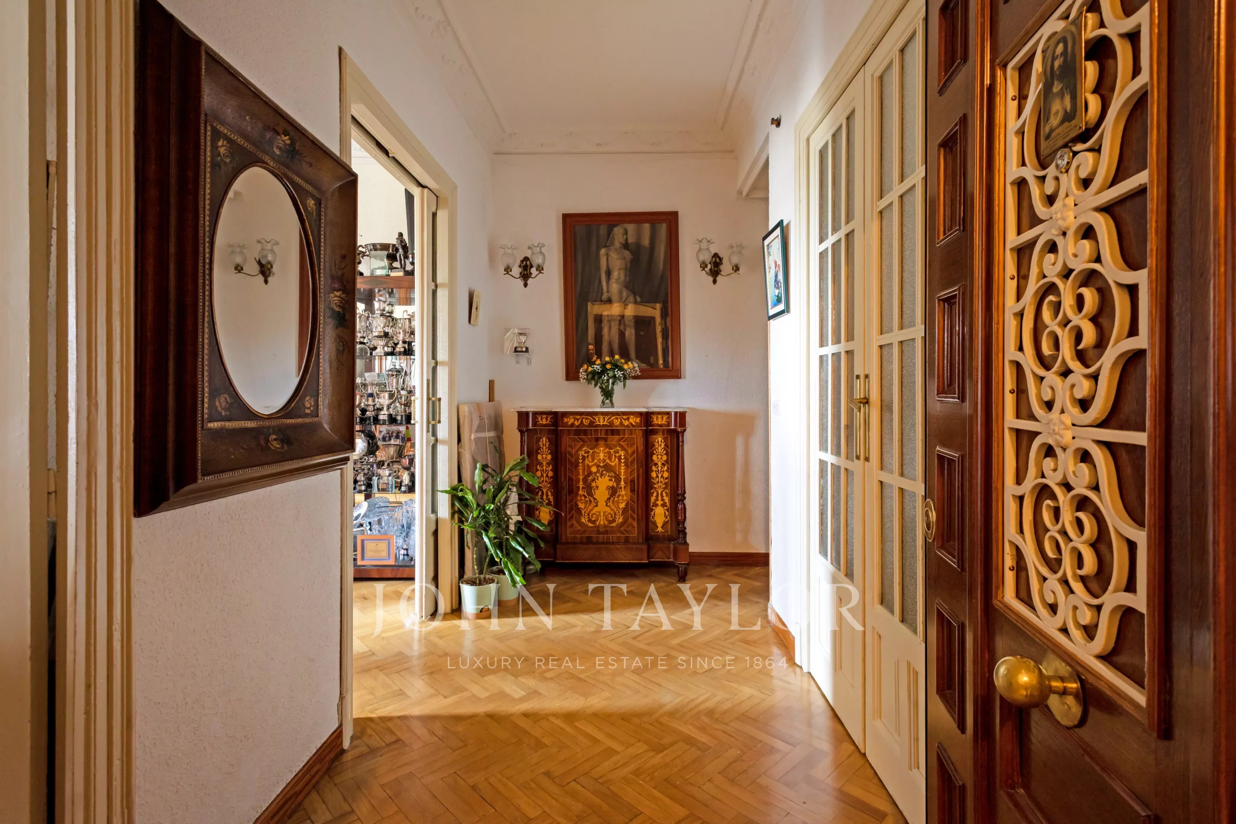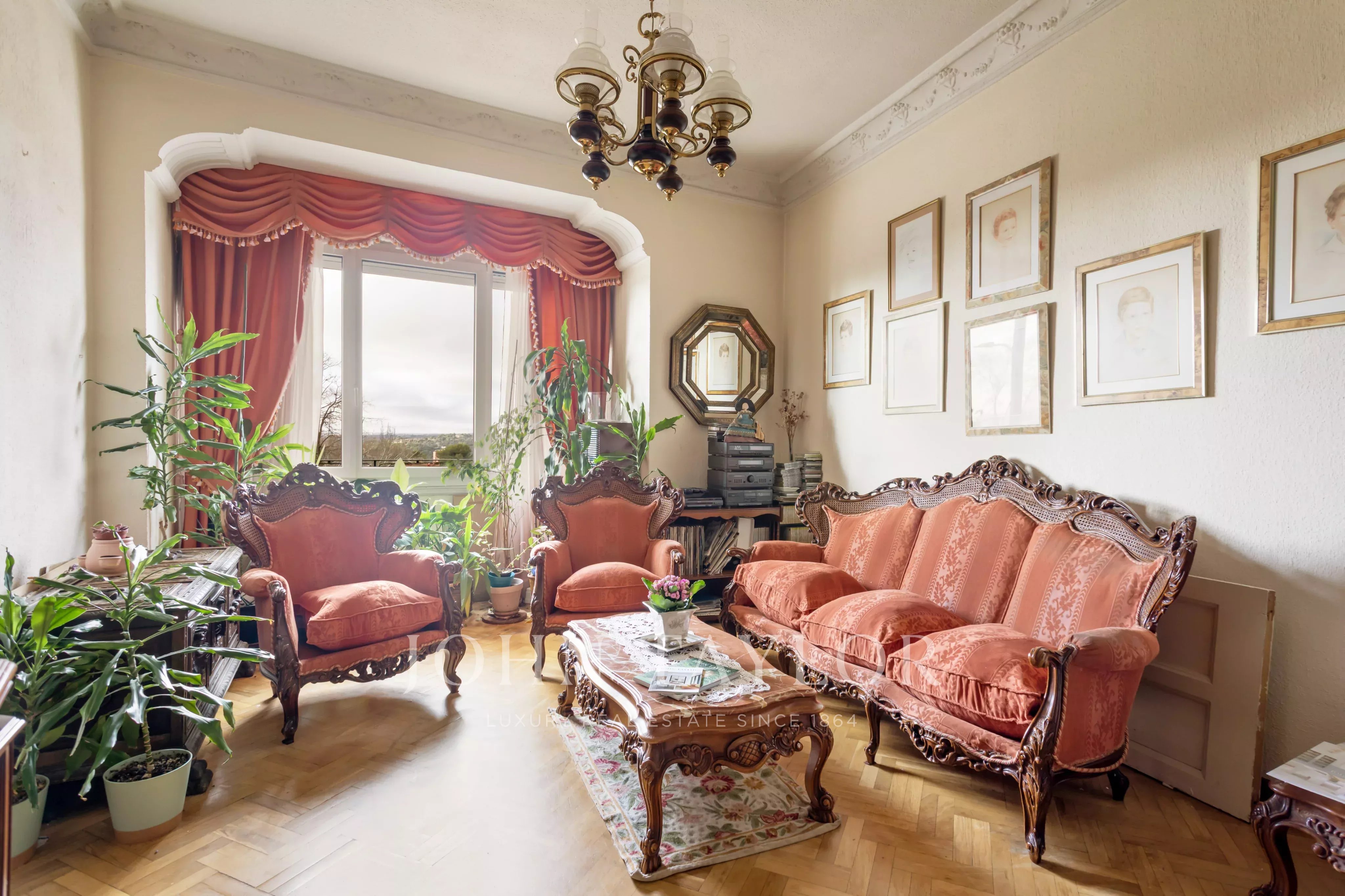 Nemovitost vyniká svým majestátním charakterem s vysokými stropy, klasickými lištami a architekturou, která evokuje eleganci autentického palácového bytu. Obývací pokoj, prostorný a zalitý přirozeným světlem, se otevírá na impozantní balkony s přímým výhledem do parku, chráněného prostoru, který zaručuje absolutní soukromí a časem neměnný výhled.