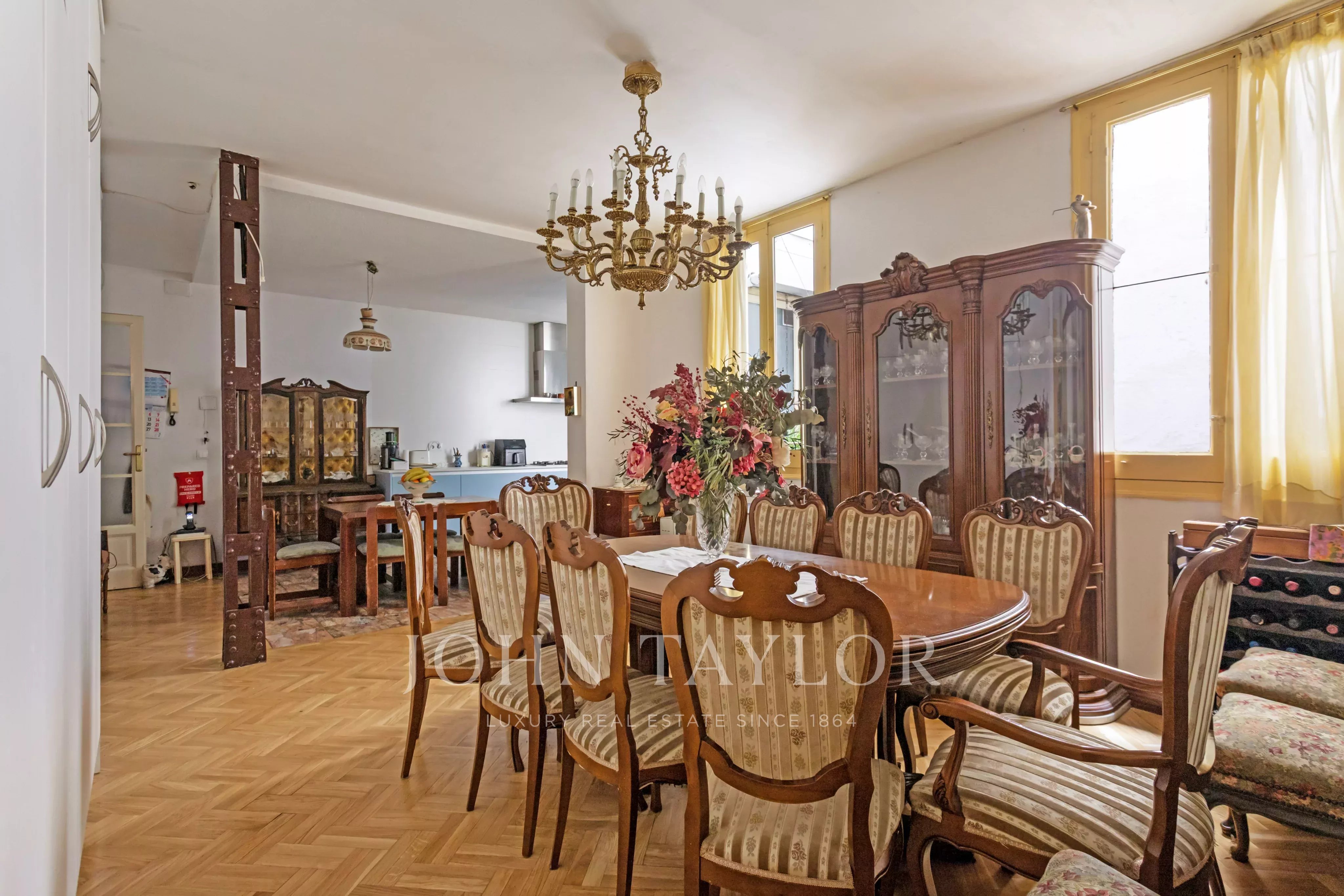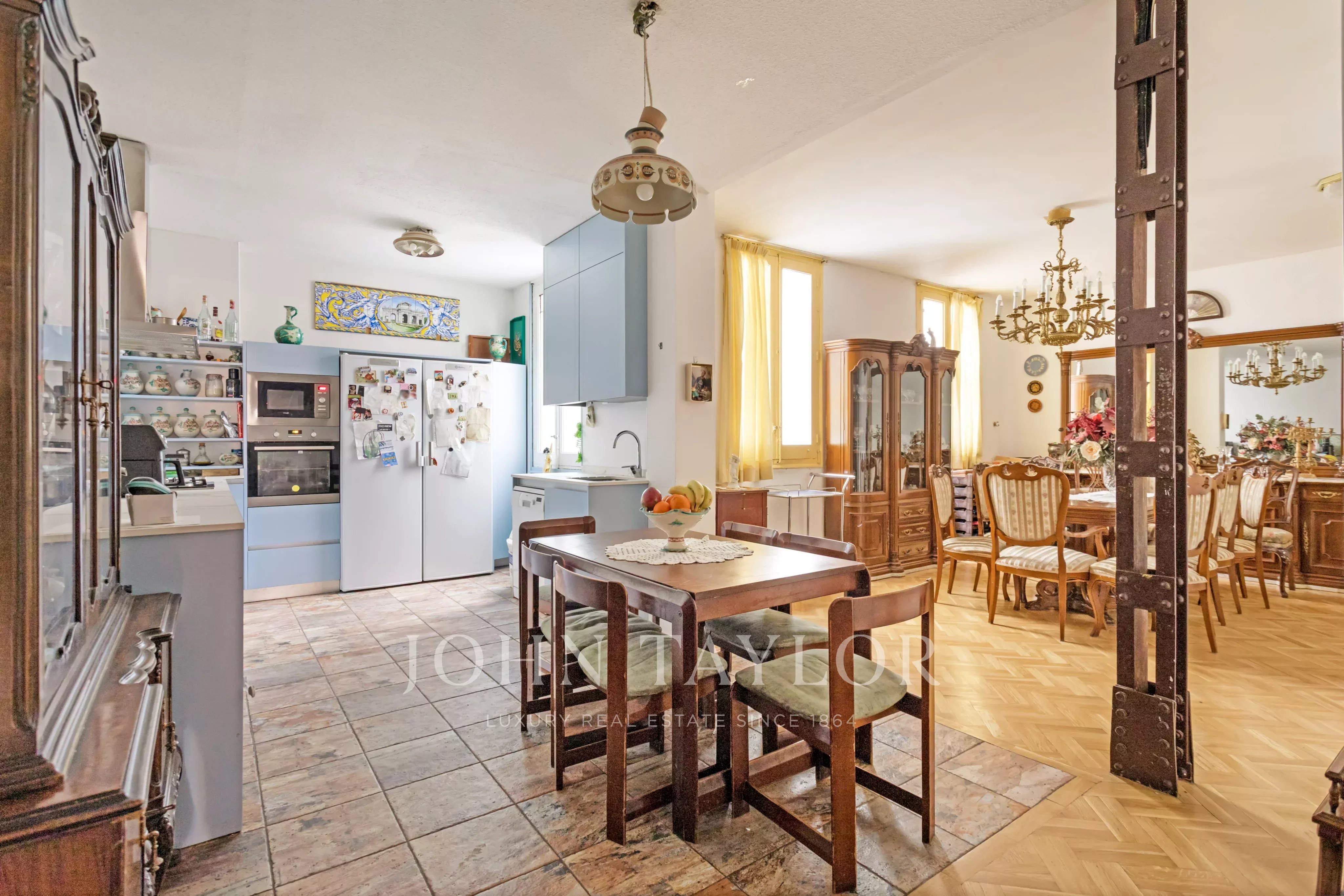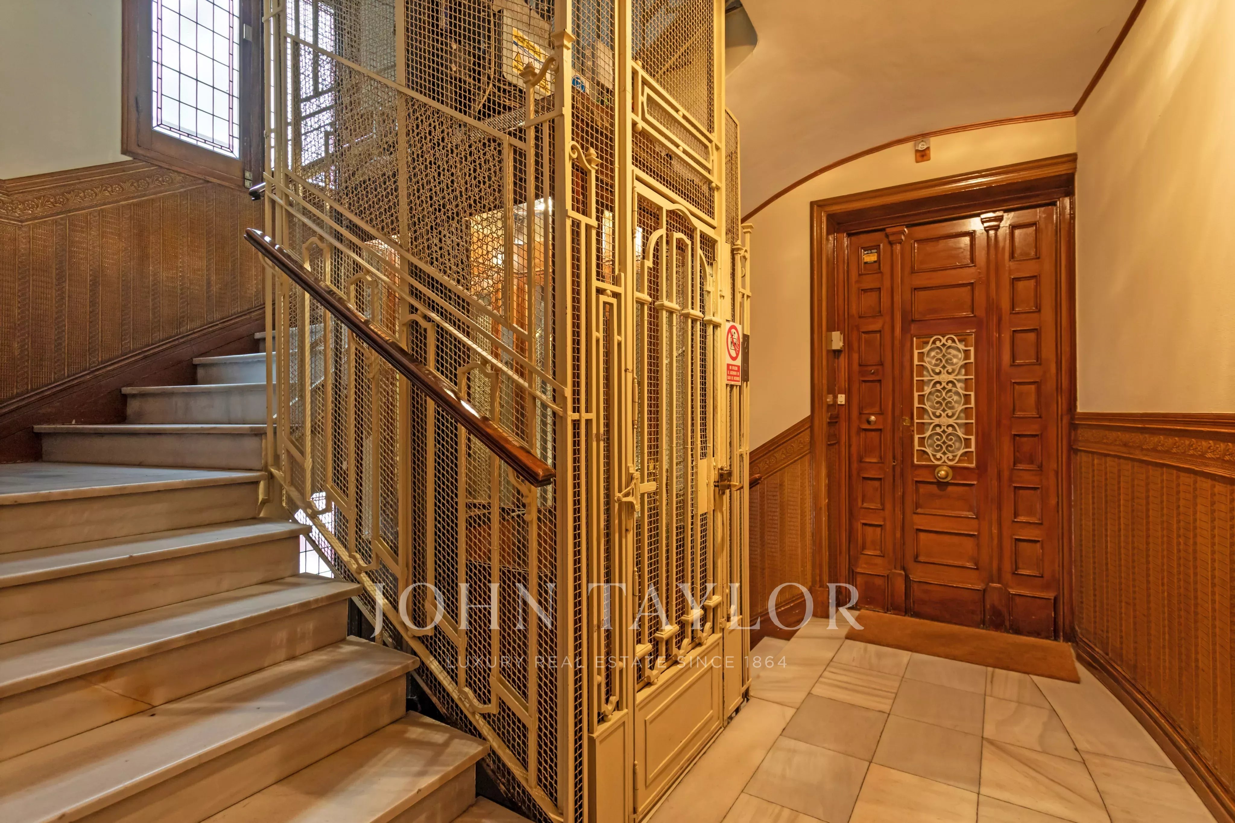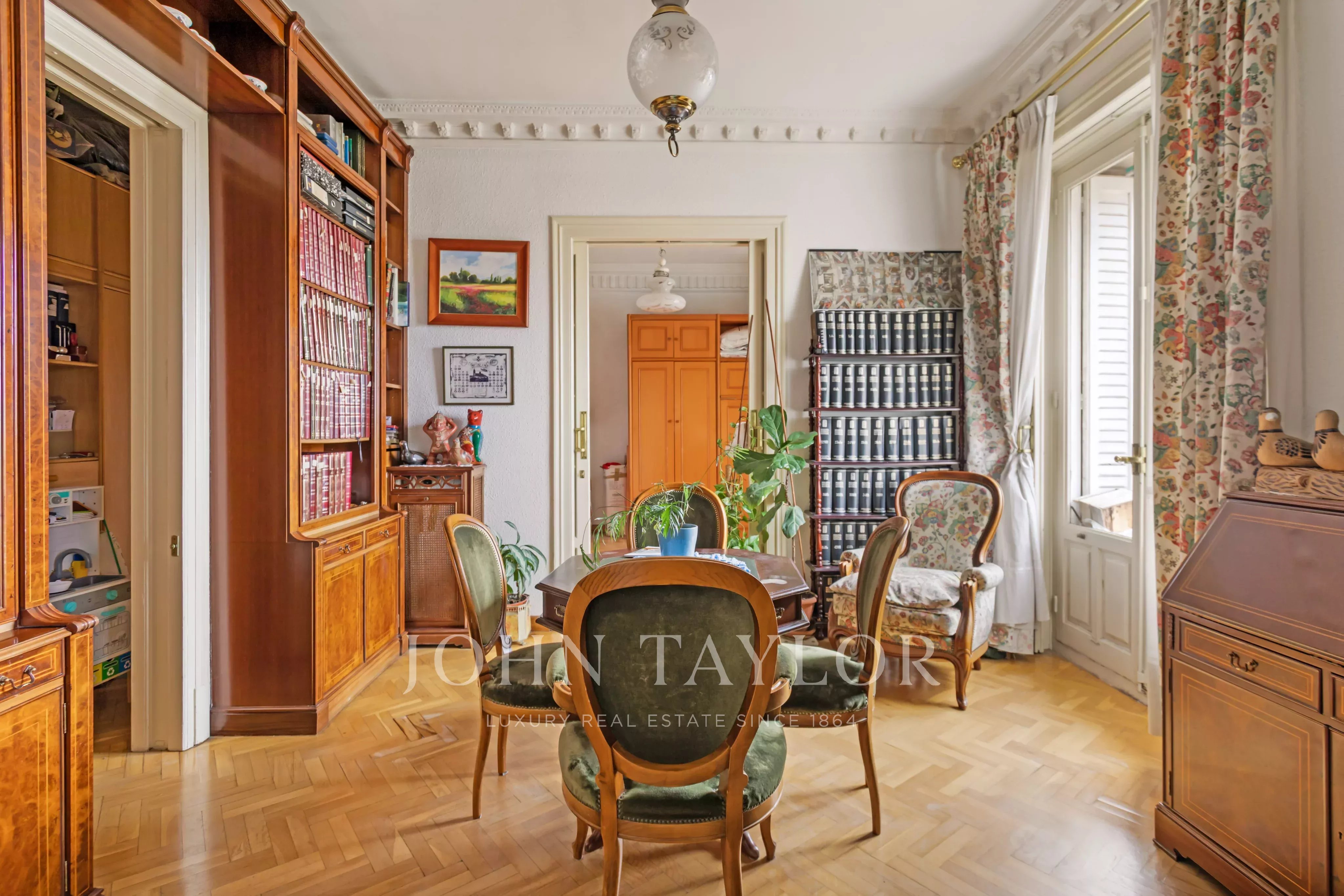 Nemovitost vyniká svým majestátním charakterem s vysokými stropy, klasickými lištami a architekturou, která evokuje eleganci autentického palácového bytu. Obývací pokoj, prostorný a zalitý přirozeným světlem, se otevírá na impozantní balkony s přímým výhledem do parku, chráněného prostoru, který zaručuje absolutní soukromí a časem neměnný výhled.