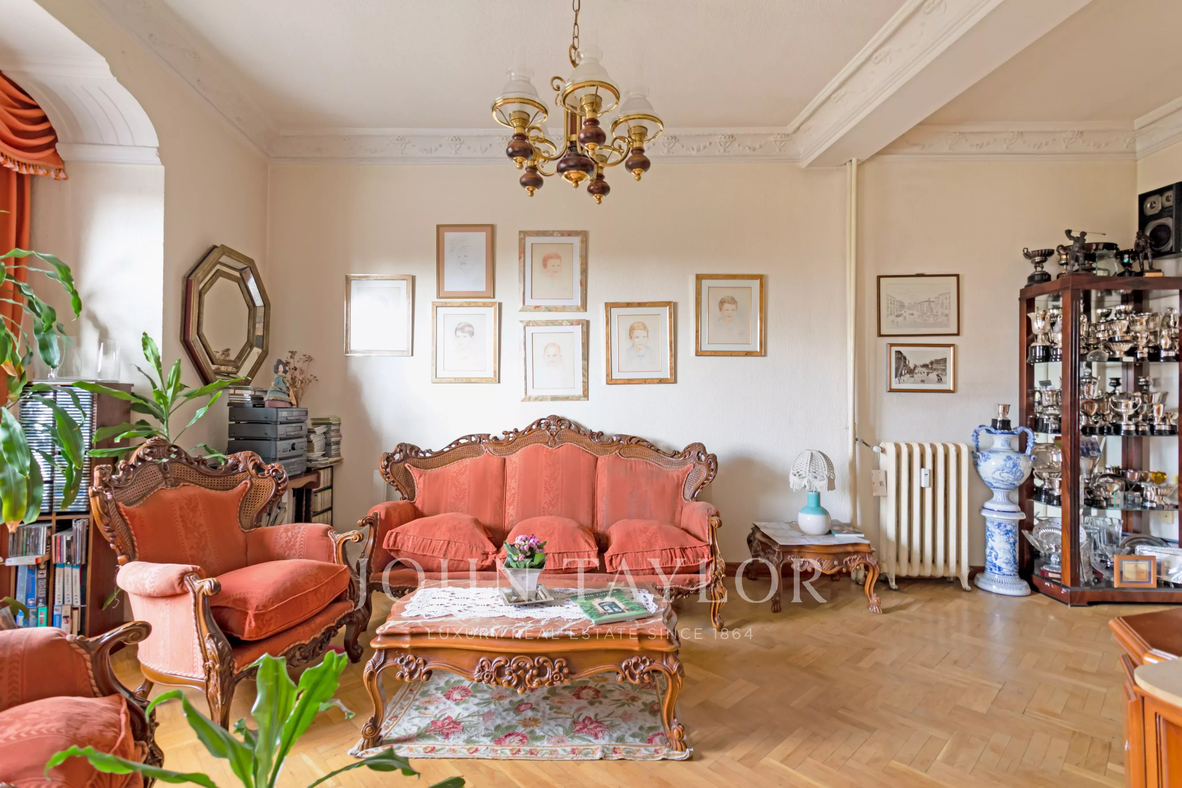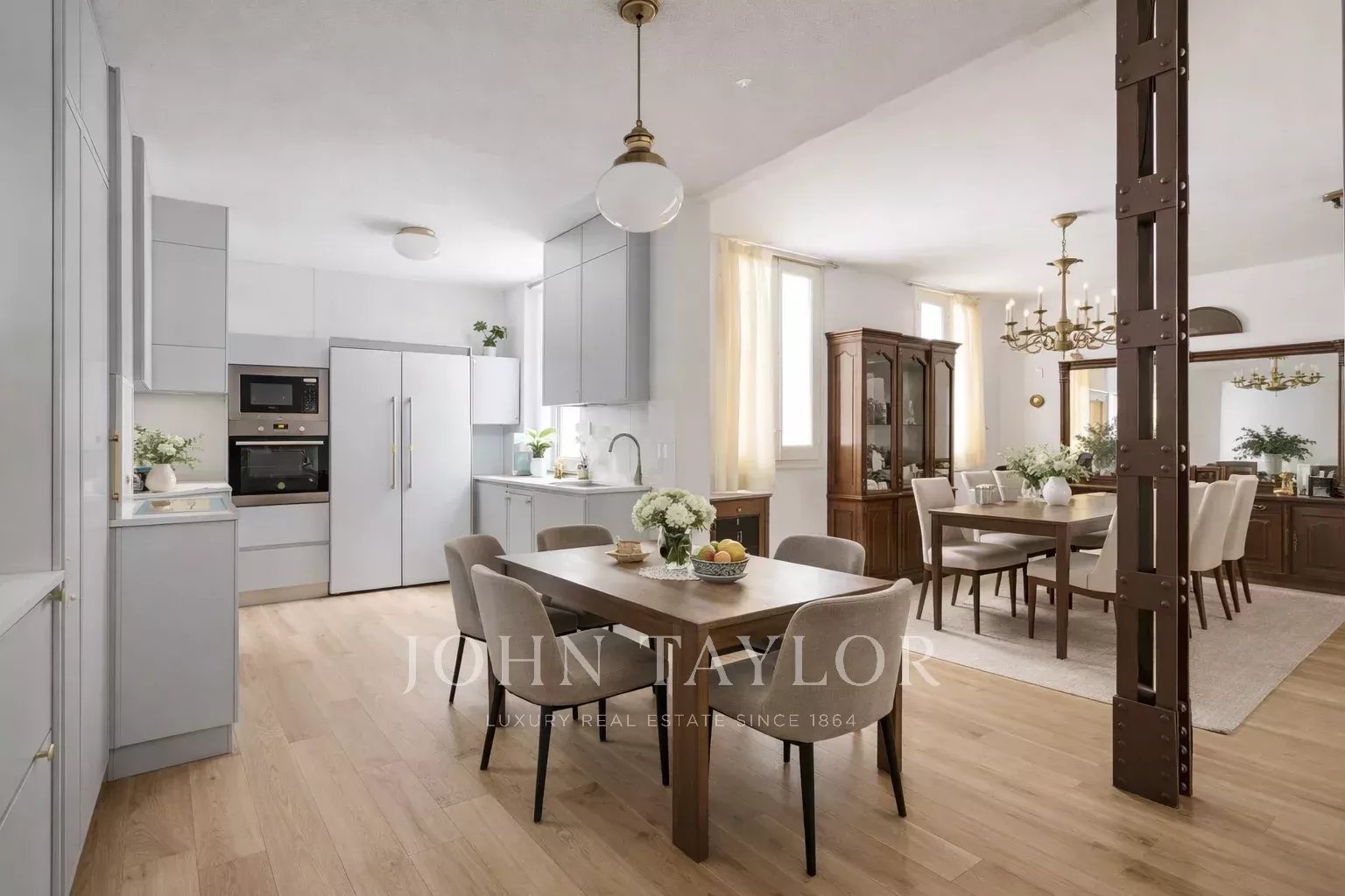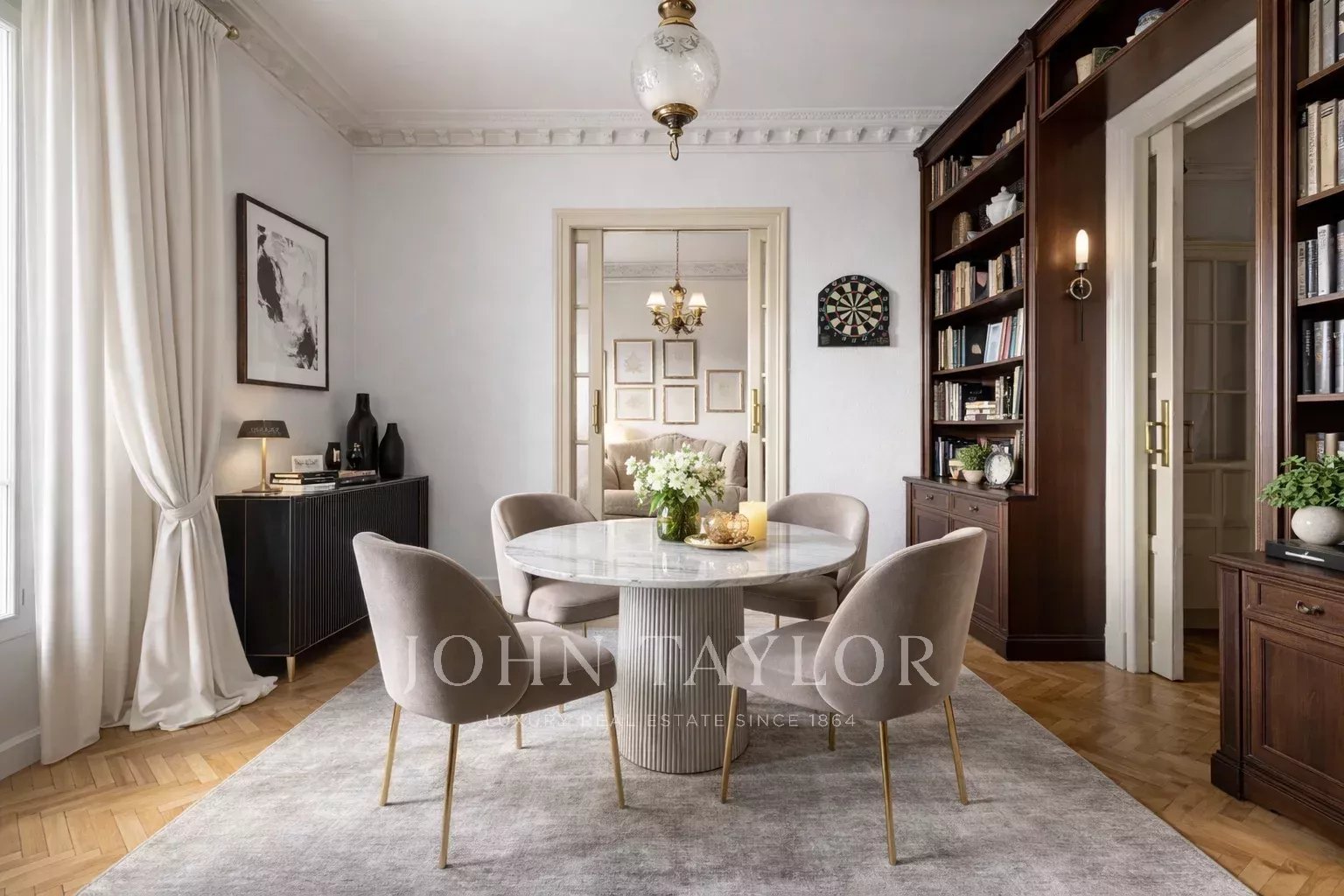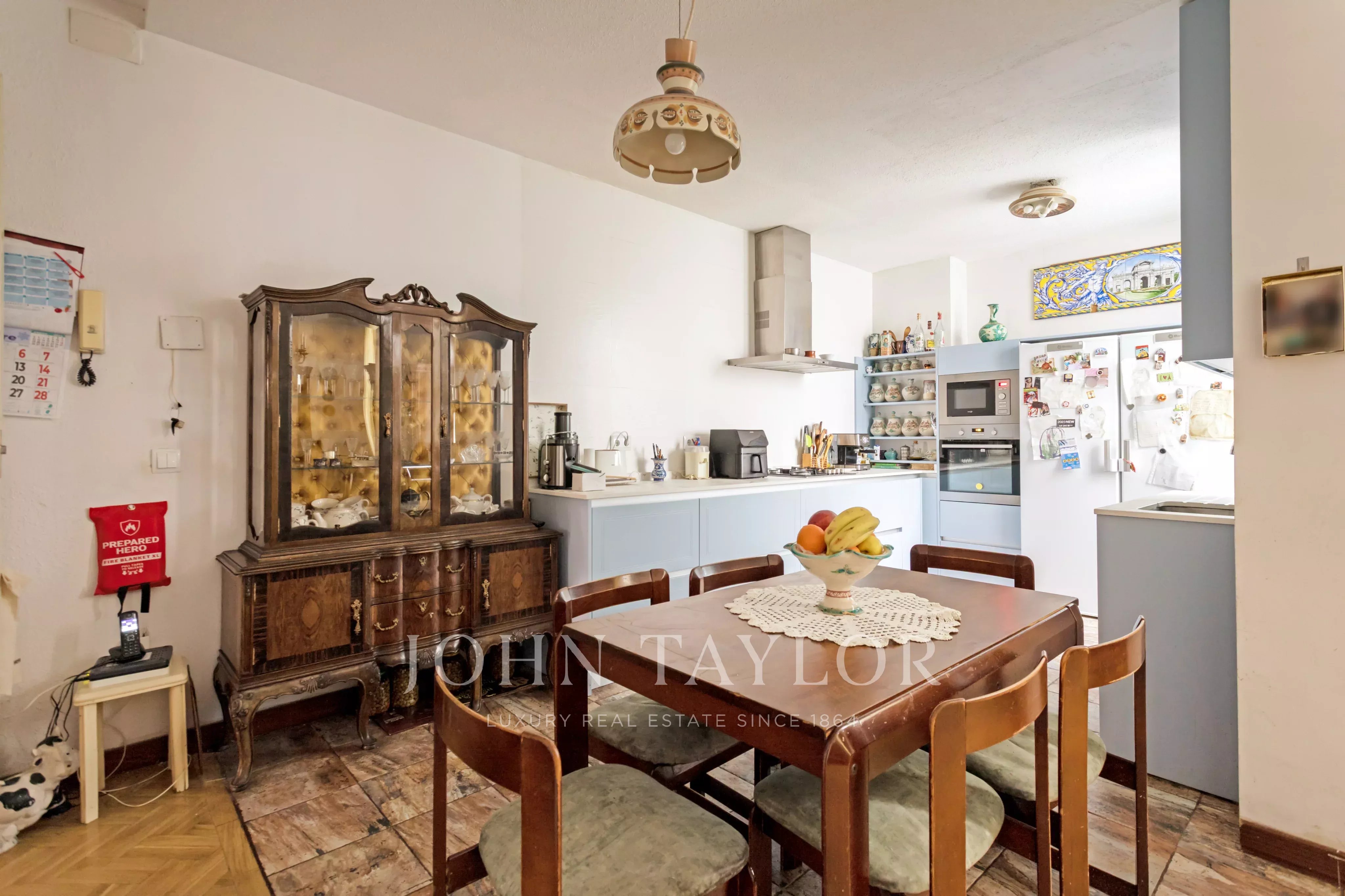 Nemovitost vyniká svým majestátním charakterem s vysokými stropy, klasickými lištami a architekturou, která evokuje eleganci autentického palácového bytu. Obývací pokoj, prostorný a zalitý přirozeným světlem, se otevírá na impozantní balkony s přímým výhledem do parku, chráněného prostoru, který zaručuje absolutní soukromí a časem neměnný výhled.