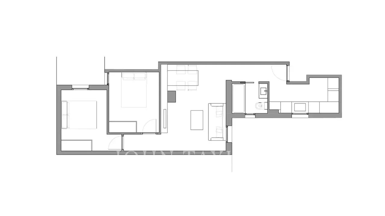 Společenská část je otevřený prostor s obývacím pokojem, jídelnou a plně vybavenou kuchyní. K dispozici jsou dvě dvoulůžkové ložnice a koupelna.