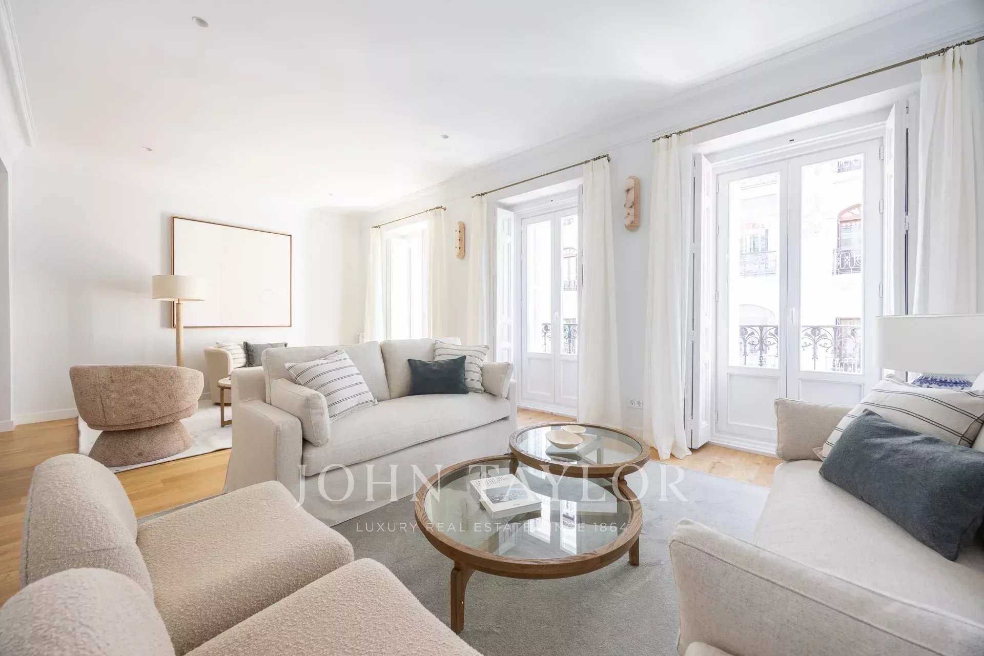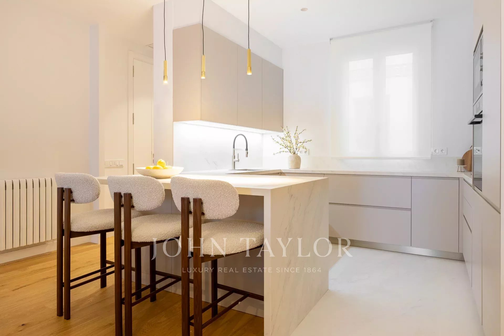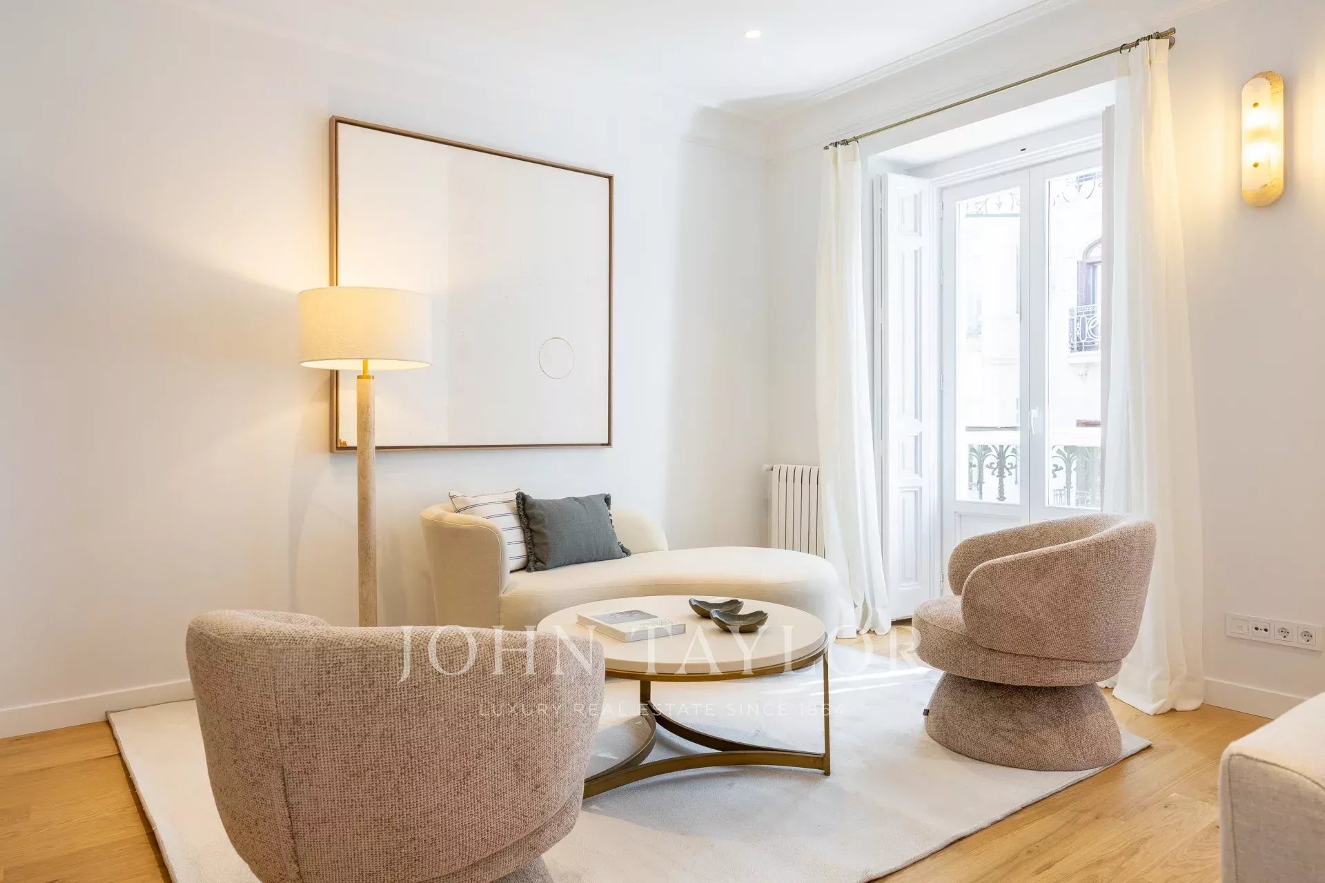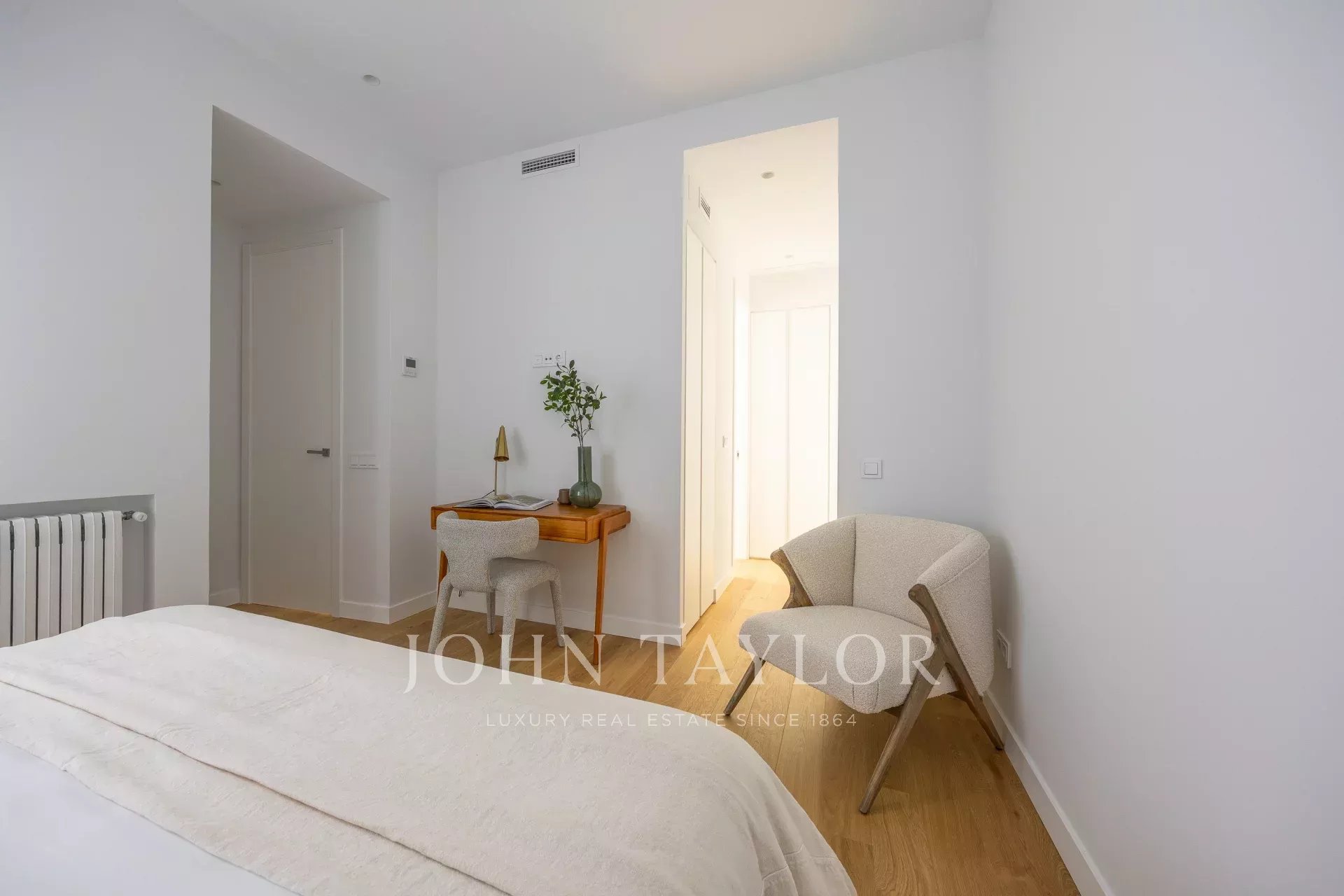 V krásné budově s klasickou fasádou a bočním výhledem na park Retiro se nachází tento krásný byt, kompletně zrekonstruovaný, zařízený a zcela nový. Nachází se ve čtvrtém patře a je orientován na jih, což mu spolu se dvěma balkony a krásným výhledem dodává skvělé přirozené světlo.