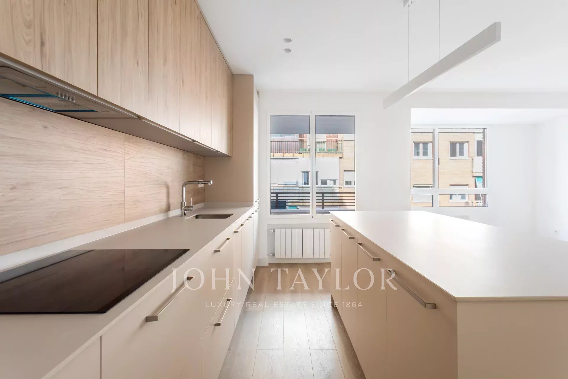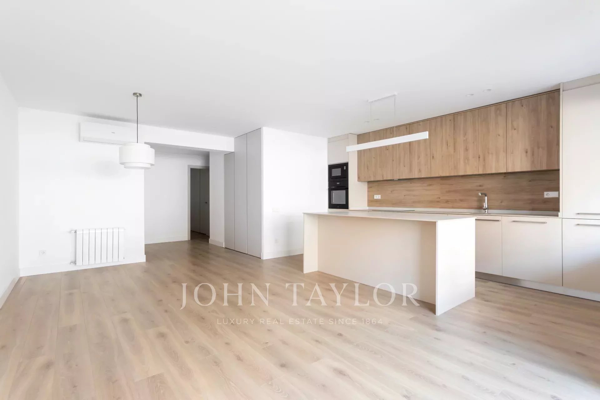 Nachází se v zavedené čtvrti Pacífico a vyniká otevřenou a světlou dispozicí, která je ideální pro ty, kdo si cení pohodlí a moderního životního stylu. Srdcem nemovitosti je prostorný společenský prostor, který integruje obývací pokoj, jídelnu a otevřenou koncepční kuchyň s centrálním ostrůvkem, plně vybavenou špičkovými spotřebiči a elegantními povrchy z přírodního dřeva. Světlo sem přirozeně proudí díky velkým oknům, která navazují na terasu, ideální pro vychutnávání chvil venku s naprostým soukromím.