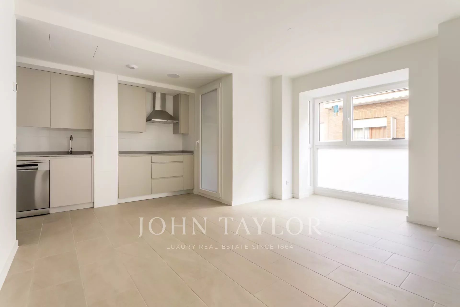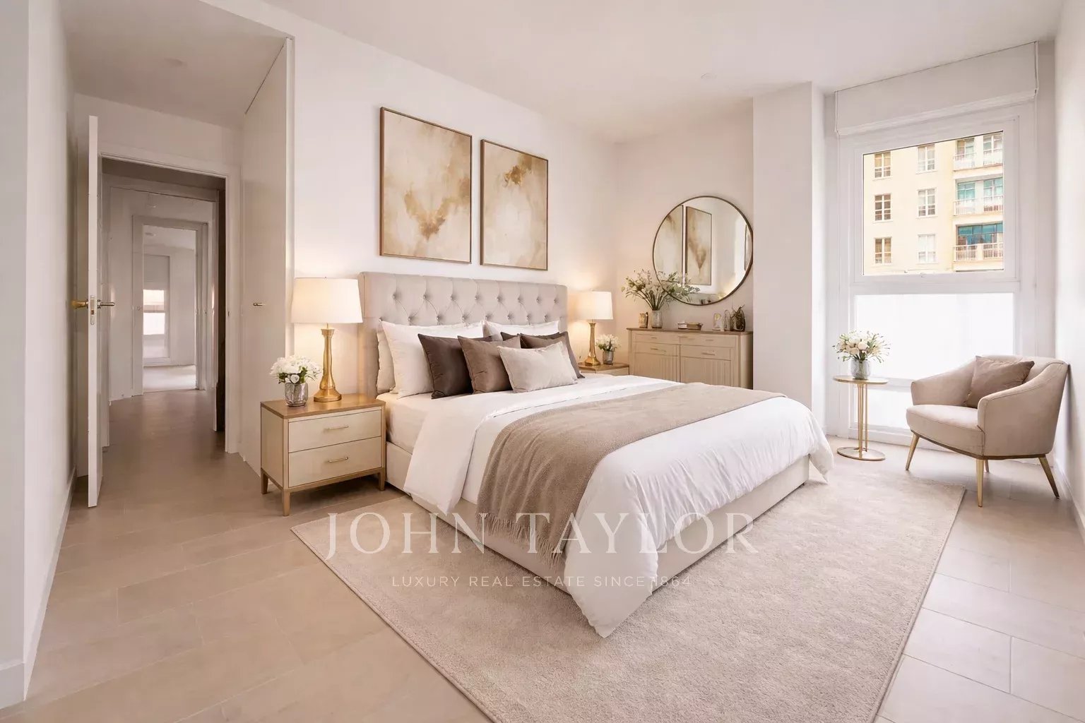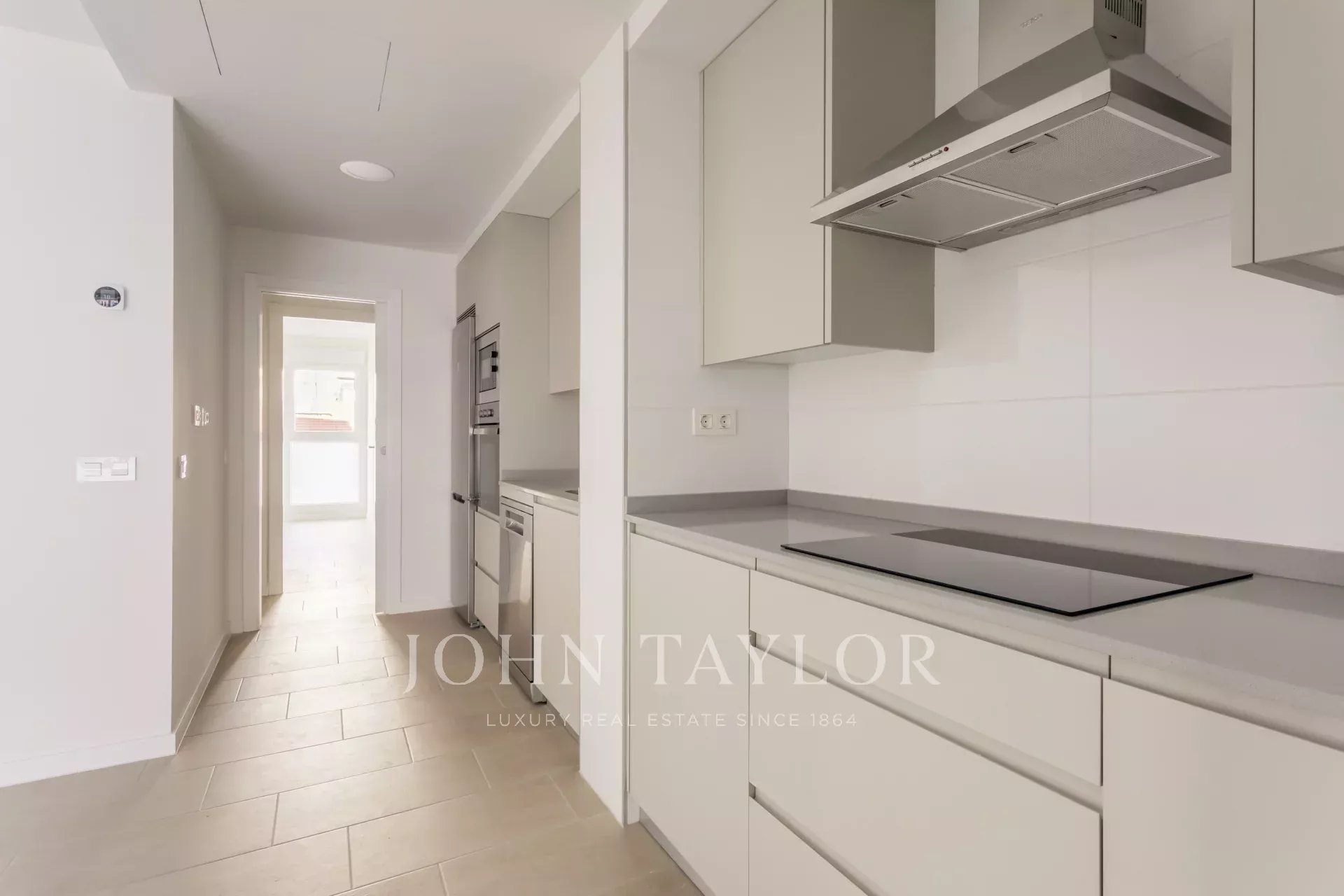 Nemovitost, která se nachází v prvním patře, má 82 m² skvěle rozdělených soukromých prostor, 105 m² včetně repertoáru společných prostor budovy. Má elegantní chodbu s vestavěnými skříněmi, která vede do plně vybavené kuchyně integrované do obývacího pokoje, a také praktickou oddělenou prádelnu. Prosvětlený obývací pokoj s jídelnou navazuje na odpočinkovou zónu, kterou tvoří dvě ložnice, z nichž hlavní má šatnu a vlastní koupelnu, zatímco druhá kompletní koupelna poskytuje servis vedlejší ložnici a návštěvám. Celý objekt je kromě koupelen v exteriéru, což zaručuje nádherný vstup přirozeného světla a příjemný pocit prostornosti.