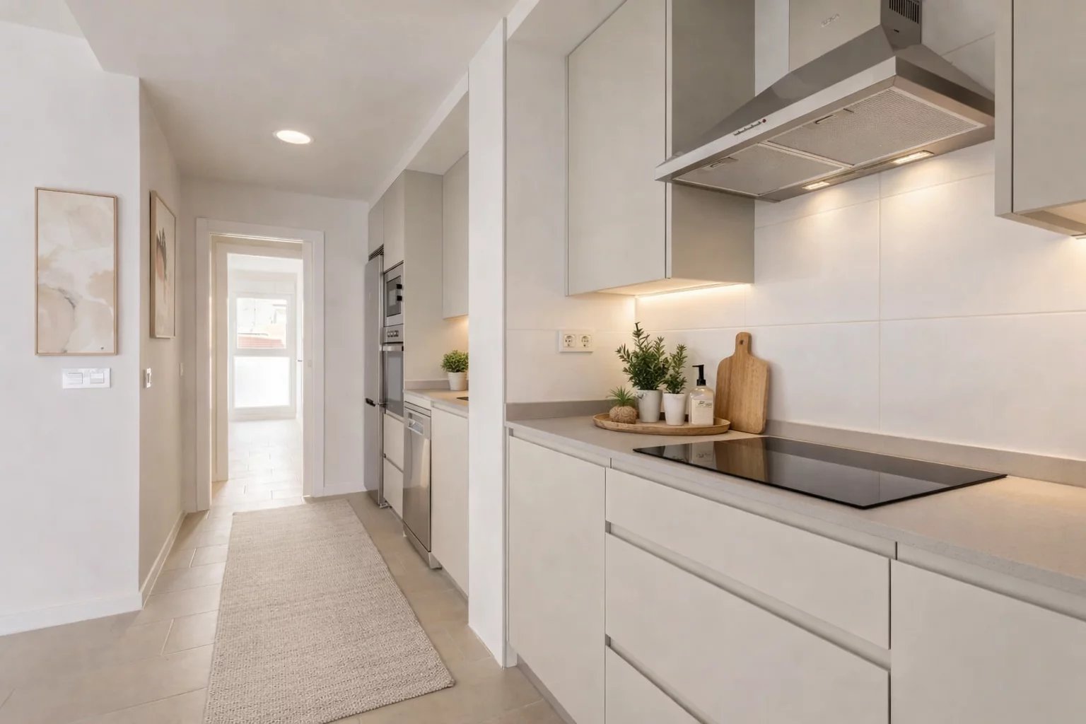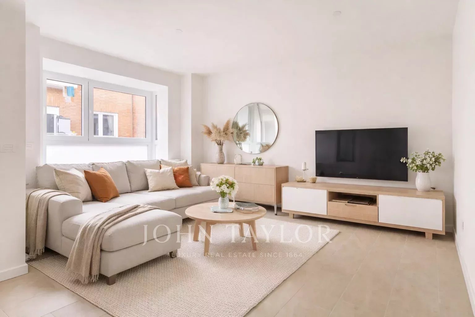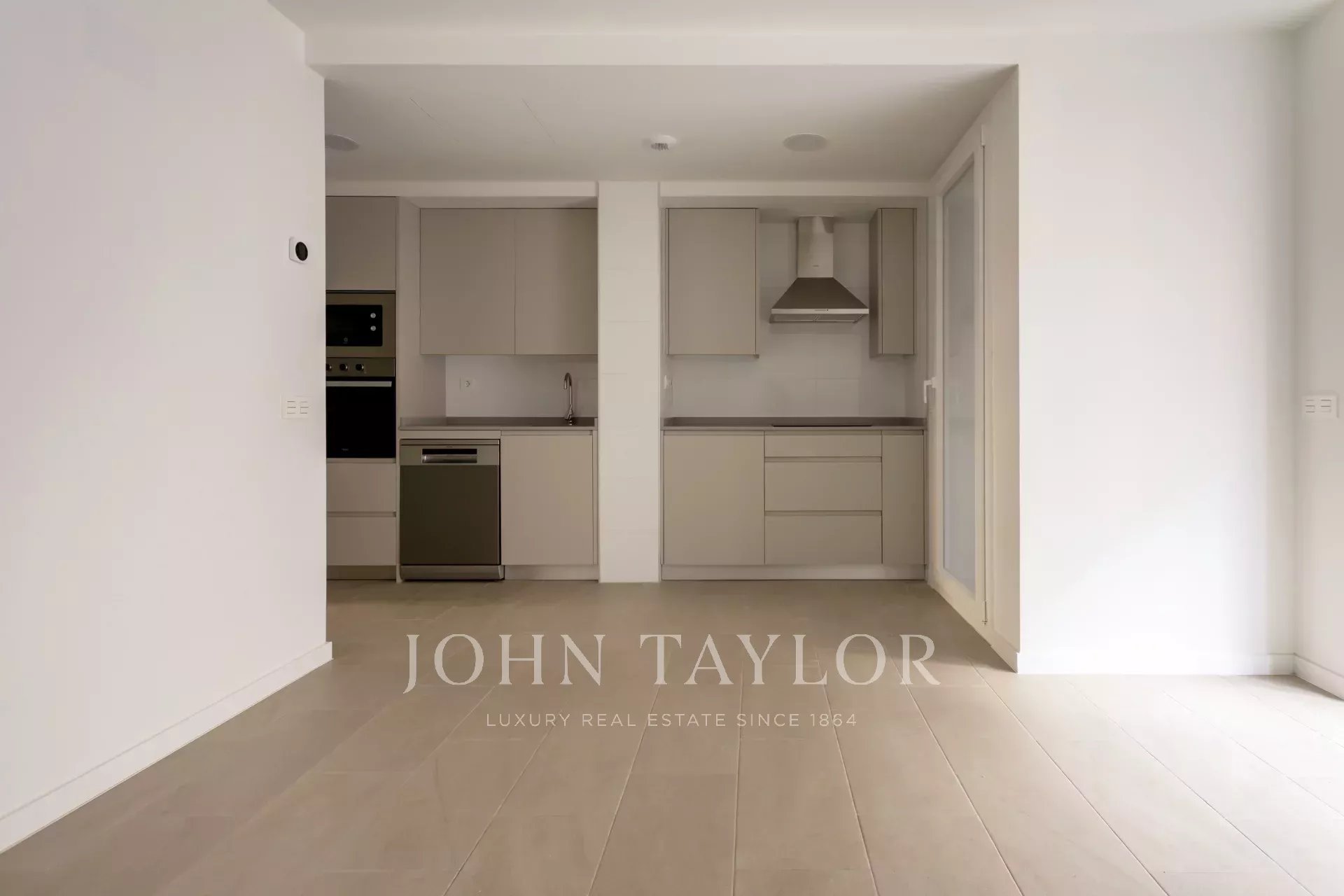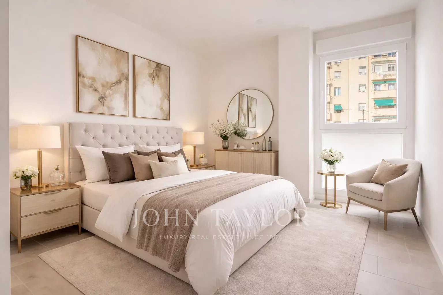 Nemovitost, která se nachází v prvním patře, má 82 m² skvěle rozdělených soukromých prostor, 105 m² včetně repertoáru společných prostor budovy. Má elegantní chodbu s vestavěnými skříněmi, která vede do plně vybavené kuchyně integrované do obývacího pokoje, a také praktickou oddělenou prádelnu. Prosvětlený obývací pokoj s jídelnou navazuje na odpočinkovou zónu, kterou tvoří dvě ložnice, z nichž hlavní má šatnu a vlastní koupelnu, zatímco druhá kompletní koupelna poskytuje servis vedlejší ložnici a návštěvám. Celý objekt je kromě koupelen v exteriéru, což zaručuje nádherný vstup přirozeného světla a příjemný pocit prostornosti.