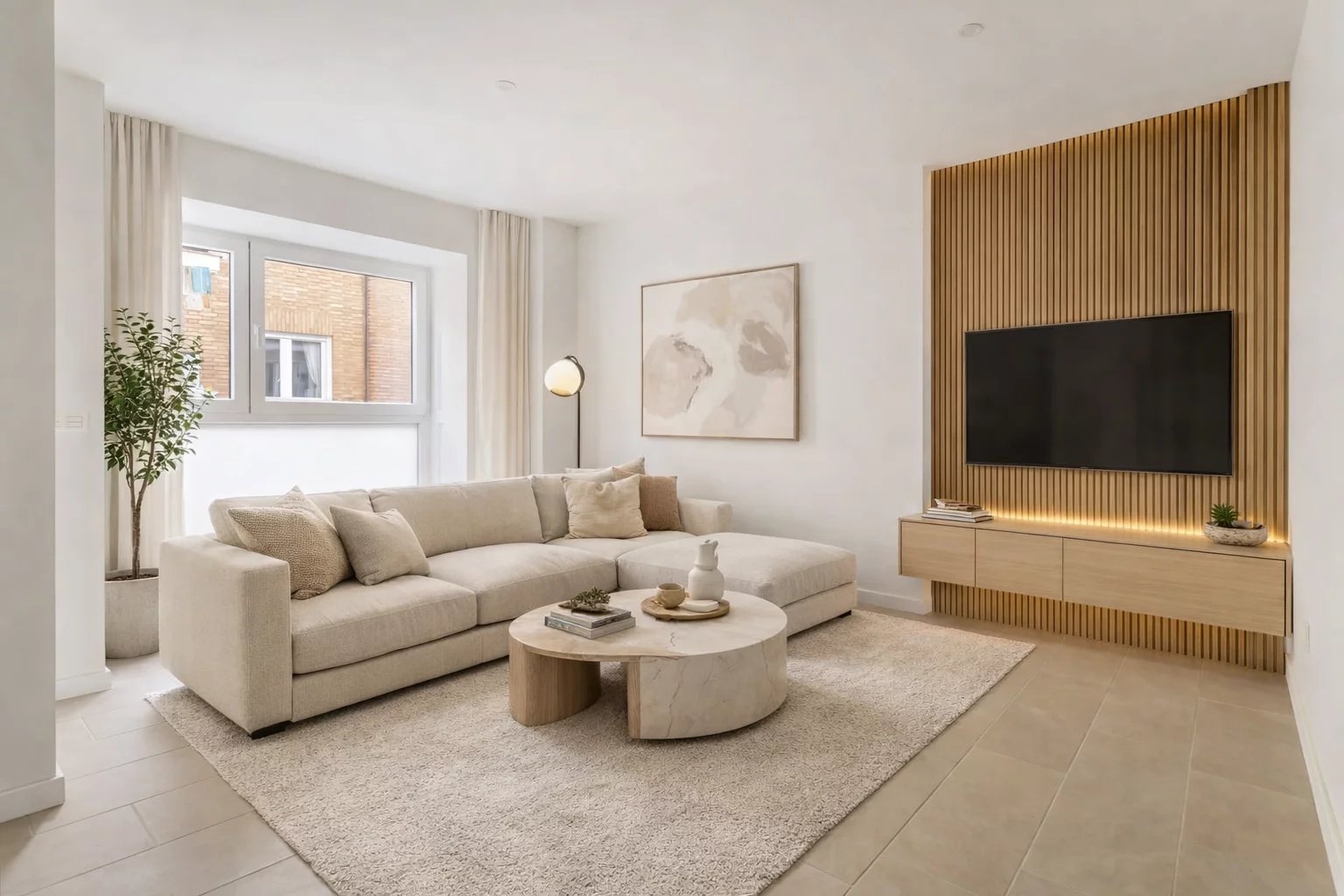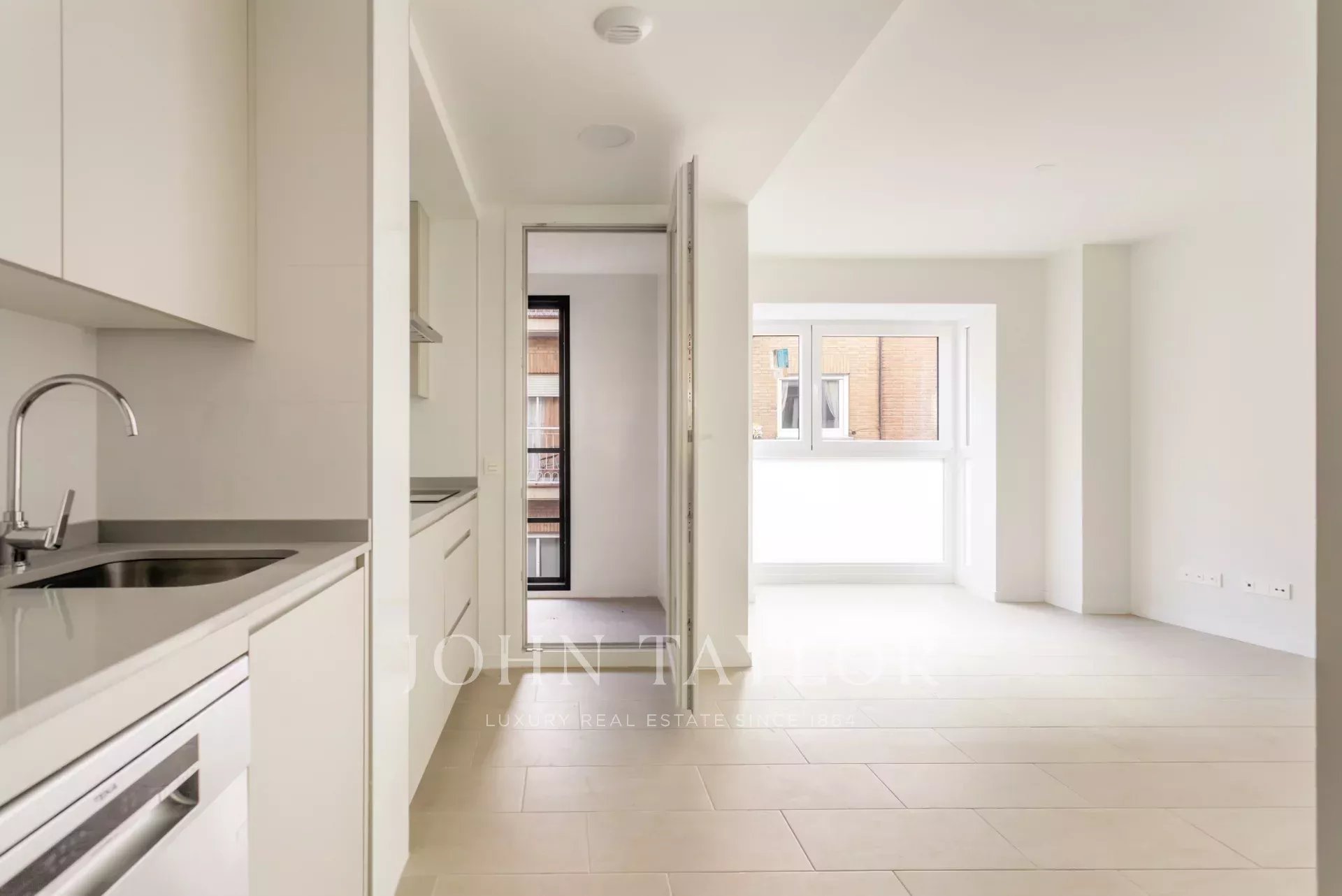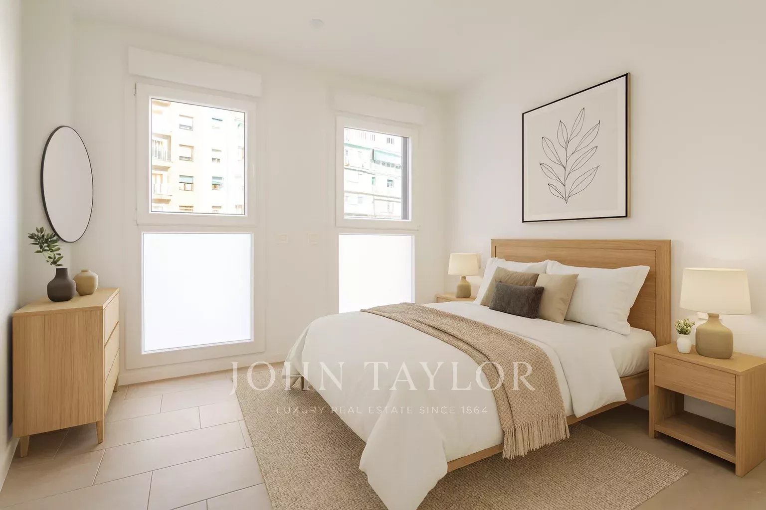 Nemovitost, která se nachází v prvním patře, má 82 m² skvěle rozdělených soukromých prostor, 105 m² včetně repertoáru společných prostor budovy. Má elegantní chodbu s vestavěnými skříněmi, která vede do plně vybavené kuchyně integrované do obývacího pokoje, a také praktickou oddělenou prádelnu. Prosvětlený obývací pokoj s jídelnou navazuje na odpočinkovou zónu, kterou tvoří dvě ložnice, z nichž hlavní má šatnu a vlastní koupelnu, zatímco druhá kompletní koupelna poskytuje servis vedlejší ložnici a návštěvám. Celý objekt je kromě koupelen v exteriéru, což zaručuje nádherný vstup přirozeného světla a příjemný pocit prostornosti.
