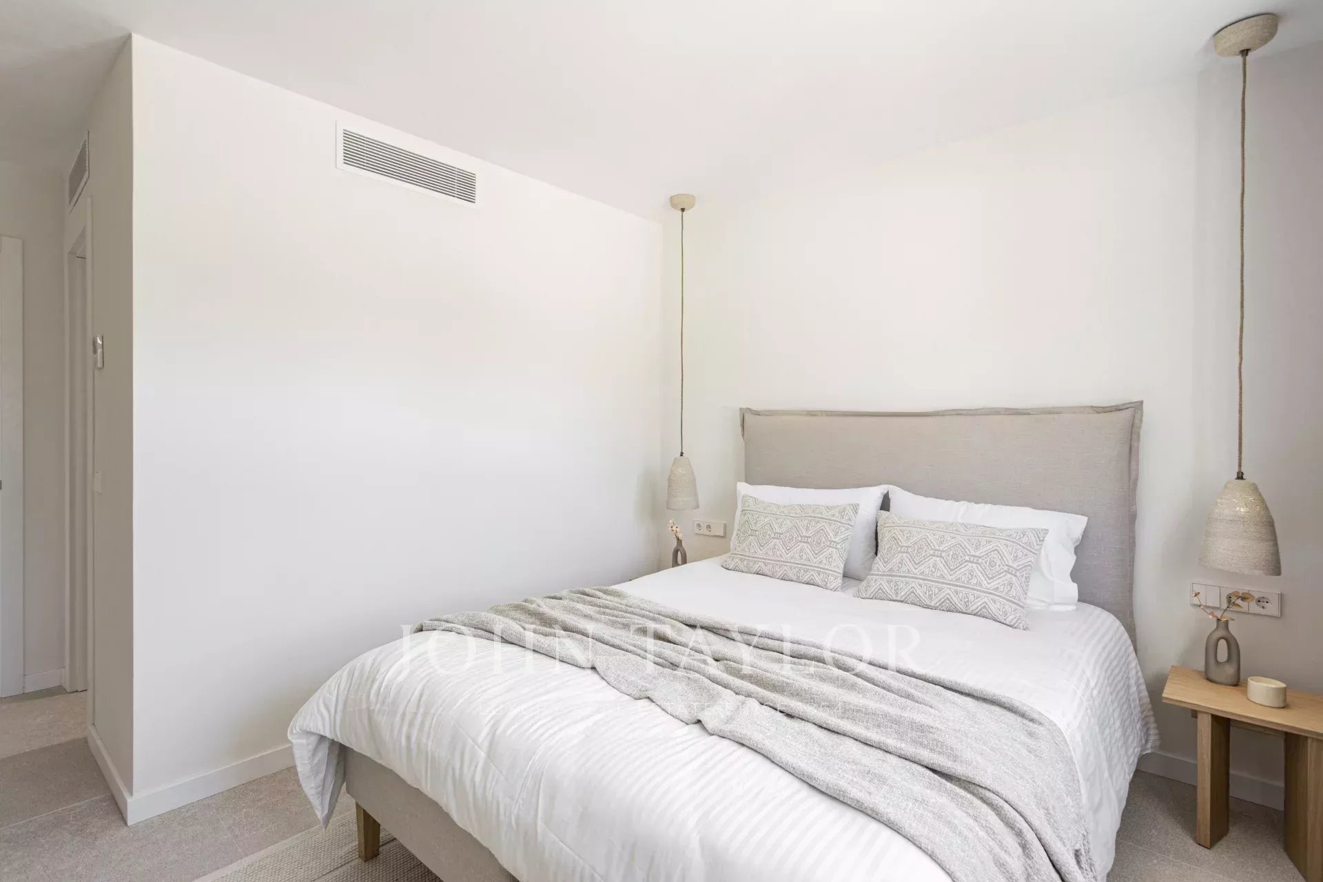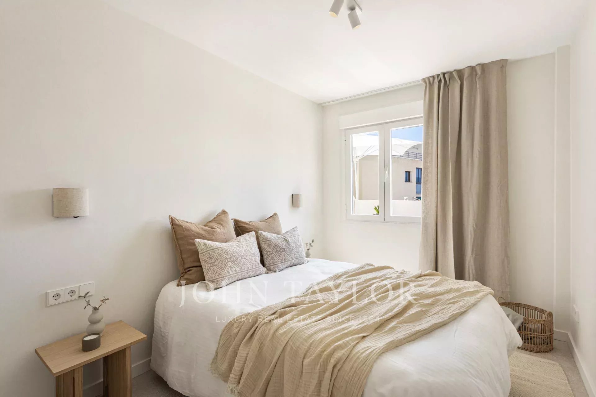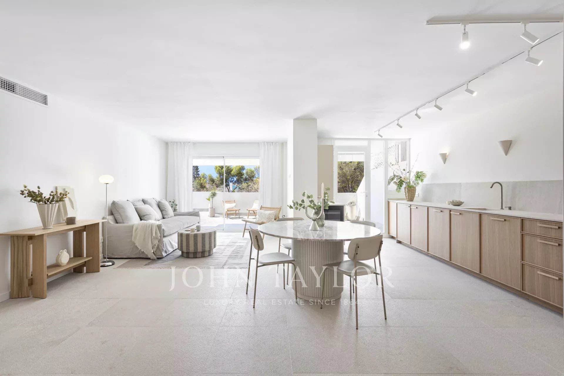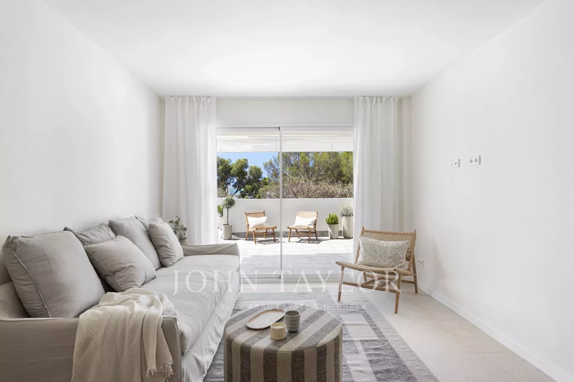 Tento výjimečný byt se nachází ve význačné enklávě Cas Català a představuje dokonalé spojení vnitřního luxusu a venkovního středomořského životního stylu. S celkovou plochou 200 m² - 100 m² interiér a impozantní 100 m² terasa - nabízí nemovitost skutečně nádherný výhled na moře prakticky z každého prostoru a vytváří atmosféru klidu a sofistikovanosti. Otevřený půdorys plynule propojuje obývací pokoj a jídelnu, které rámují elegantní podlahy z přírodního kamene Zarci, jež dodávají teplo a charakter. Kuchyně, vybavená spotřebiči Gaggenau, dubovým povrchem a nápadnou mramorovou pracovní deskou Binissalem, harmonicky zapadá do prostoru a odráží moderní a funkční design. Tři ložnice byly koncipovány tak, aby maximalizovaly světlo a výhled, přičemž hlavní ložnice je vybavena elegantní koupelnou a přímým vstupem na terasu. Ta, která je skutečným protagonistou nemovitosti, nabízí jedinečné prostředí s nerušeným výhledem na moře, grilem, jídelním koutem a relaxačními prostory, ideálními jak pro užívání si mallorského slunce, tak pro pořádání venkovních setkání. Tuto atraktivní nemovitost doplňuje velké parkovací stání v téže budově s kapacitou pro dva malé vozy, velkoryse dimenzovaný sklad a přímý přístup výtahem z garáže ke vstupním dveřím, což zaručuje maximální pohodlí a soukromí. Neopakovatelná příležitost pro ty, kteří chtějí bydlet stylově v jedné z nejexkluzivnějších oblastí ostrova.