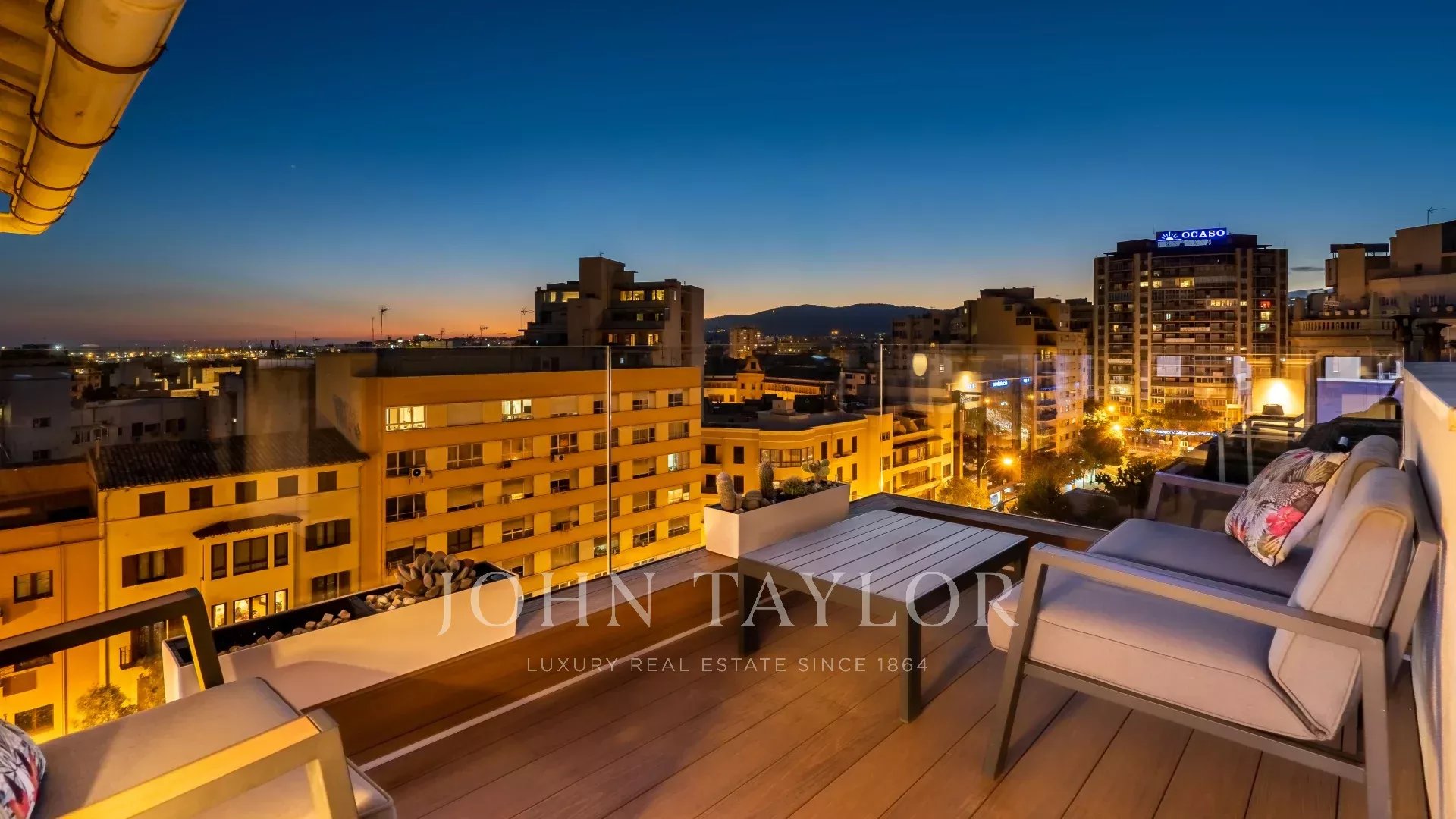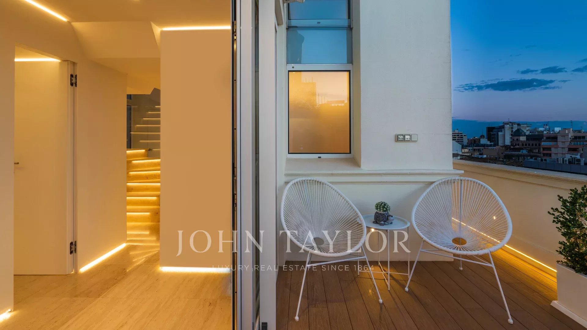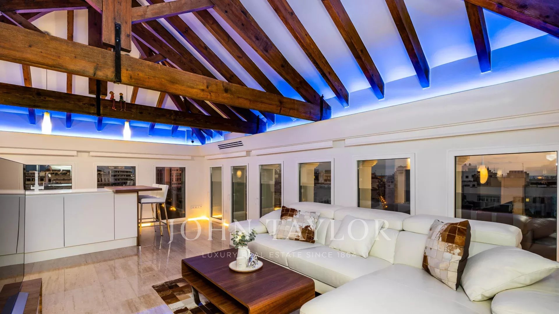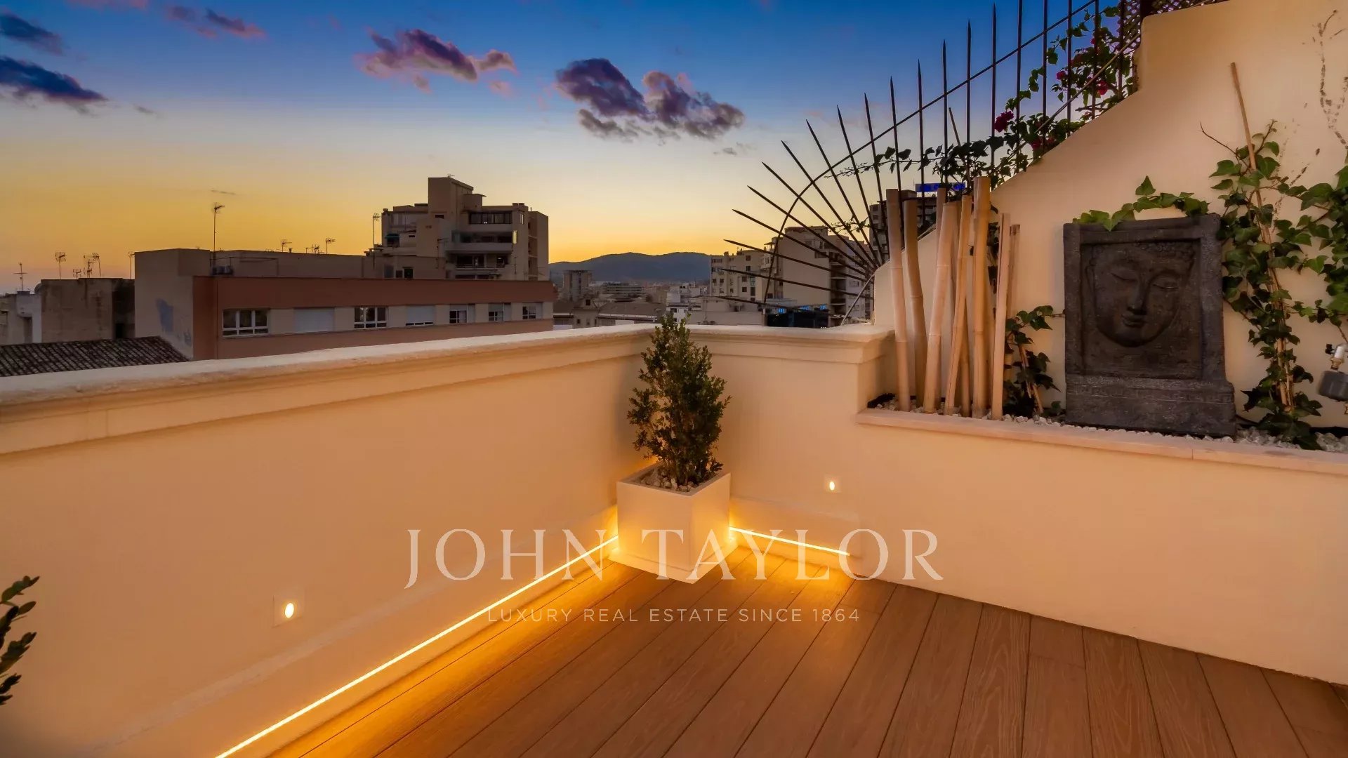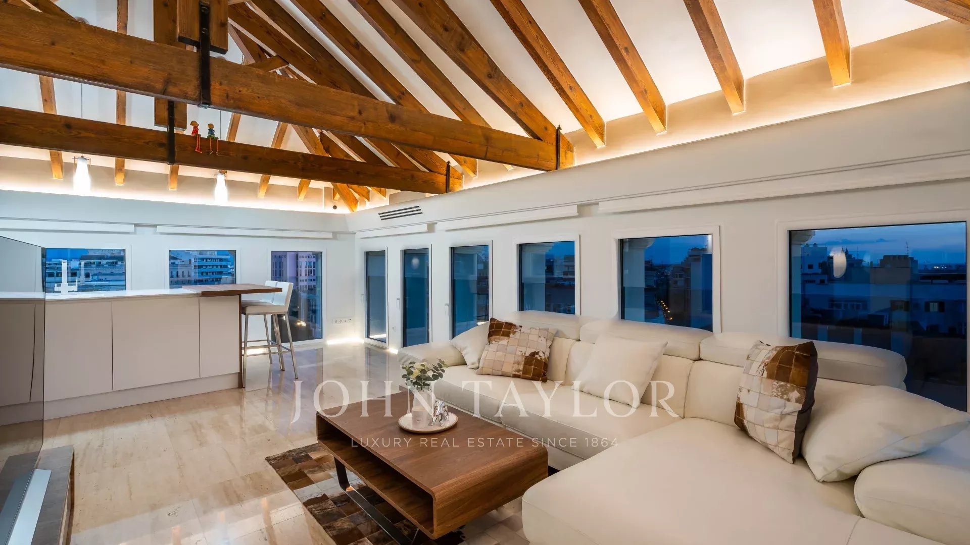 Tento jedinečný mezonetový penthouse prošel v roce 2021 kompletní rekonstrukcí. Stojí na vrcholu jedné z nejvýznamnějších budov na palmské třídě Avenidas a nabízí ohromující výhled na město a na moře. V přízemí jsou dvě ložnice, dvě koupelny, WC pro hosty a přístup na jednu ze dvou teras. V horním patře se nachází kuchyň, obývací a jídelní část s okny s 360° výhledem, dřevěnými trámovými stropy a přímým vstupem na druhou terasu. S podlahovým vytápěním v celém domě, centrální klimatizací a domotickou instalací zajišťuje pohodlí a snadnou správu nemovitosti zobrazení telefonu, ipadu nebo počítače. Nemovitost se prodává plně zařízená a její součástí jsou dvě garážová stání.