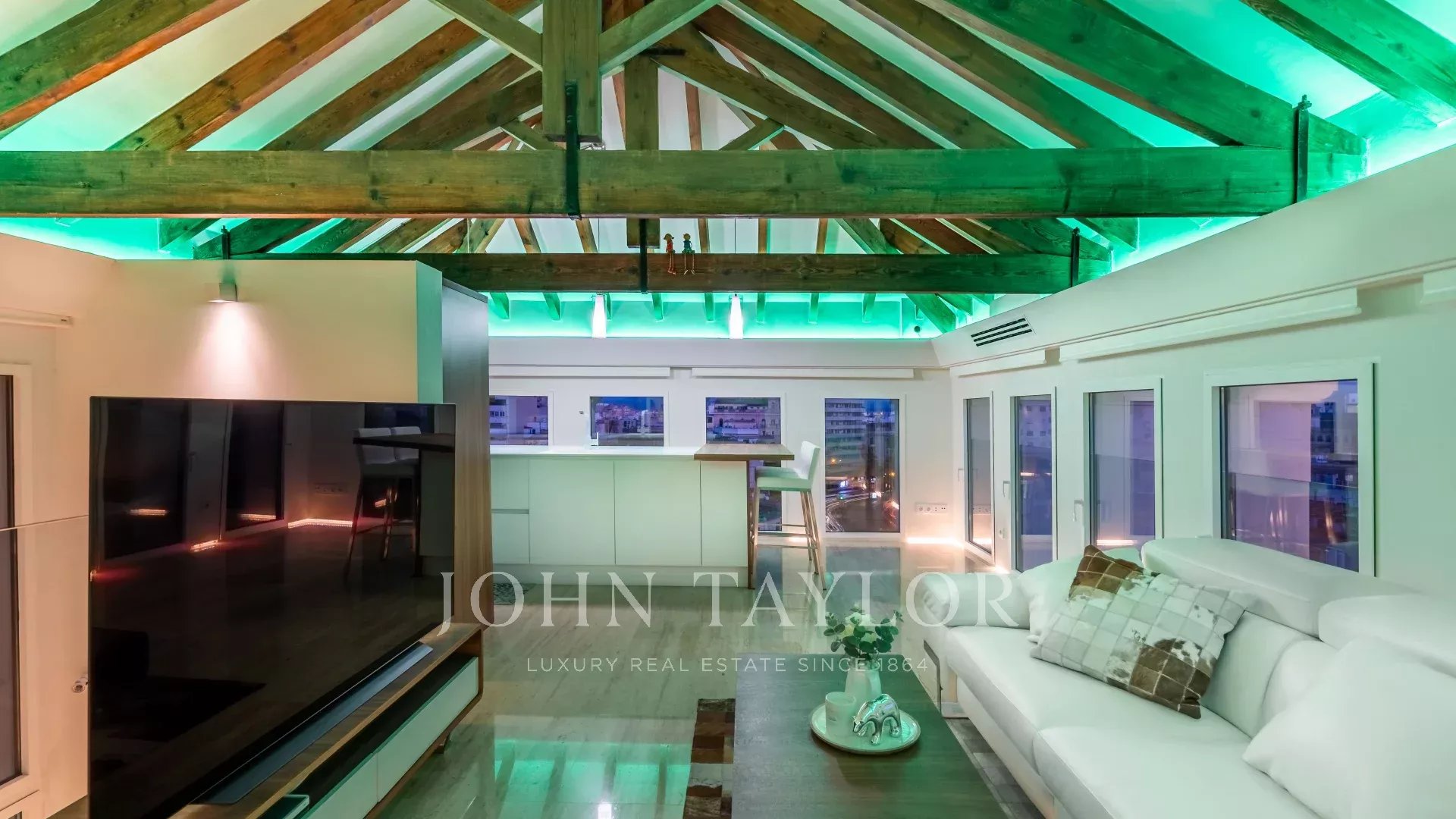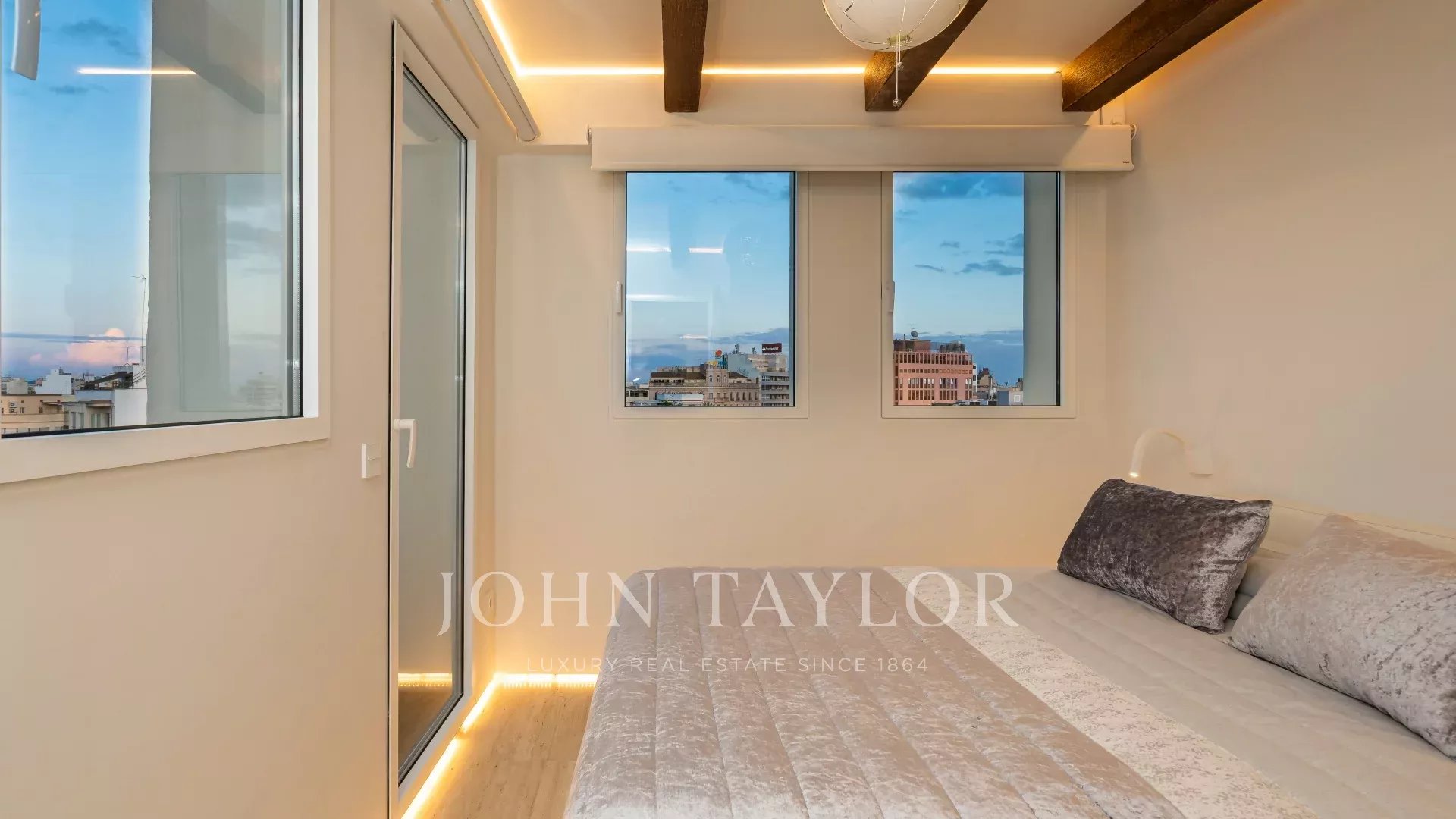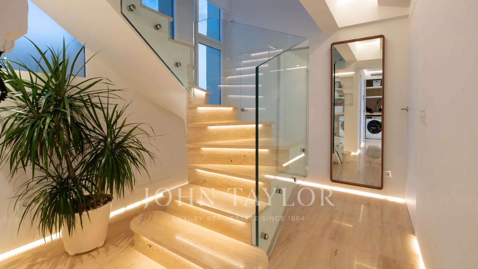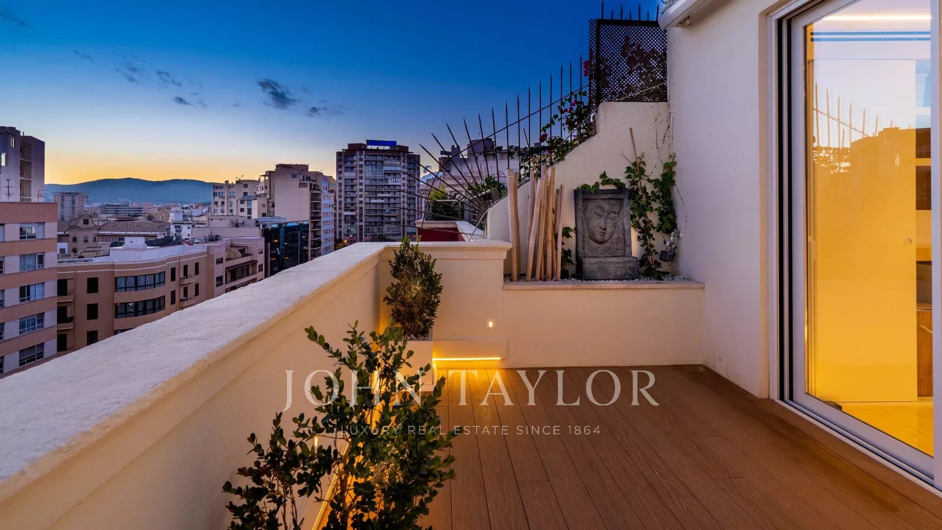 Tento jedinečný mezonetový penthouse prošel v roce 2021 kompletní rekonstrukcí. Stojí na vrcholu jedné z nejvýznamnějších budov na palmské třídě Avenidas a nabízí ohromující výhled na město a na moře. V přízemí jsou dvě ložnice, dvě koupelny, WC pro hosty a přístup na jednu ze dvou teras. V horním patře se nachází kuchyň, obývací a jídelní část s okny s 360° výhledem, dřevěnými trámovými stropy a přímým vstupem na druhou terasu. S podlahovým vytápěním v celém domě, centrální klimatizací a domotickou instalací zajišťuje pohodlí a snadnou správu nemovitosti zobrazení telefonu, ipadu nebo počítače. Nemovitost se prodává plně zařízená a její součástí jsou dvě garážová stání.