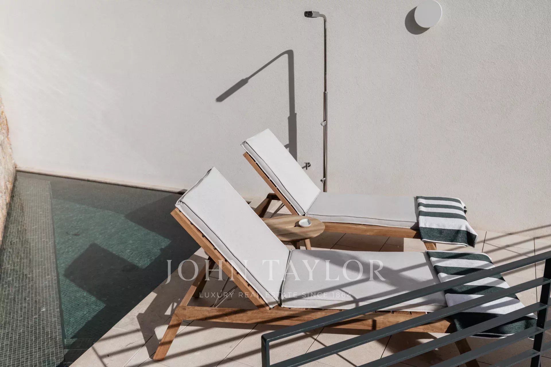 Tento apartmán v prvním patře nabízí hlavní apartmá s vlastní koupelnou, druhou ložnici a koupelnu, otevřenou kuchyň, jídelnu a obývací pokoj s přímým vstupem na prostornou soukromou terasu o rozloze 113 m2 a bazén, který vede do zahrady o rozloze 50 m2. Nemovitost je doplněna soukromou prádelnou a úložnými prostory.