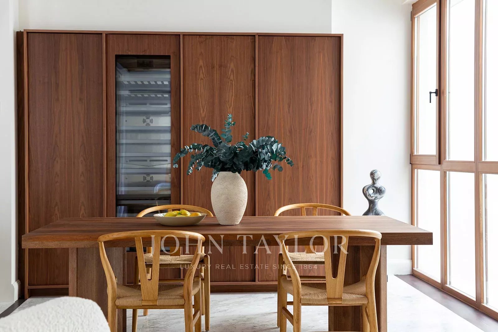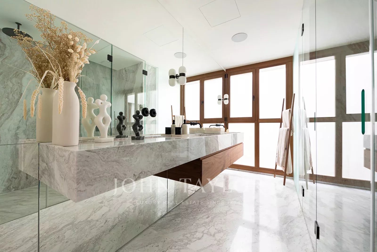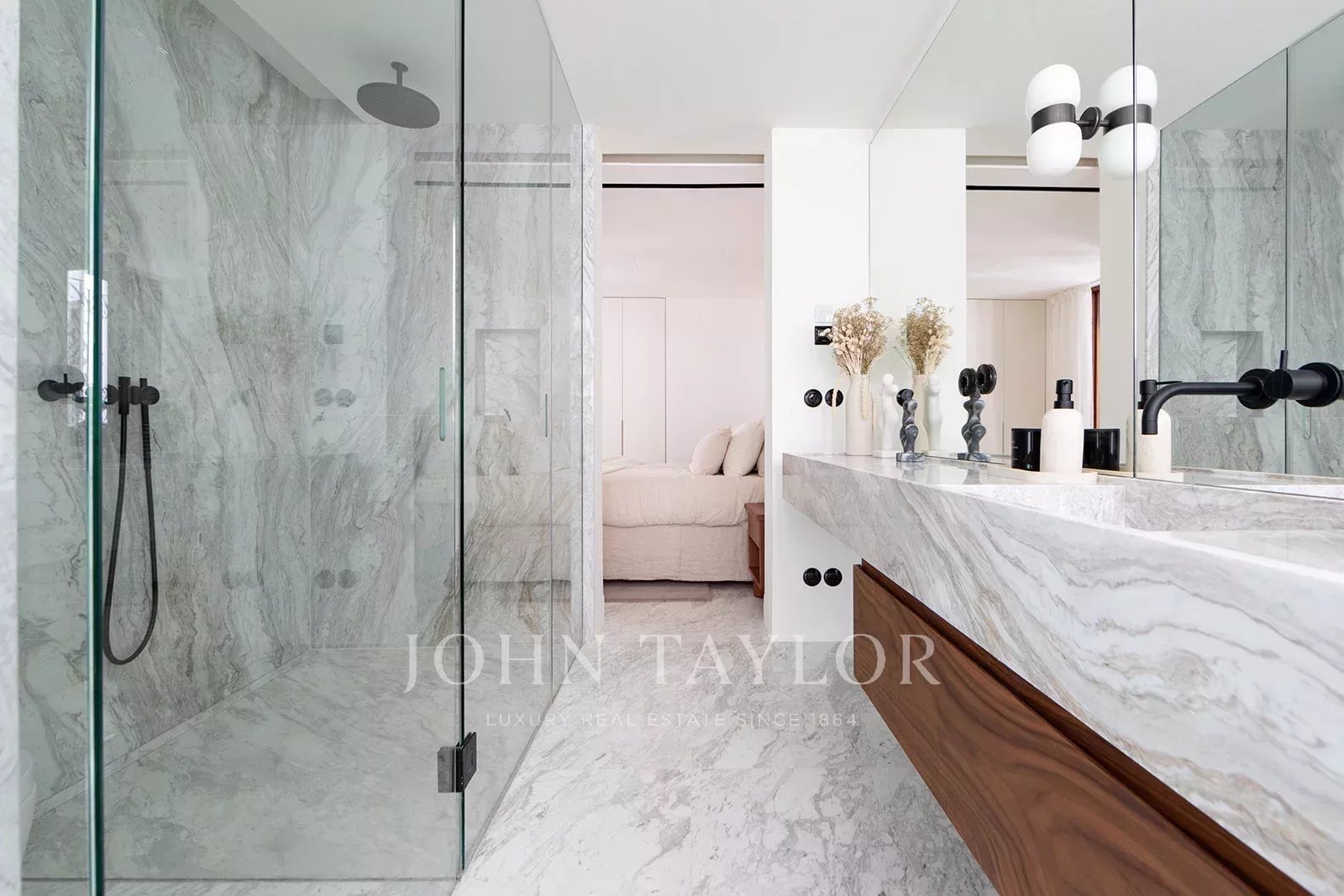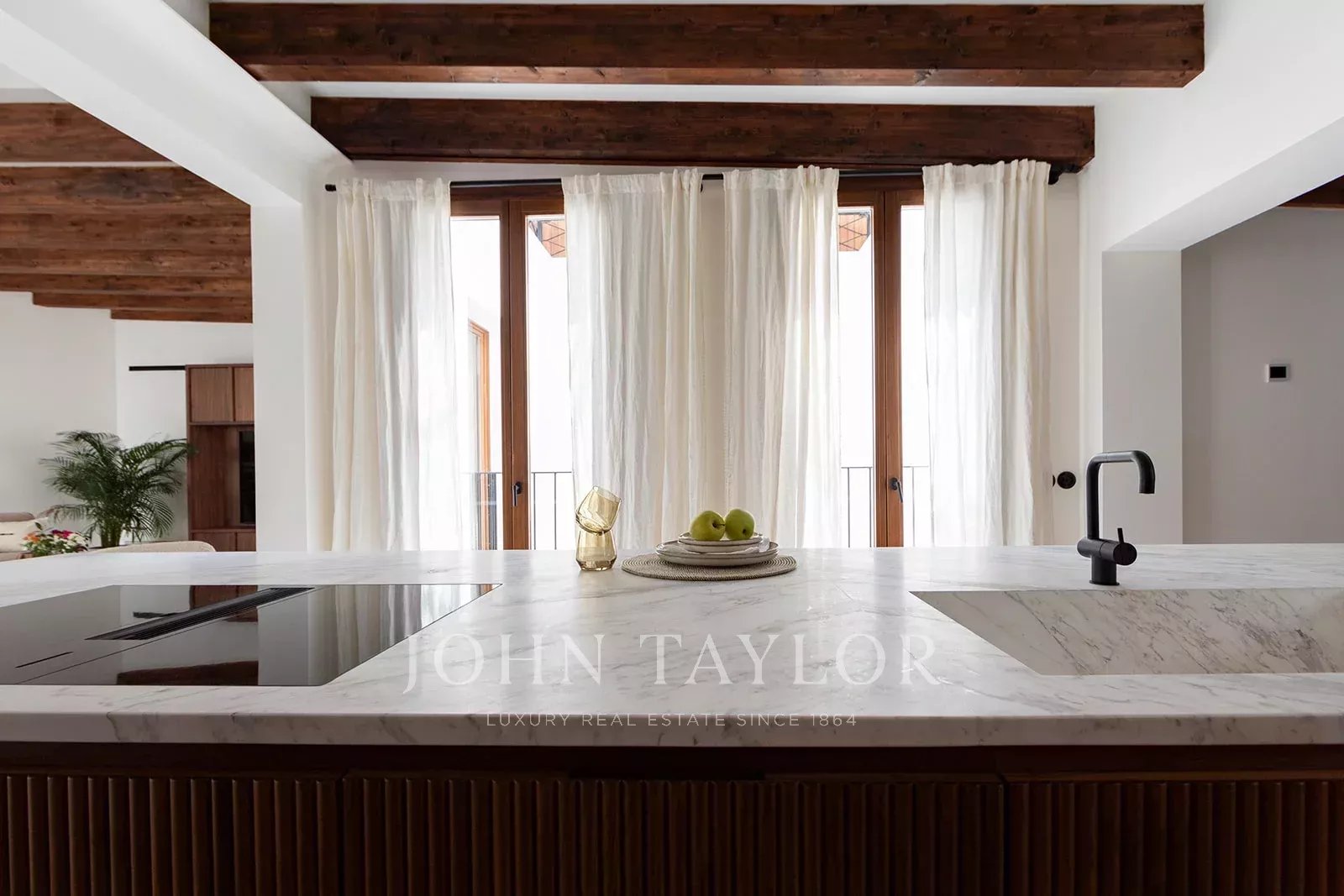 Tento výjimečný mezonet se třemi ložnicemi a třemi koupelnami se nachází v posledních dvou patrech budovy a jeho součástí je senzační střešní terasa s dalekým výhledem na střechy města. Ve spodním patře se v přední části budovy nachází velký, světlem naplněný obývací pokoj se starožitnou dlažbou a odhalenými dřevěnými trámy a dvěma balkony s výhledem do ulice. V zadní části jsou dvě prostorné ložnice s vlastní koupelnou. Hlavní ložnice má okna do centrální terasy, vestavěné skříně a na podlaze je mallorquinská dlažba, zatímco druhá ložnice má prosklené dveře, které propouštějí světlo z terasy. Obě koupelny mají luxusní povrchovou úpravu z mramoru Volakas a ořechového dřeva a jsou vybaveny sprchou a dvojitou toaletou s integrovaným mramorovým umyvadlem. V horní úrovni se nachází otevřený koncept kuchyně, jídelny a obývacího pokoje, který obepíná dvě strany centrální terasy. Okna v celé výšce směřující do dvora a světelná studna v zadní části koupou tento prostor v přirozeném světle. Elegantní kuchyňská linka s povrchovou úpravou z ořechového dřeva, ostrůvkem s mramorovou deskou a integrovaným dřezem je vybavena špičkovými spotřebiči Gaggenau včetně chladničky na víno. Na této úrovni se nachází také velká třetí ložnice se šikmým stropem, vlastní sprchový kout a úložný prostor. Mramorové podlahy Volakas s dřevěným obložením a odhalené dřevěné trámy se táhnou celou touto úrovní a dodávají jí nadčasový, elegantní vzhled. Odtud vedou schody na slunnou terasu o rozloze 76 m2 s nádherným výhledem na kostel Santa Eulalia, katedrálu a hrad Bellver. Tato terasa se rozkládá na různých úrovních a je privilegovaným místem, kde se můžete v zimních dnech vyhřívat na slunci a v létě si užívat teplé noci vysoko nad ruchem města. Objekt je vybaven podlahovým vytápěním a centrální klimatizací.