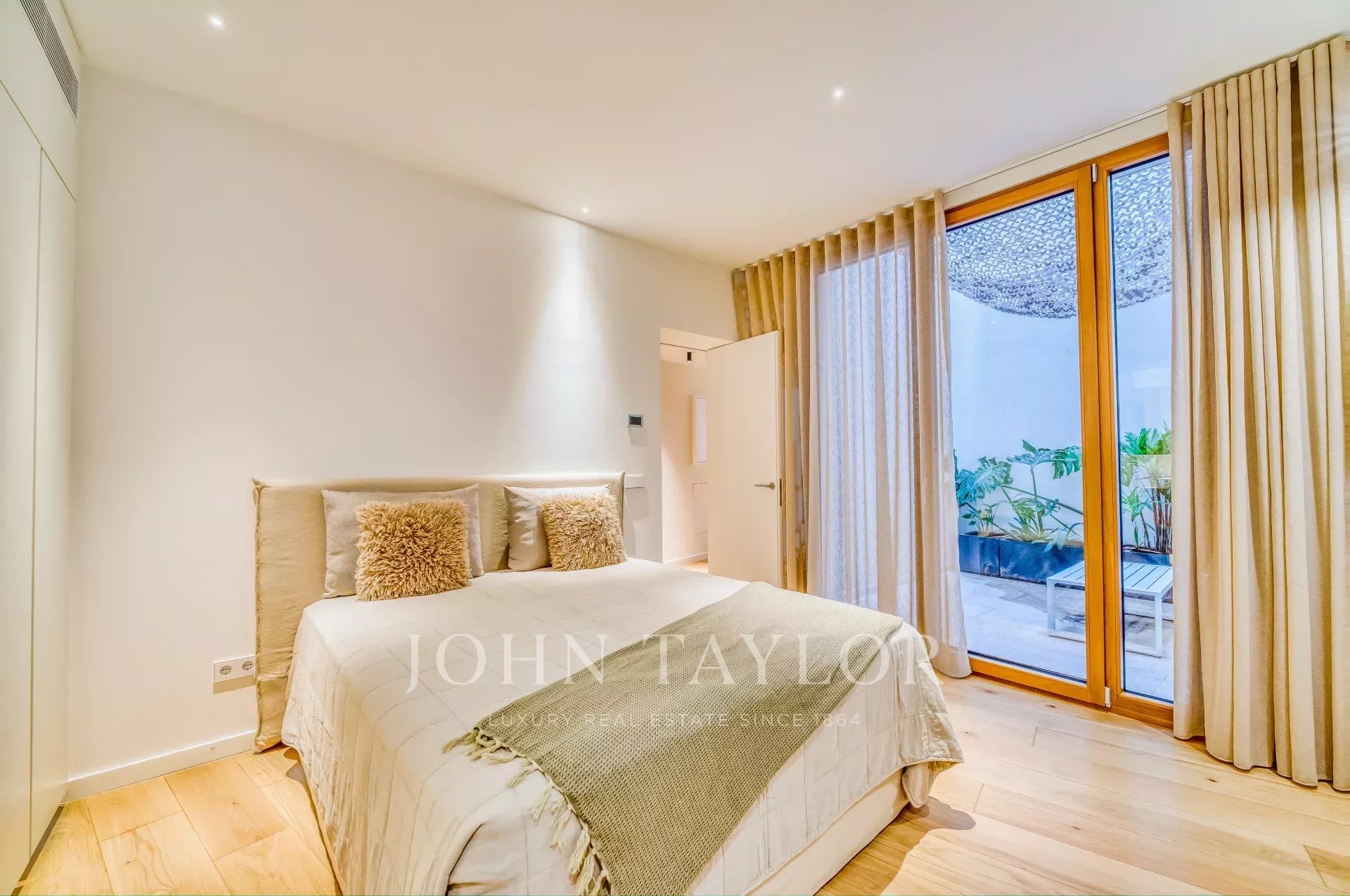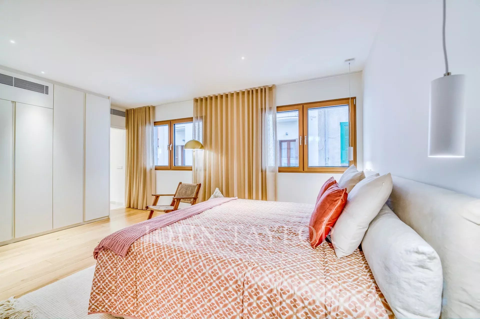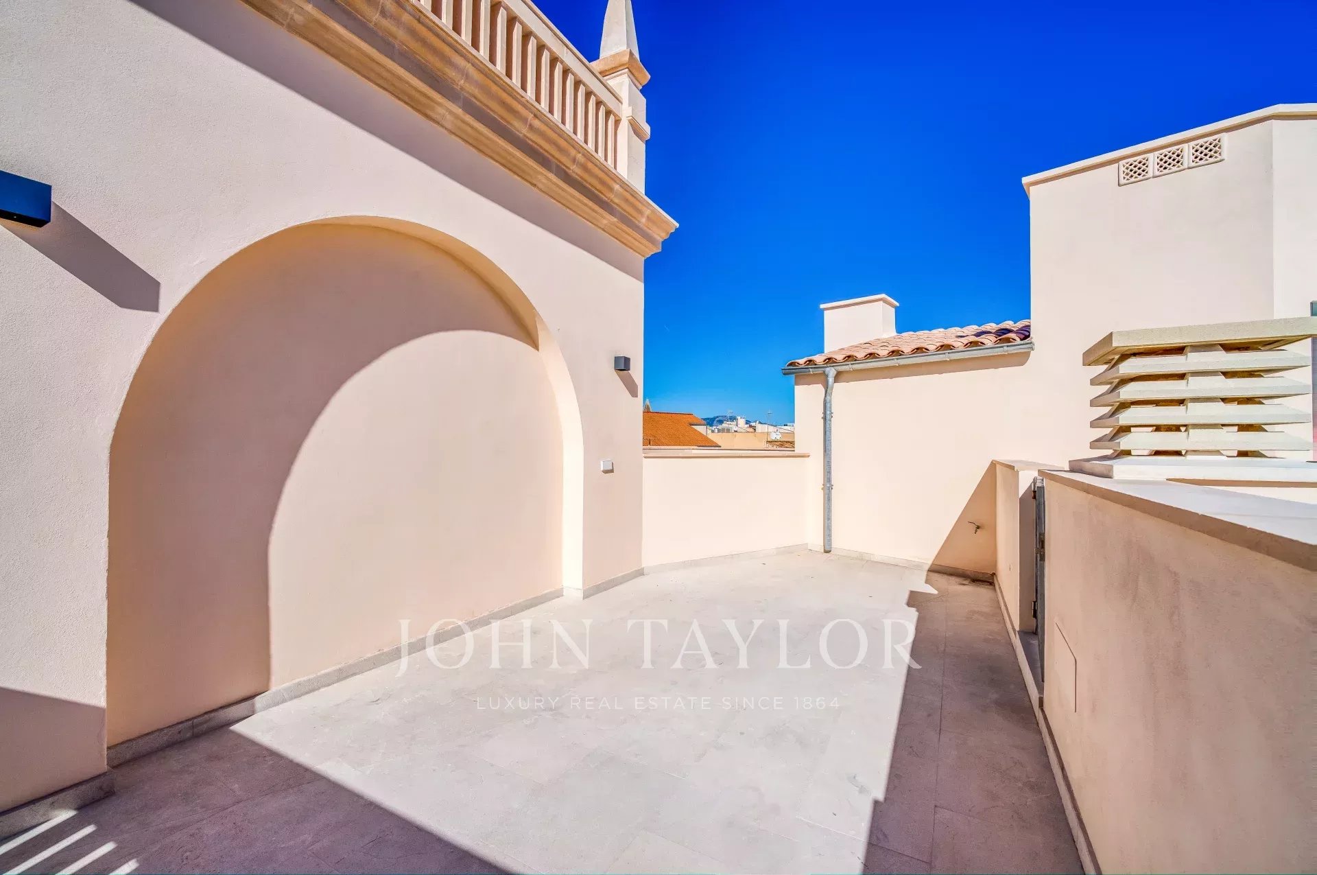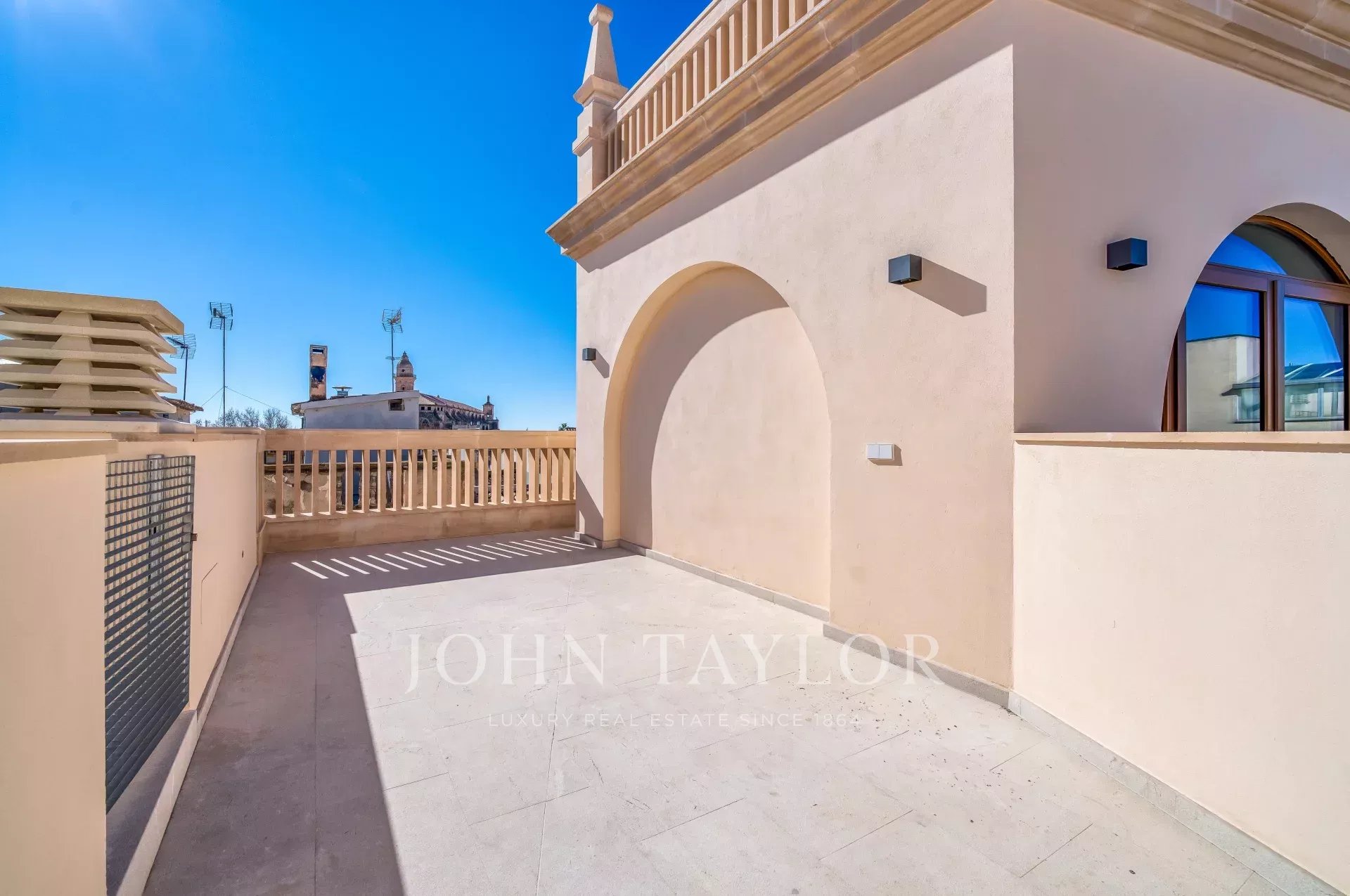 Tento luxusní apartmán se nachází na klidném náměstí Plaza v srdci starého města Palmy a skládá se ze dvou ložnic, tří koupelen (dvě en-suite, jedna koupelna pro hosty), útulné terasy a soukromé střešní terasy. Zatímco vchod nabízí otevřený půdorys kuchyně/jídelny/obývacího prostoru, ložnice vytvářejí klidné soukromí v zadní části bytu a budovy. Velká okna na míru, dřevěné podlahy a teplé tóny v interiéru zajišťují útulné prostředí ve všech místnostech. Skutečným vrcholem nemovitosti je soukromá střešní terasa, na které si můžete užívat slunce nebo se bavit s přáteli. Pro vaše pohodlí je celý byt vybaven podlahovým vytápěním, klimatizací i domácí automatizací a nabízí úložný prostor na vstupním podlaží budovy. V případě potřeby je možné dokoupit garážové stání ve stejné budově.