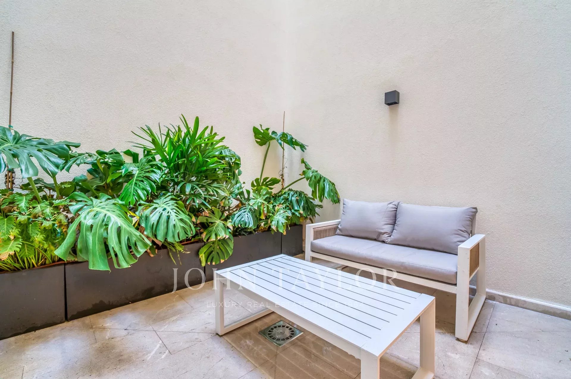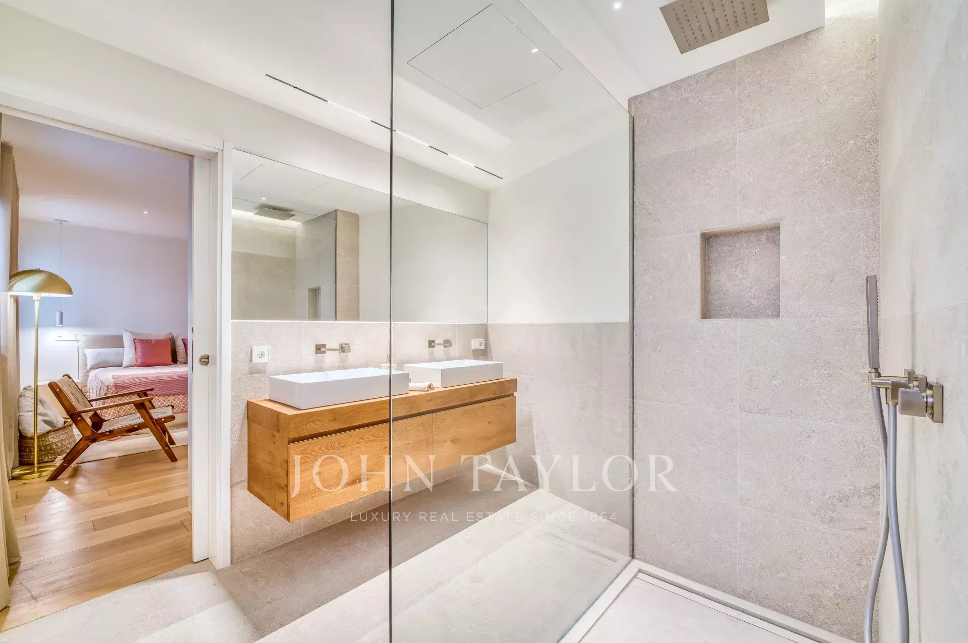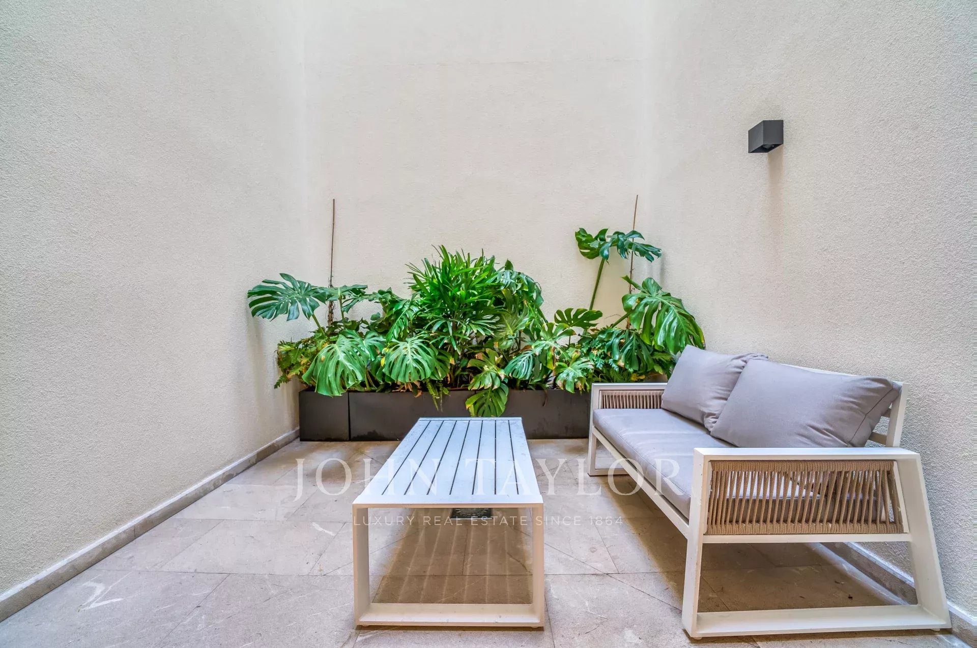 Tento luxusní apartmán se nachází na klidném náměstí Plaza v srdci starého města Palmy a skládá se ze dvou ložnic, tří koupelen (dvě en-suite, jedna koupelna pro hosty), útulné terasy a soukromé střešní terasy. Zatímco vchod nabízí otevřený půdorys kuchyně/jídelny/obývacího prostoru, ložnice vytvářejí klidné soukromí v zadní části bytu a budovy. Velká okna na míru, dřevěné podlahy a teplé tóny v interiéru zajišťují útulné prostředí ve všech místnostech. Skutečným vrcholem nemovitosti je soukromá střešní terasa, na které si můžete užívat slunce nebo se bavit s přáteli. Pro vaše pohodlí je celý byt vybaven podlahovým vytápěním, klimatizací i domácí automatizací a nabízí úložný prostor na vstupním podlaží budovy. V případě potřeby je možné dokoupit garážové stání ve stejné budově.